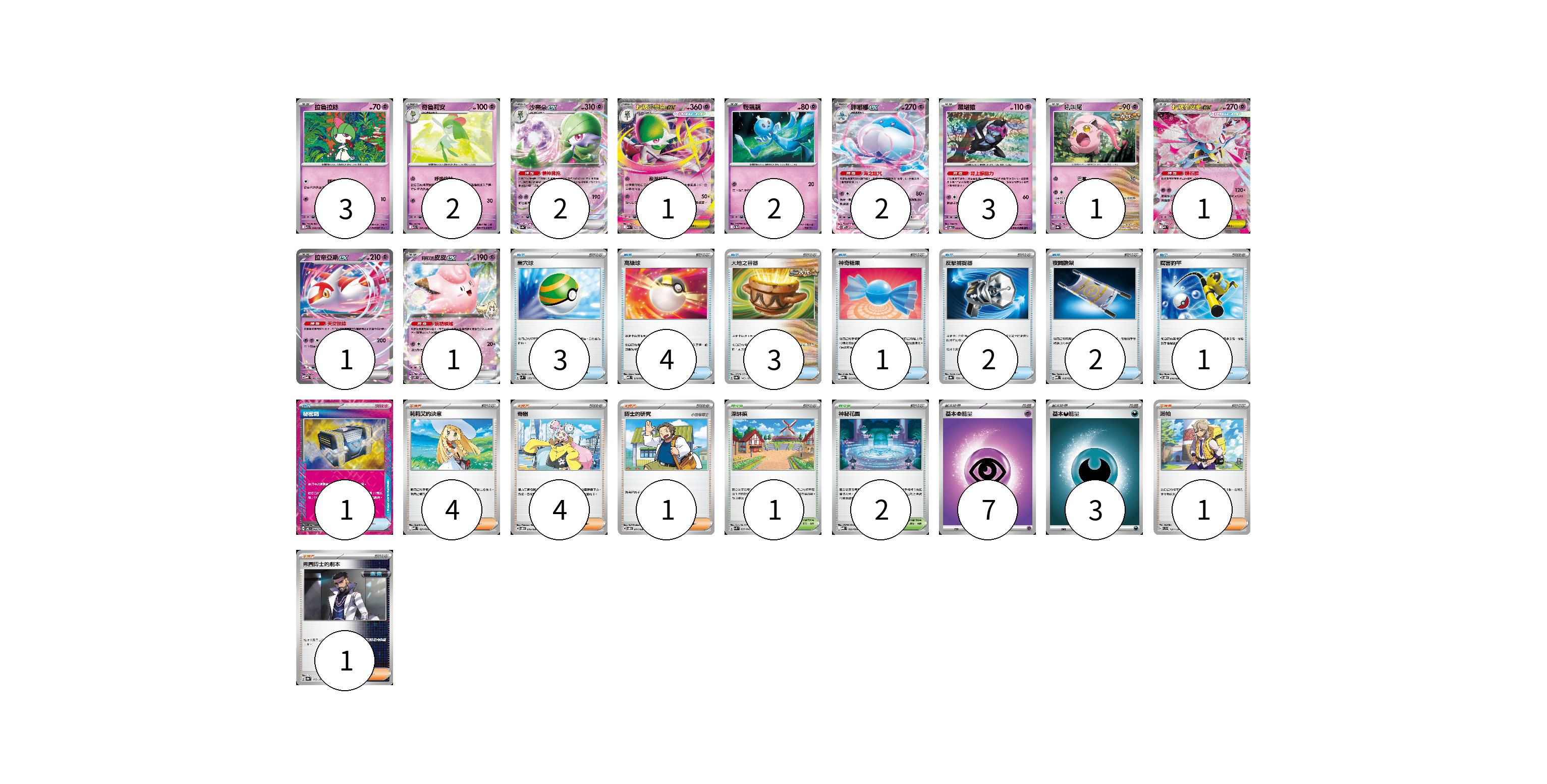 牌組構築方案 以此牌組為基礎新構築牌組 顯示卡面 顯示列表 寶可夢卡(19) 3 2 2 1 2 2 3 1 1 1 1 物品卡(17) 3 4 3 1 2 2 1 1 支援者卡(11) 4 4 1 1 1 競技場卡(3) 1 2 能量卡(10) 7 3 寶可夢卡(19) 卡牌名稱 張數 卡牌名稱 張數 拉魯拉絲 M1S 040/063 03 奇魯莉安 M1S 041/063 02 沙奈朵ex SV4a 082/190 02 超級沙奈朵ex M1S 042/063 01 輕飄飄 SV11W 041/086 02 胖嘟嘟ex SV11W 042/086 02 願增猿 SV6 055/101 03 吼叫尾 SV8a 071/187 01 超級蒂安希ex MBD 006/022 01 拉帝亞斯ex MBD 003/022 01 莉莉艾的皮皮ex SV9 033/100 01 物品卡(17) 卡牌名稱 張數 卡牌名稱 張數 巢穴球 SVM 133/175 03 高級球 MBD 014/022 04 大地之容器 SV8a 143/187 03 神奇糖果 MBG 013/022 01 反擊捕捉器 SV8a 139/187 02 夜間擔架 MBD 016/022 02 厲害釣竿 SVOD 010/020 01 秘密箱 SV6 092/101 01 支援者卡(11) 卡牌名稱 張數 卡牌名稱 張數 莉莉艾的決意 MBD 021/022 04 奇樹 SVOD 016/020 04 博士的研究 SVOD 017/020 01 派帕 SVD 137/139 01 弗圖博士的劇本 SV8a 175/187 01 競技場卡(3) 卡牌名稱 張數 卡牌名稱 張數 深缽鎮 SVK 039/042 01 神秘花園 MBD 022/022 02 能量卡(10) 卡牌名稱 張數 卡牌名稱 張數 基本【超】能量 MBD PSY 07 基本【惡】能量 MBG DAR 03 以此牌組為基礎新構築牌組 牌組編碼 ajajCZ-dQAuUZ-EdbKKS copy 列印牌組單 牌組編碼已複製 分享至SNS