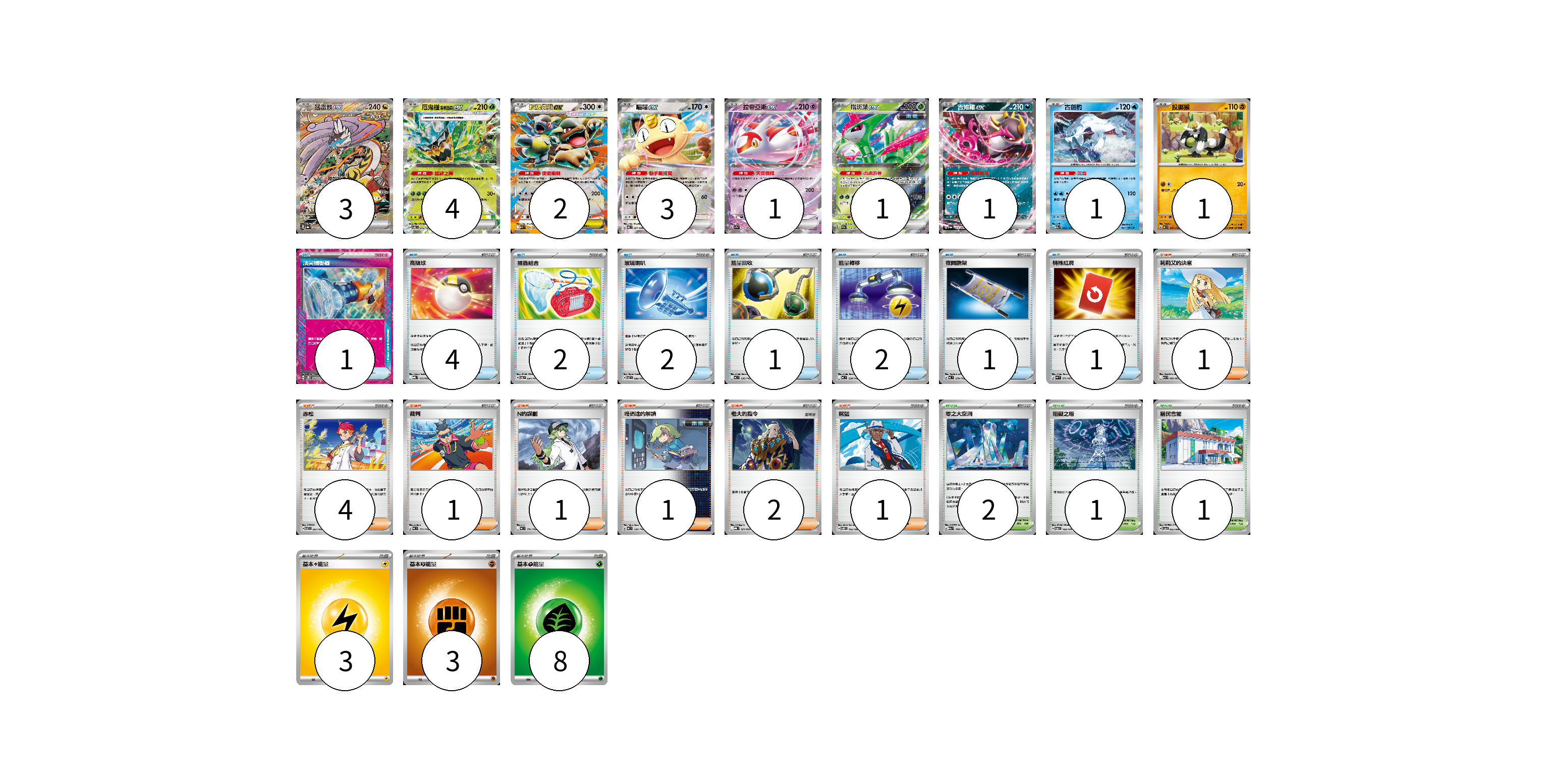 牌組構築方案 以此牌組為基礎新構築牌組 顯示卡面 顯示列表 寶可夢卡(17) 3 4 2 3 1 1 1 1 1 物品卡(14) 1 4 2 2 1 2 1 1 支援者卡(11) 1 4 1 1 1 2 1 競技場卡(4) 2 1 1 能量卡(14) 3 3 8 寶可夢卡(17) 卡牌名稱 張數 卡牌名稱 張數 猛雷鼓ex SV8a 222/187 03 厄鬼椪 碧草面具ex SV6 016/101 04 超級袋獸ex M1S 051/063 02 喵喵ex M3 061/080 03 拉帝亞斯ex SV7a 019/064 01 鐵斑葉ex SV5M 016/071 01 吉雉雞ex SV6a 038/064 01 古劍豹 M2a 043/193 01 投擲猴 MC 407/742 01 物品卡(14) 卡牌名稱 張數 卡牌名稱 張數 頂尖捕捉器 SV5M 062/071 01 高級球 MBG 012/022 04 捕蟲組合 SV6 094/101 02 玻璃喇叭 SV7 089/102 02 能量回收 MC 636/742 01 能量轉移 MC 638/742 02 夜間擔架 MC 670/742 01 特殊紅牌 M4 072/083 01 支援者卡(11) 卡牌名稱 張數 卡牌名稱 張數 莉莉艾的決意 M1L 062/063 01 赤松 SV7 097/102 04 裁判 MC 711/742 01 N的謀劃 MC 701/742 01 暗碼迷的解讀 MC 698/742 01 老大的指令 MBG 021/022 02 席藍 SV8 102/106 01 競技場卡(4) 卡牌名稱 張數 卡牌名稱 張數 零之大空洞 M2a 184/193 02 阻礙之塔 SV6 100/101 01 居民會館 SV5a 065/066 01 能量卡(14) 卡牌名稱 張數 卡牌名稱 張數 基本【雷】能量 MJ LIG 03 基本【鬥】能量 MC FIG 03 基本【草】能量 MJ GRA 08 以此牌組為基礎新構築牌組 牌組編碼 ajoagn-BLitQq-BFUCuJ copy 列印牌組單 牌組編碼已複製 分享至SNS