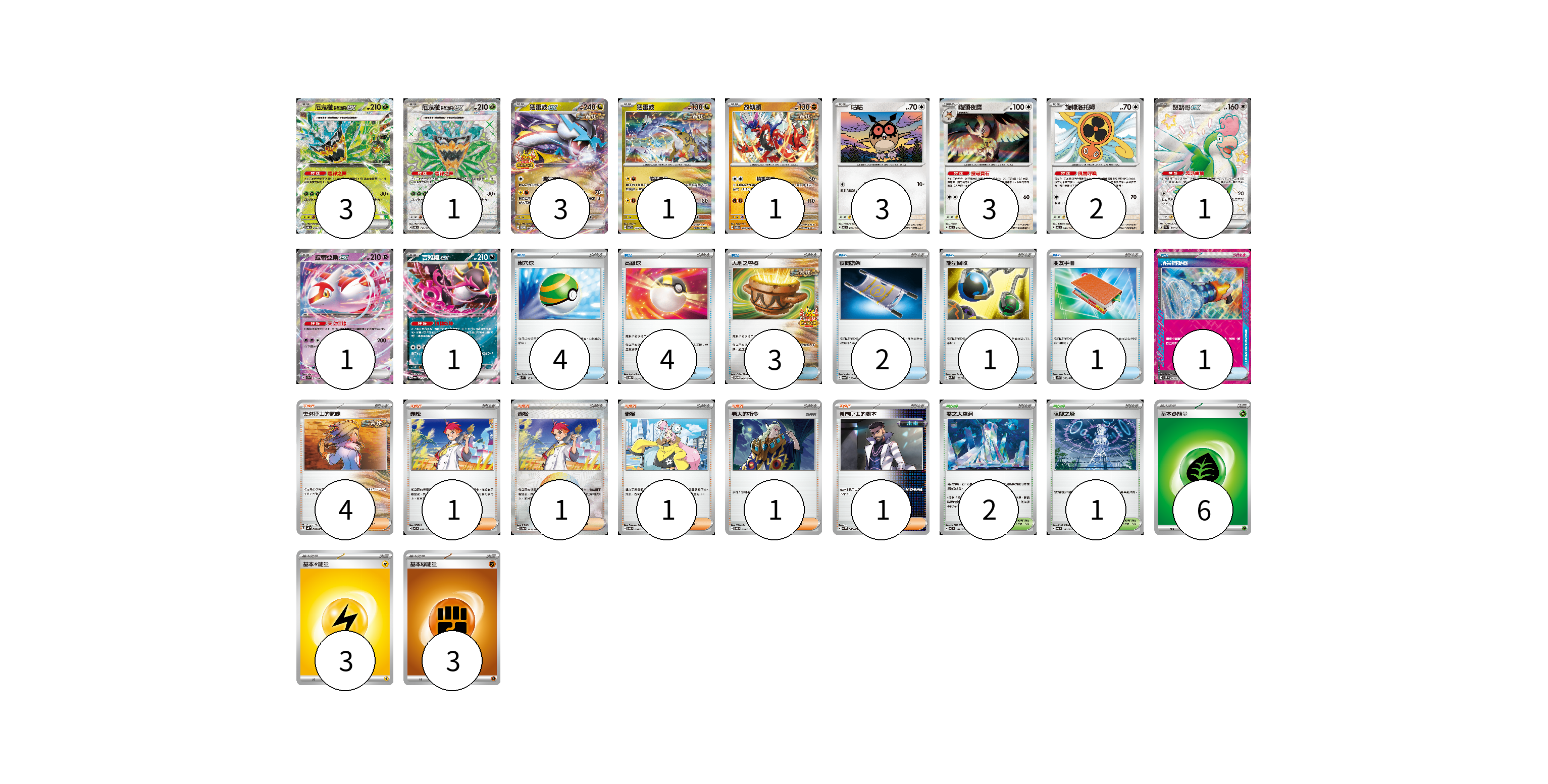 牌組構築方案 以此牌組為基礎新構築牌組 顯示卡面 顯示列表 寶可夢卡(20) 3 1 3 1 1 3 3 2 1 1 1 物品卡(16) 4 4 3 2 1 1 1 支援者卡(9) 4 1 1 1 1 1 競技場卡(3) 2 1 能量卡(12) 6 3 3 寶可夢卡(20) 卡牌名稱 張數 卡牌名稱 張數 厄鬼椪 碧草面具ex SV6 016/101 03 厄鬼椪 碧草面具ex SV6 114/101 01 猛雷鼓ex SV-P 081/SV-P 03 猛雷鼓 SV7 075/102 01 故勒頓 SV8 069/106 01 咕咕 SV7 076/102 03 貓頭夜鷹 SV7 077/102 03 旋轉洛托姆 SV7 080/102 02 怒鸚哥ex SV4a 337/190 01 拉帝亞斯ex SV7a 019/064 01 吉雉雞ex SV6a 038/064 01 物品卡(16) 卡牌名稱 張數 卡牌名稱 張數 巢穴球 SVM 133/175 04 高級球 SVOD 012/020 04 大地之容器 SV-P 084/SV-P 03 夜間擔架 SV6a 056/064 02 能量回收 SVM 125/175 01 朋友手冊 SV1S 069/078 01 頂尖捕捉器 SV5M 062/071 01 支援者卡(9) 卡牌名稱 張數 卡牌名稱 張數 奧琳博士的氣魄 SV4K 064/066 04 赤松 SV7 097/102 01 赤松 SV8a 163/187 01 奇樹 SVOD 016/020 01 老大的指令 SVOD 019/020 01 弗圖博士的劇本 SV4M 065/066 01 競技場卡(3) 卡牌名稱 張數 卡牌名稱 張數 零之大空洞 SV7 102/102 02 阻礙之塔 SV6 100/101 01 能量卡(12) 卡牌名稱 張數 卡牌名稱 張數 基本【草】能量 SVTM GRA 06 基本【雷】能量 SVTR LIG 03 基本【鬥】能量 SVTG FIG 03 以此牌組為基礎新構築牌組 牌組編碼 akzBdr-FGIMZV-rMxItV copy 列印牌組單 牌組編碼已複製 分享至SNS