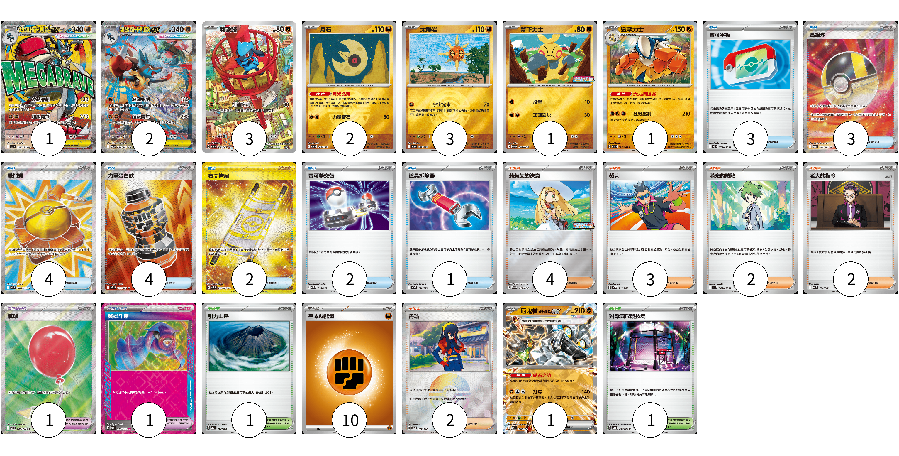 牌組構築方案 以此牌組為基礎新構築牌組 顯示卡面 顯示列表 寶可夢卡(14) 1 2 3 2 3 1 1 1 寶可夢道具(2) 1 1 物品卡(19) 3 3 4 4 2 2 1 支援者卡(13) 4 3 2 2 2 競技場卡(2) 1 1 能量卡(10) 10 寶可夢卡(14) 卡牌名稱 張數 卡牌名稱 張數 超級路卡利歐ex M2a 228/193 01 超級路卡利歐ex M1L 088/063 02 利歐路 M1L 068/063 03 月石 M2a 086/193 02 太陽岩 M2a 087/193 03 幕下力士 M-P 007/M-P 01 鐵掌力士 M1L 025/063 01 厄鬼椪 礎石面具ex MC 428/742 01 寶可夢道具(2) 卡牌名稱 張數 卡牌名稱 張數 氣球 M1L 084/063 01 英雄斗篷 SV5M 064/071 01 物品卡(19) 卡牌名稱 張數 卡牌名稱 張數 寶可平板 M3 070/080 03 高級球 M2a 216/193 03 戰鬥鑼 M1L 082/063 04 力量蛋白飲 M1L 081/063 04 夜間擔架 SV8 137/106 02 寶可夢交替 MBG 015/022 02 道具拆除器 M2a 151/193 01 支援者卡(13) 卡牌名稱 張數 卡牌名稱 張數 莉莉艾的決意 M-P 011/M-P 04 裁判 MC 711/742 03 滿充的體貼 M1S 060/063 02 老大的指令 MC 724/742 02 丹瑜 SV8a 170/187 02 競技場卡(2) 卡牌名稱 張數 卡牌名稱 張數 引力山岳 M2a 183/193 01 對戰圓形競技場 M2 079/080 01 能量卡(10) 卡牌名稱 張數 卡牌名稱 張數 基本【鬥】能量 MC FIG 10 以此牌組為基礎新構築牌組 牌組編碼 alDhVS-kgKRET-bqLqKw copy 列印牌組單 牌組編碼已複製 分享至SNS