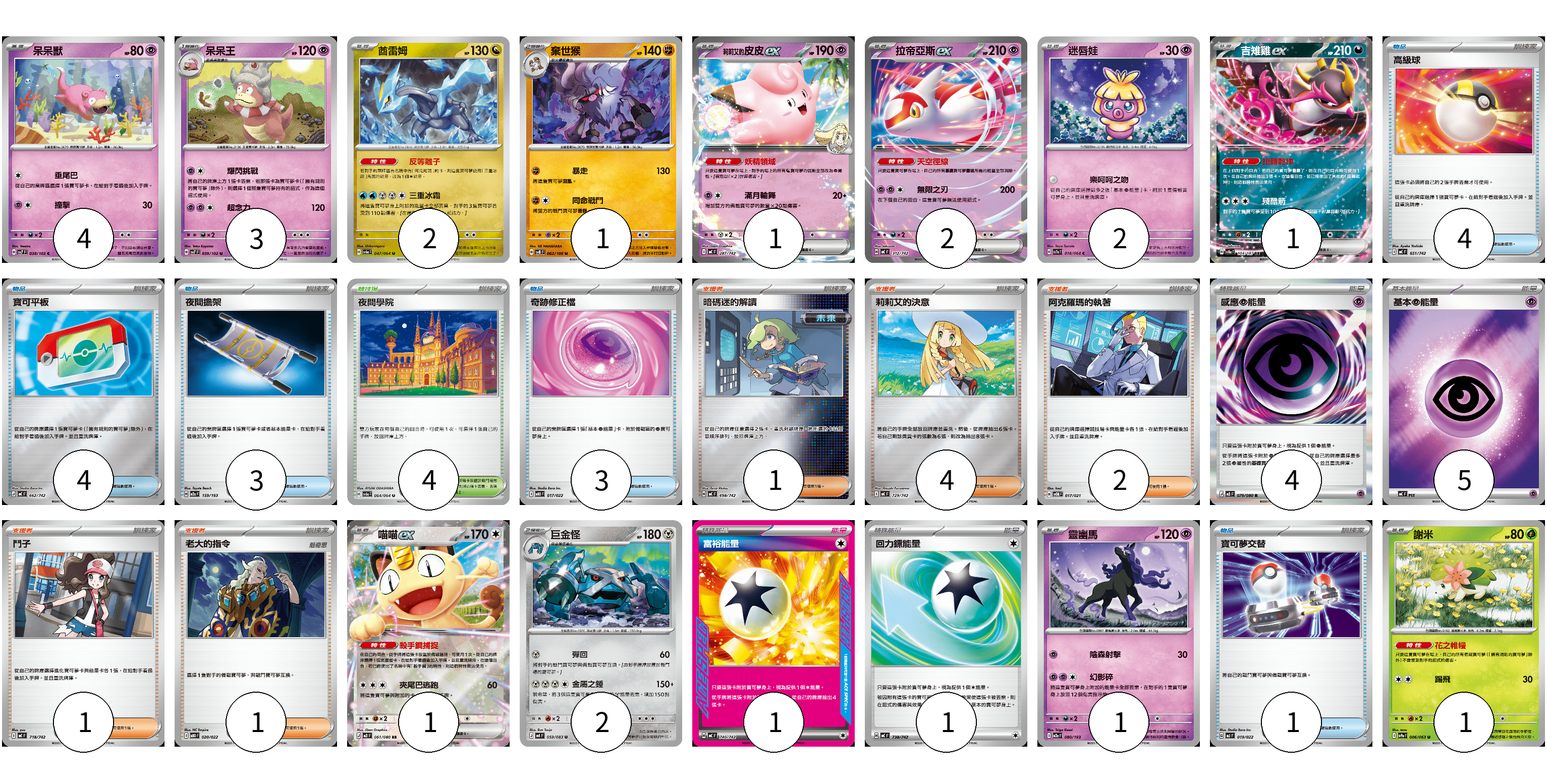 牌組構築方案 以此牌組為基礎新構築牌組 顯示卡面 顯示列表 寶可夢卡(21) 4 3 2 1 1 2 2 1 1 2 1 1 物品卡(15) 4 4 3 3 1 支援者卡(9) 1 4 2 1 1 競技場卡(4) 4 能量卡(11) 4 5 1 1 寶可夢卡(21) 卡牌名稱 張數 卡牌名稱 張數 呆呆獸 SV7 038/102 04 呆呆王 SV7 039/102 03 酋雷姆 SV6a 047/064 02 棄世猴 SV8 062/106 01 <莉莉艾的>皮皮ex MC 287/742 01 拉帝亞斯ex MC 312/742 02 迷唇娃 SV7a 018/064 02 吉雉雞ex SV8a 104/187 01 喵喵ex M3 061/080 01 巨金怪 M4 059/083 02 靈幽馬 M2a 080/193 01 謝米 SV9a 006/063 01 物品卡(15) 卡牌名稱 張數 卡牌名稱 張數 高級球 MC 651/742 04 寶可平板 MC 662/742 04 夜間擔架 M2a 159/193 03 奇跡修正檔 MBD 017/022 03 寶可夢交替 MJ 019/022 01 支援者卡(9) 卡牌名稱 張數 卡牌名稱 張數 暗碼迷的解讀 MC 698/742 01 莉莉艾的決意 MC 729/742 04 阿克羅瑪的執著 SVOM 017/021 02 鬥子 MC 718/742 01 老大的指令 MBD 020/022 01 競技場卡(4) 卡牌名稱 張數 卡牌名稱 張數 夜間學院 SV6a 064/064 04 能量卡(11) 卡牌名稱 張數 卡牌名稱 張數 感應【超】能量 M3 079/080 04 基本【超】能量 MC PSY 05 富裕能量 MC 740/742 01 回力鏢能量 MC 738/742 01 以此牌組為基礎新構築牌組 牌組編碼 alPzBT-RTSEvy-tptbEX copy 列印牌組單 牌組編碼已複製 分享至SNS