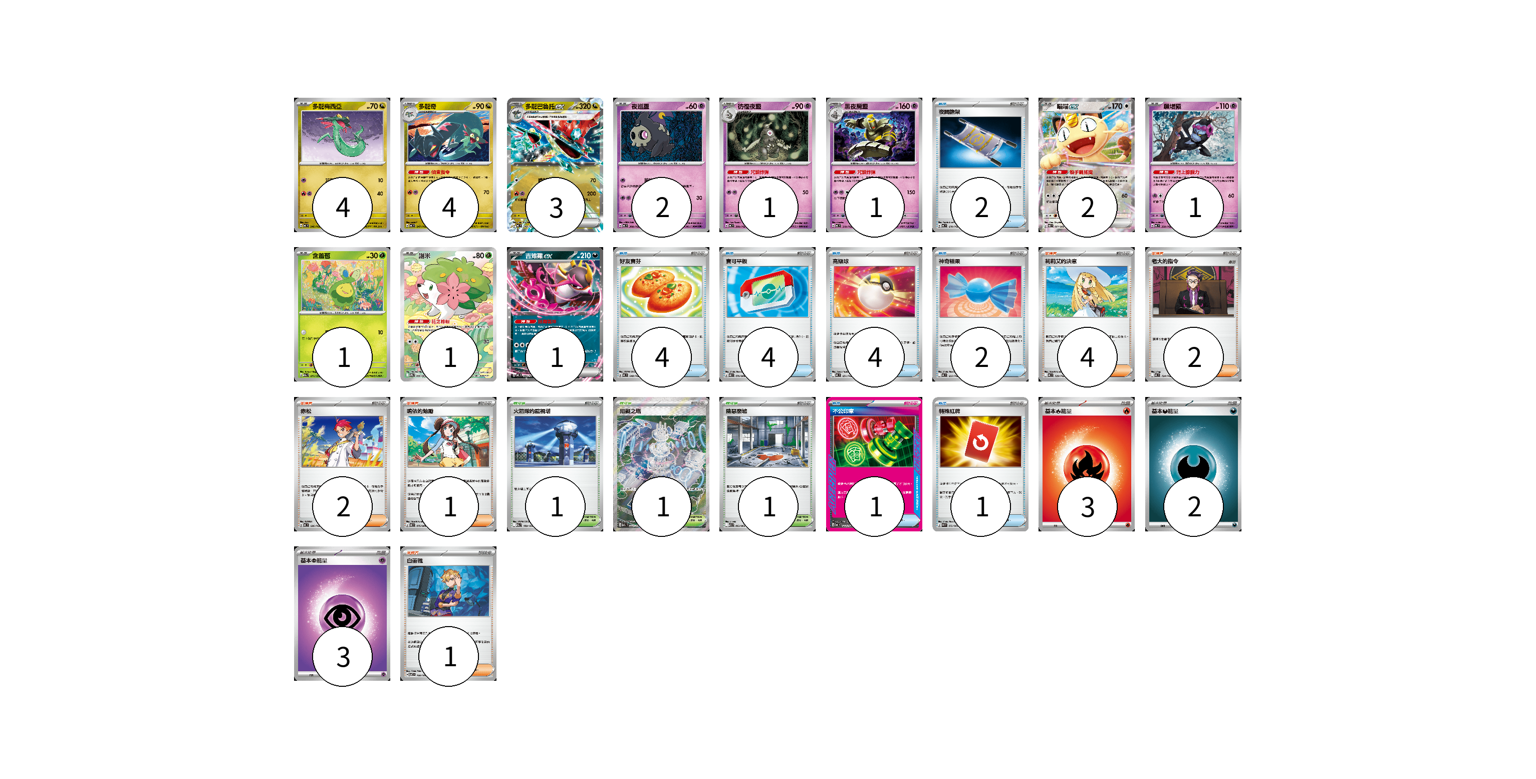 牌組構築方案 以此牌組為基礎新構築牌組 顯示卡面 顯示列表 寶可夢卡(21) 4 4 3 2 1 1 2 1 1 1 1 物品卡(18) 2 4 4 4 2 1 1 支援者卡(10) 4 2 2 1 1 競技場卡(3) 1 1 1 能量卡(8) 3 2 3 寶可夢卡(21) 卡牌名稱 張數 卡牌名稱 張數 多龍梅西亞 MC 546/742 04 多龍奇 MC 547/742 04 多龍巴魯托ex MC 548/742 03 夜巡靈 MC 308/742 02 彷徨夜靈 MC 309/742 01 黑夜魔靈 MC 310/742 01 喵喵ex M3 061/080 02 願增猿 MC 358/742 01 含羞苞 M2a 011/193 01 謝米 SV9a 066/063 01 吉雉雞ex MC 489/742 01 物品卡(18) 卡牌名稱 張數 卡牌名稱 張數 夜間擔架 MC 670/742 02 好友寶芬 MC 648/742 04 寶可平板 M3 070/080 04 高級球 MC 651/742 04 神奇糖果 MC 655/742 02 不公印章 MC 633/742 01 特殊紅牌 M4 072/083 01 支援者卡(10) 卡牌名稱 張數 卡牌名稱 張數 莉莉艾的決意 MC 729/742 04 老大的指令 MC 724/742 02 赤松 MC 696/742 02 鳴依的勉勵 M3 075/080 01 白蕾雅 SV7 100/102 01 競技場卡(3) 卡牌名稱 張數 卡牌名稱 張數 火箭隊的監視塔 M2a 189/193 01 阻礙之塔 M2a 222/193 01 險惡廢墟 M1L 063/063 01 能量卡(8) 卡牌名稱 張數 卡牌名稱 張數 基本【火】能量 MC FIR 03 基本【惡】能量 MC DAR 02 基本【超】能量 MC PSY 03 以此牌組為基礎新構築牌組 牌組編碼 ameENY-ZQJCqC-uicCvQ copy 列印牌組單 牌組編碼已複製 分享至SNS
