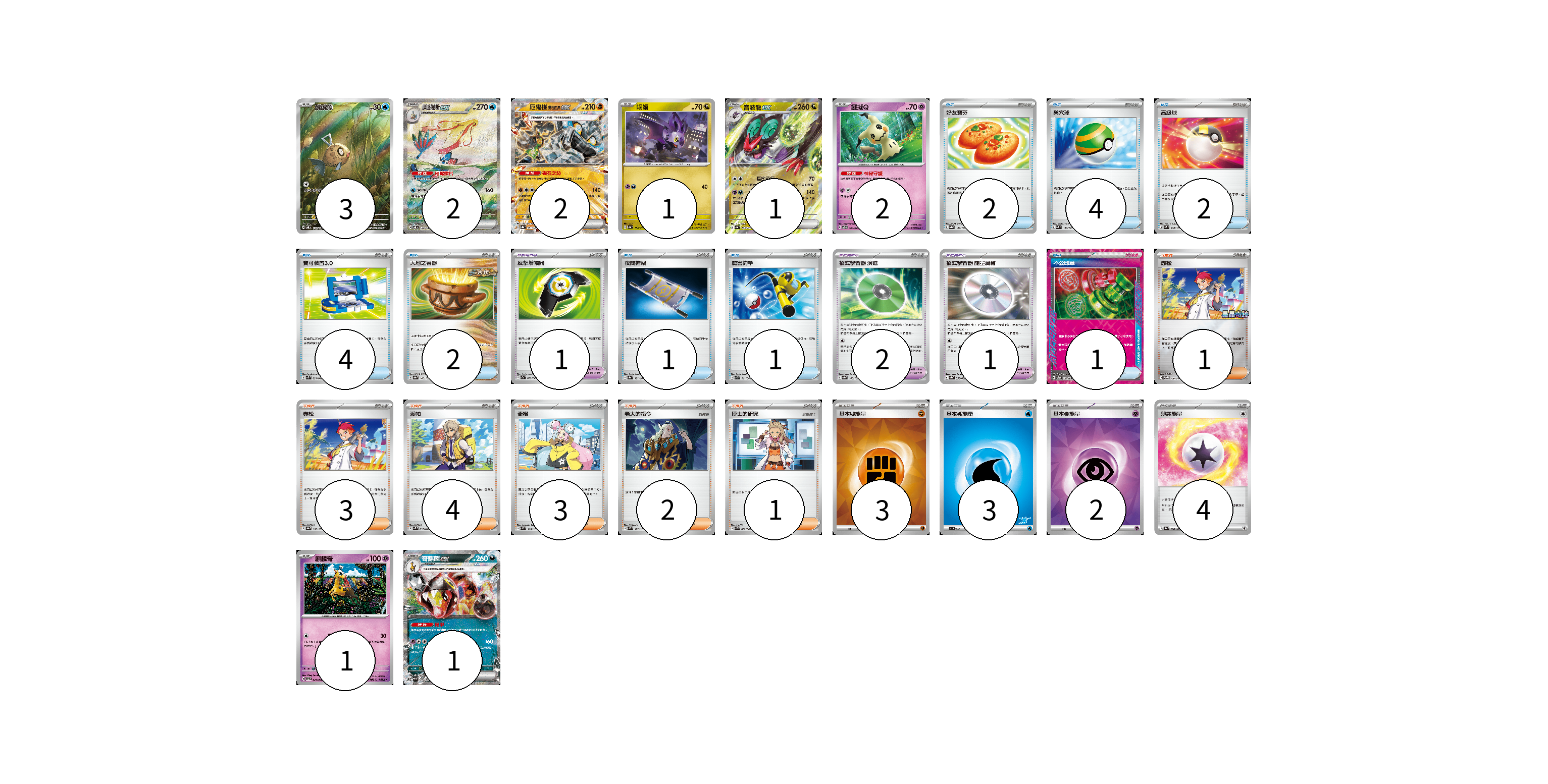 牌組構築方案 以此牌組為基礎新構築牌組 顯示卡面 顯示列表 寶可夢卡(13) 3 2 2 1 1 2 1 1 寶可夢道具(4) 1 2 1 物品卡(17) 2 4 2 4 2 1 1 1 支援者卡(14) 1 3 4 3 2 1 能量卡(12) 3 3 2 4 寶可夢卡(13) 卡牌名稱 張數 卡牌名稱 張數 醜醜魚 SV8 110/106 03 美納斯ex SV8 131/106 02 厄鬼椪 礎石面具ex SV8a 091/187 02 嗡蝠 SV4a 134/190 01 音波龍ex SV4a 135/190 01 謎擬Q SVTS 006/022 02 麒麟奇 SV5a 034/066 01 奇麒麟ex SV5M 042/071 01 寶可夢道具(4) 卡牌名稱 張數 卡牌名稱 張數 反擊增幅器 SV7a 059/064 01 招式學習器 演進 SV8a 160/187 02 招式學習器 能量渦輪 SV3a 056/062 01 物品卡(17) 卡牌名稱 張數 卡牌名稱 張數 好友寶芬 SV8a 147/187 02 巢穴球 SVM 133/175 04 高級球 SVM 134/175 02 寶可裝置3.0 SVK 021/042 04 大地之容器 SV8a 143/187 02 夜間擔架 SV8a 151/187 01 厲害釣竿 SVK 011/042 01 不公印章 SV5a 053/066 01 支援者卡(14) 卡牌名稱 張數 卡牌名稱 張數 赤松 SV-P 150/SV-P 01 赤松 SV8a 163/187 03 派帕 SVK 035/042 04 奇樹 SVM 160/175 03 老大的指令 SVM 172/175 02 博士的研究 SVK 032/042 01 能量卡(12) 卡牌名稱 張數 卡牌名稱 張數 基本【鬥】能量 SVK FIG 03 基本【水】能量 SVI WAT 03 基本【超】能量 SVK PSY 02 薄霧能量 SV8a 186/187 04 以此牌組為基礎新構築牌組 牌組編碼 anIsbJ-FfjQvX-mCkdEH copy 列印牌組單 牌組編碼已複製 分享至SNS