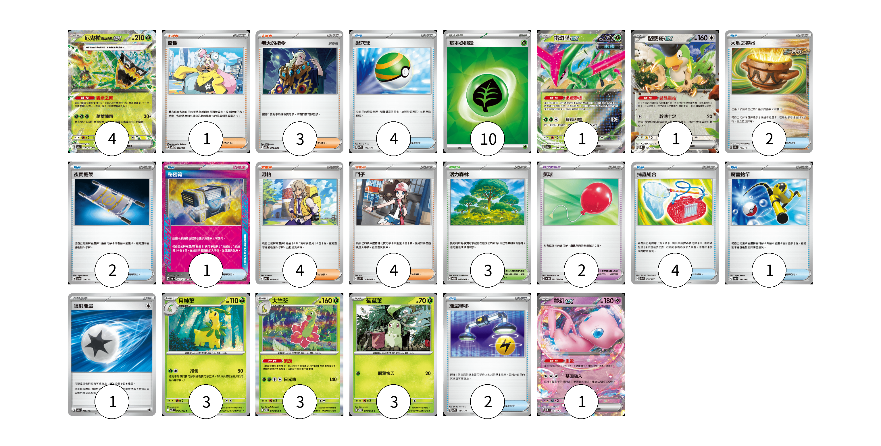 牌組構築方案 以此牌組為基礎新構築牌組 顯示卡面 顯示列表 寶可夢卡(16) 4 1 1 3 3 3 1 寶可夢道具(2) 2 物品卡(16) 4 2 2 1 4 1 2 支援者卡(12) 1 3 4 4 競技場卡(3) 3 能量卡(11) 10 1 寶可夢卡(16) 卡牌名稱 張數 卡牌名稱 張數 厄鬼椪 碧草面具ex SV8a 020/187 04 鐵斑葉ex SV8a 016/187 01 怒鸚哥ex SVK 006/042 01 月桂葉 M1S 004/063 03 大竺葵 M1S 005/063 03 菊草葉 M1S 003/063 03 夢幻ex SVK 001/042 01 寶可夢道具(2) 卡牌名稱 張數 卡牌名稱 張數 氣球 SV11B 082/086 02 物品卡(16) 卡牌名稱 張數 卡牌名稱 張數 巢穴球 SVM 133/175 04 大地之容器 SV8a 143/187 02 夜間擔架 SVOM 016/021 02 秘密箱 SV6 092/101 01 捕蟲組合 SV8a 150/187 04 厲害釣竿 SVOD 010/020 01 能量轉移 SVM 127/175 02 支援者卡(12) 卡牌名稱 張數 卡牌名稱 張數 奇樹 SVOD 016/020 01 老大的指令 SVOD 019/020 03 派帕 SVOD 018/020 04 鬥子 SV11W 085/086 04 競技場卡(3) 卡牌名稱 張數 卡牌名稱 張數 活力森林 M1S 061/063 03 能量卡(11) 卡牌名稱 張數 卡牌名稱 張數 基本【草】能量 SVK GRA 10 噴射能量 SV8a 185/187 01 以此牌組為基礎新構築牌組 牌組編碼 anJrGe-pgqBWM-MYtaCr copy 列印牌組單 牌組編碼已複製 分享至SNS