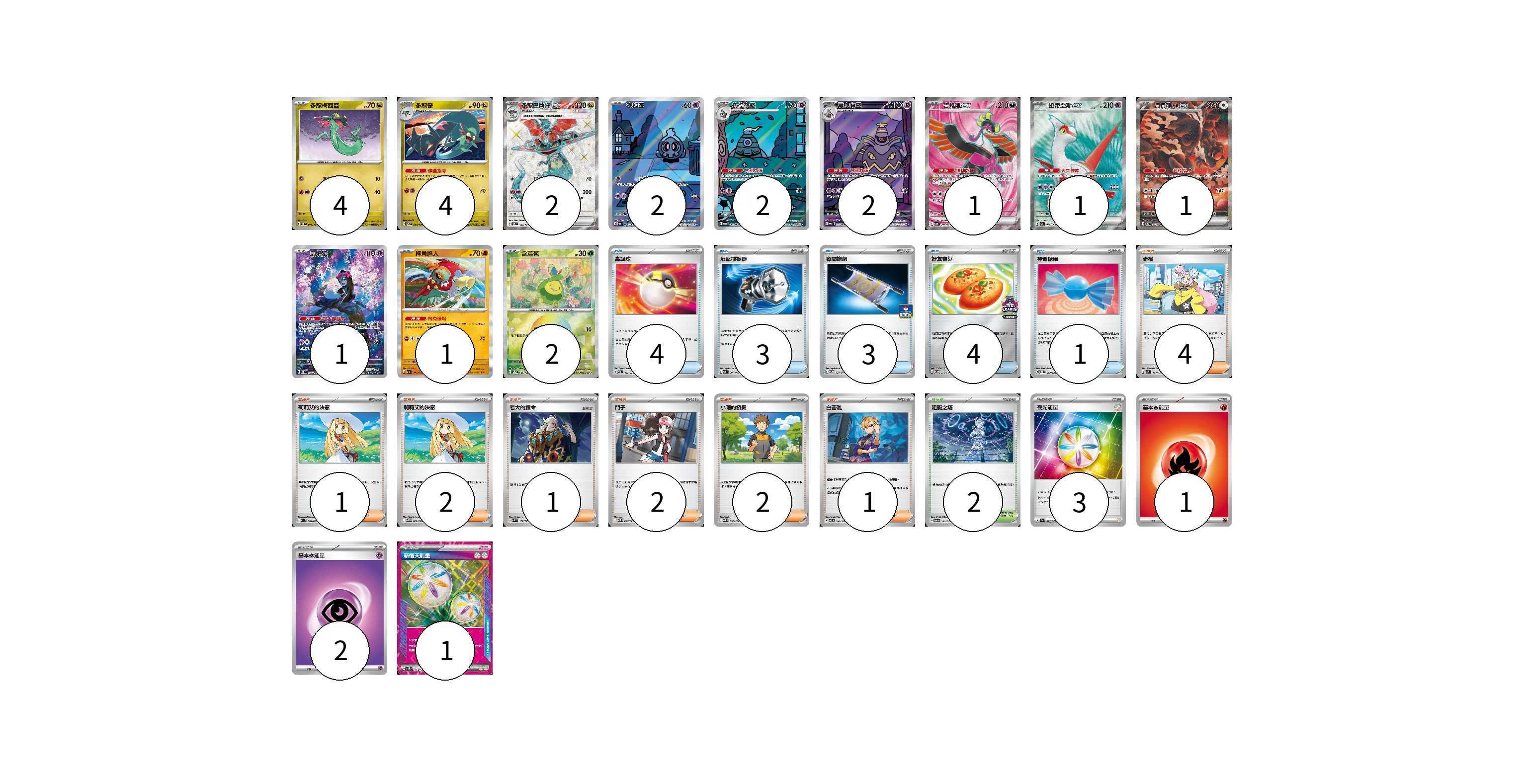 牌組構築方案 以此牌組為基礎新構築牌組 顯示卡面 顯示列表 寶可夢卡(23) 4 4 2 2 2 2 1 1 1 1 1 2 物品卡(15) 4 3 3 4 1 支援者卡(13) 4 1 2 1 2 2 1 競技場卡(2) 2 能量卡(7) 3 1 2 1 寶可夢卡(23) 卡牌名稱 張數 卡牌名稱 張數 多龍梅西亞 SV6 079/101 04 多龍奇 SV6 080/101 04 多龍巴魯托ex SV6 120/101 02 夜巡靈 SV6a 068/064 02 彷徨夜靈 SV6a 069/064 02 黑夜魔靈 SV6a 070/064 02 吉雉雞ex SV6a 081/064 01 拉帝亞斯ex SV7a 078/064 01 月月熊 赫月ex SV8a 225/187 01 願增猿 SV6 107/101 01 摔角鷹人 SV1S 045/078 01 含羞苞 SV8a 001/187 02 物品卡(15) 卡牌名稱 張數 卡牌名稱 張數 高級球 SVEM 013/020 04 反擊捕捉器 SVK 009/042 03 夜間擔架 SV-P 227/SV-P 03 好友寶芬 SV-P 230/SV-P 04 神奇糖果 SVOD 013/020 01 支援者卡(13) 卡牌名稱 張數 卡牌名稱 張數 奇樹 SVM 160/175 04 莉莉艾的決意 M1L 062/063 01 莉莉艾的決意 M1L 062/063 02 老大的指令 SVM 172/175 01 鬥子 SV11W 085/086 02 小剛的發掘 SV9 096/100 02 白蕾雅 SV7 100/102 01 競技場卡(2) 卡牌名稱 張數 卡牌名稱 張數 阻礙之塔 SV6 100/101 02 能量卡(7) 卡牌名稱 張數 卡牌名稱 張數 夜光能量 SV1a 073/073 03 基本火能量 sv-p FIR 01 基本超能量 sv-p PSY 02 新衝天能量 SV5K 071/071 01 以此牌組為基礎新構築牌組 牌組編碼 anWYUy-mBcVGt-ySWBUd copy 列印牌組單 牌組編碼已複製 分享至SNS