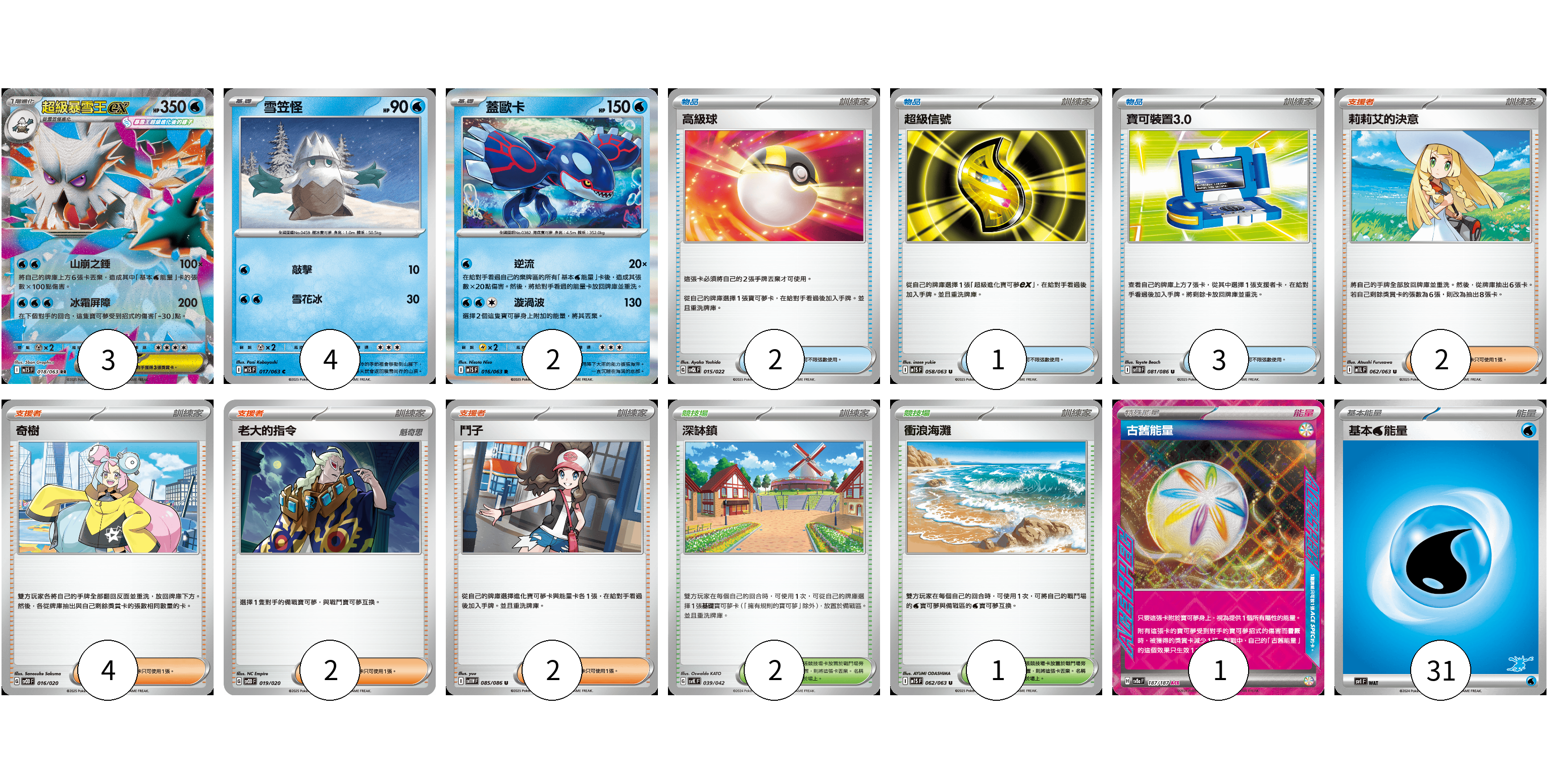 牌組構築方案 以此牌組為基礎新構築牌組 顯示卡面 顯示列表 寶可夢卡(9) 3 4 2 物品卡(6) 2 1 3 支援者卡(10) 2 4 2 2 競技場卡(3) 2 1 能量卡(32) 1 31 寶可夢卡(9) 卡牌名稱 張數 卡牌名稱 張數 超級暴雪王ex M1S 018/063 03 雪笠怪 M1S 017/063 04 蓋歐卡 M1S 016/063 02 物品卡(6) 卡牌名稱 張數 卡牌名稱 張數 高級球 SVQL 015/022 02 超級信號 M1S 058/063 01 寶可裝置3.0 SV11B 081/086 03 支援者卡(10) 卡牌名稱 張數 卡牌名稱 張數 莉莉艾的決意 M1L 062/063 02 奇樹 SVOD 016/020 04 老大的指令 SVOD 019/020 02 鬥子 SV11W 085/086 02 競技場卡(3) 卡牌名稱 張數 卡牌名稱 張數 深缽鎮 SVK 039/042 02 衝浪海灘 M1S 062/063 01 能量卡(32) 卡牌名稱 張數 卡牌名稱 張數 古舊能量 SV8a 187/187 01 基本【水】能量 SVI WAT 31 以此牌組為基礎新構築牌組 牌組編碼 aoTEUN-Eopfxi-PuaVkY copy 列印牌組單 牌組編碼已複製 分享至SNS