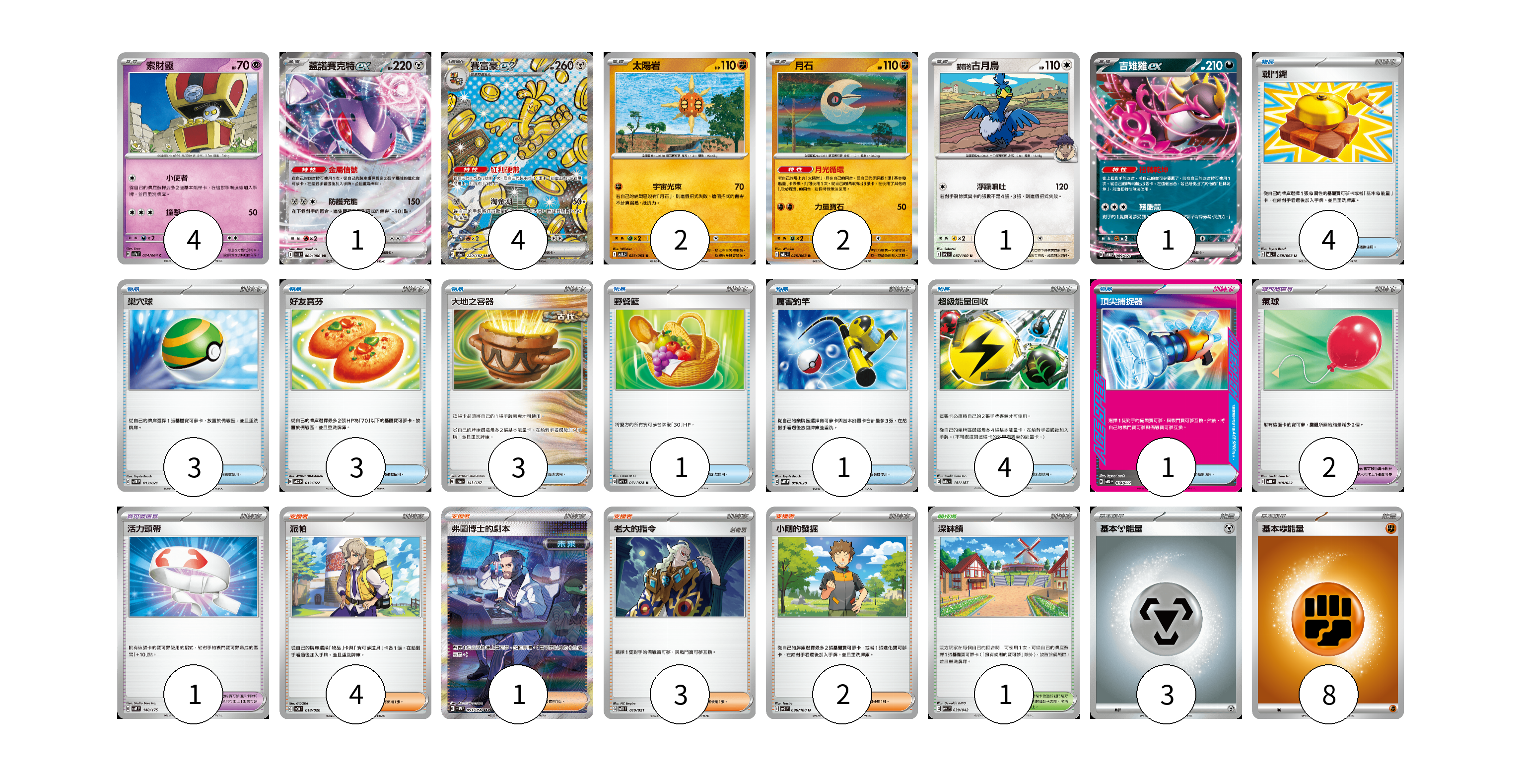 牌組構築方案 以此牌組為基礎新構築牌組 顯示卡面 顯示列表 寶可夢卡(15) 4 1 4 2 2 1 1 寶可夢道具(3) 2 1 物品卡(20) 4 3 3 3 1 1 4 1 支援者卡(10) 4 1 3 2 競技場卡(1) 1 能量卡(11) 3 8 寶可夢卡(15) 卡牌名稱 張數 卡牌名稱 張數 索財靈 SV7a 024/064 04 蓋諾賽克特ex SV11B 069/086 01 賽富豪ex SV8a 220/187 04 太陽岩 M1L 027/063 02 月石 M1L 026/063 02 赫普的古月鳥 SV9 087/100 01 吉雉雞ex SVOM 009/021 01 寶可夢道具(3) 卡牌名稱 張數 卡牌名稱 張數 氣球 MBD 018/022 02 活力頭帶 SVM 140/175 01 物品卡(20) 卡牌名稱 張數 卡牌名稱 張數 戰鬥鑼 M1L 059/063 04 巢穴球 SVTR 013/021 03 好友寶芬 MBD 013/022 03 大地之容器 SV8a 143/187 03 野餐籃 SV1V 071/078 01 厲害釣竿 SVOD 010/020 01 超級能量回收 SV8a 141/187 04 頂尖捕捉器 MBG 014/022 01 支援者卡(10) 卡牌名稱 張數 卡牌名稱 張數 派帕 SVOD 018/020 04 弗圖博士的劇本 SV4M 091/066 01 老大的指令 SVTR 019/021 03 小剛的發掘 SV9 096/100 02 競技場卡(1) 卡牌名稱 張數 卡牌名稱 張數 深缽鎮 SVK 039/042 01 能量卡(11) 卡牌名稱 張數 卡牌名稱 張數 基本【鋼】能量 M-P MET 03 基本【鬥】能量 M-P FIG 08 以此牌組為基礎新構築牌組 牌組編碼 apGRTE-cCGPEx-nvldCH copy 列印牌組單 牌組編碼已複製 分享至SNS