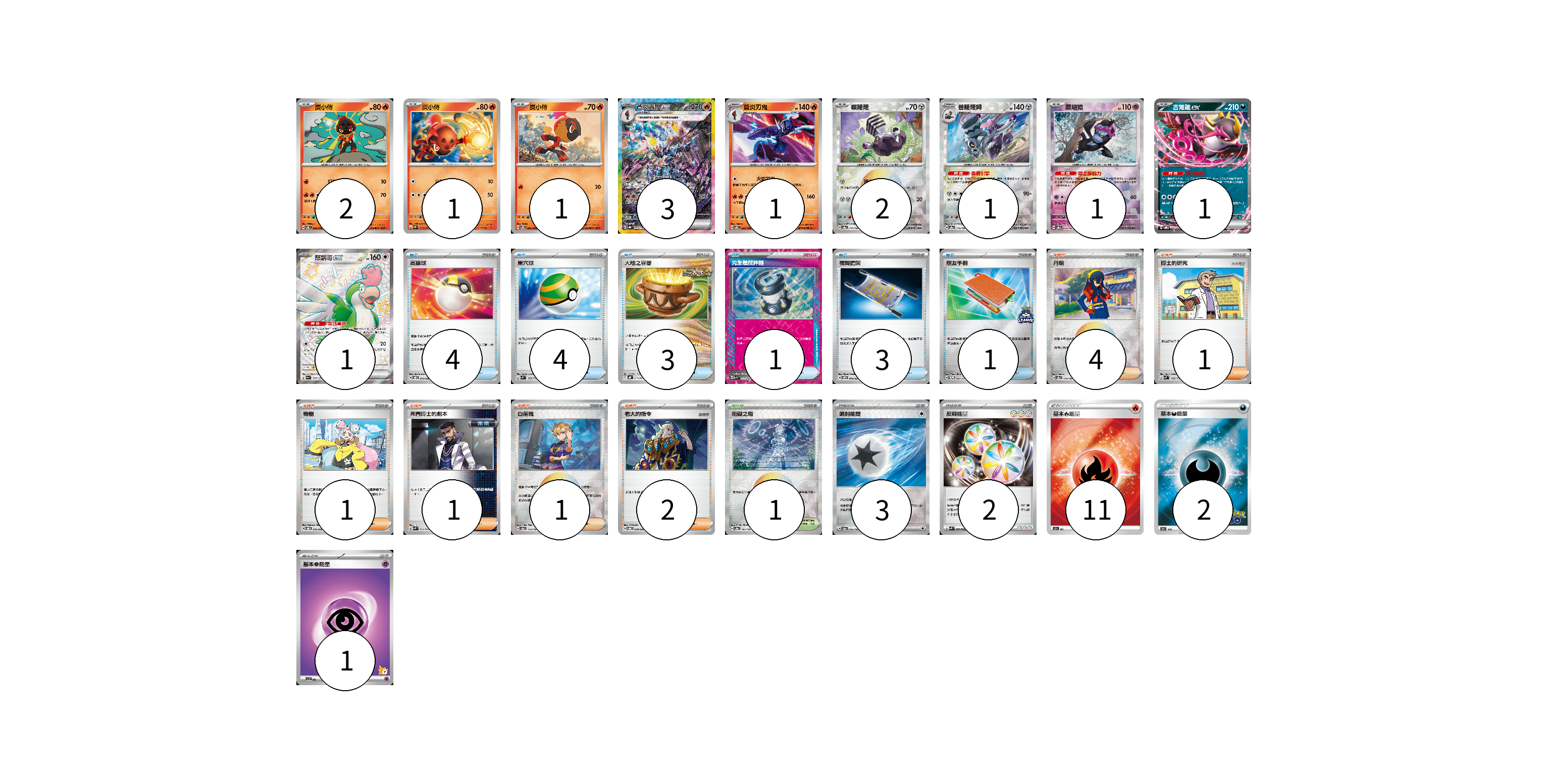 牌組構築方案 以此牌組為基礎新構築牌組 顯示卡面 顯示列表 寶可夢卡(14) 2 1 1 3 1 2 1 1 1 1 物品卡(16) 4 4 3 1 3 1 支援者卡(10) 4 1 1 1 1 2 競技場卡(1) 1 能量卡(19) 3 2 11 2 1 寶可夢卡(14) 卡牌名稱 張數 卡牌名稱 張數 炭小侍 SV8 020/106 02 炭小侍 SV2D 015/071 01 炭小侍 SVPS 005/008 01 蒼炎刃鬼ex SV8a 203/187 03 蒼炎刃鬼 SV8 022/106 01 噗隆隆 SV8a 114/187 02 普隆隆姆 SV8a 115/187 01 願增猿 SV8a 075/187 01 吉雉雞ex SVOD 004/020 01 怒鸚哥ex SV4a 337/190 01 物品卡(16) 卡牌名稱 張數 卡牌名稱 張數 高級球 SVOD 012/020 04 巢穴球 SVM 133/175 04 大地之容器 SVHK 011/022 03 完全體攪拌器 SVK 017/042 01 夜間擔架 SVOM 016/021 03 朋友手冊 SV-P 182/SV-P 01 支援者卡(10) 卡牌名稱 張數 卡牌名稱 張數 丹瑜 SV8a 170/187 04 博士的研究 SVM 162/175 01 奇樹 SVOD 016/020 01 弗圖博士的劇本 SVK 034/042 01 白蕾雅 SV8a 176/187 01 老大的指令 SVOD 019/020 02 競技場卡(1) 卡牌名稱 張數 卡牌名稱 張數 阻礙之塔 SV8a 181/187 01 能量卡(19) 卡牌名稱 張數 卡牌名稱 張數 噴射能量 SV8a 185/187 03 反轉能量 SVK 041/042 02 基本【火】能量 SO FIR 11 基本惡能量 S10b DAR 02 基本【超】能量 SVI PSY 01 以此牌組為基礎新構築牌組 牌組編碼 apuoHa-vrbhNk-YWvNFM copy 列印牌組單 牌組編碼已複製 分享至SNS