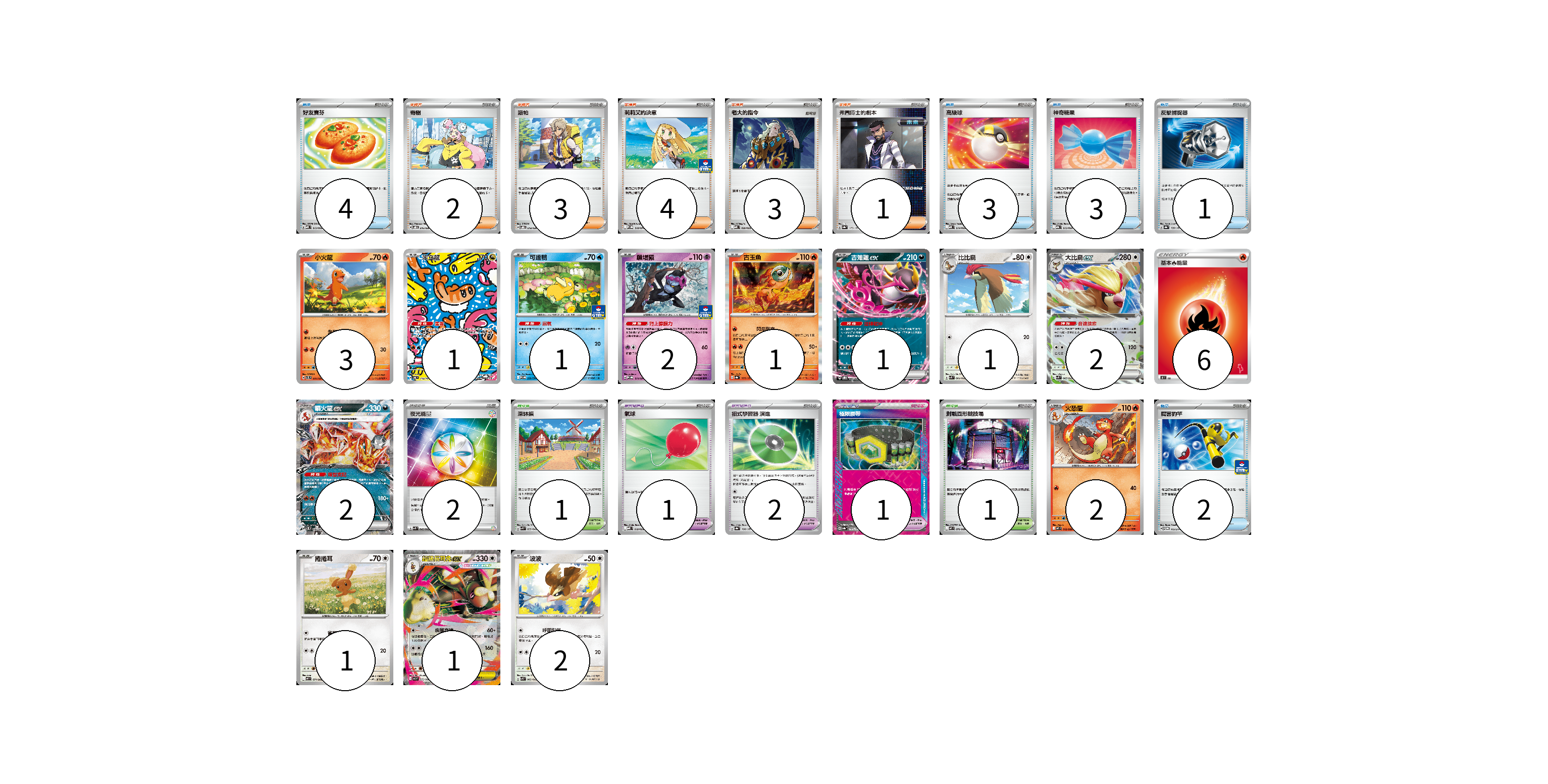 牌組構築方案 以此牌組為基礎新構築牌組 顯示卡面 顯示列表 寶可夢卡(20) 3 1 1 2 1 1 1 2 2 2 1 1 2 寶可夢道具(4) 1 2 1 物品卡(13) 4 3 3 1 2 支援者卡(13) 2 3 4 3 1 競技場卡(2) 1 1 能量卡(8) 6 2 寶可夢卡(20) 卡牌名稱 張數 卡牌名稱 張數 小火龍 SVTL 001/021 03 米立龍 SV6 112/101 01 可達鴨 SV-P 220/SV-P 01 願增猿 M-P 014/M-P 02 古玉魚 SV8a 025/187 01 吉雉雞ex SVOD 004/020 01 比比鳥 SVK 004/042 01 大比鳥ex SVK 005/042 02 噴火龍ex SVTL 006/021 02 火恐龍 M2 012/080 02 捲捲耳 M2 071/080 01 超級長耳兔ex M2 072/080 01 波波 SVK 003/042 02 寶可夢道具(4) 卡牌名稱 張數 卡牌名稱 張數 氣球 MBD 018/022 01 招式學習器 演進 SV8a 160/187 02 極限腰帶 SV8a 159/187 01 物品卡(13) 卡牌名稱 張數 卡牌名稱 張數 好友寶芬 MBD 013/022 04 高級球 MBD 014/022 03 神奇糖果 MBG 013/022 03 反擊捕捉器 SV8a 139/187 01 厲害釣竿 SV-P 112/SV-P 02 支援者卡(13) 卡牌名稱 張數 卡牌名稱 張數 奇樹 SVOD 016/020 02 派帕 SVOD 018/020 03 莉莉艾的決意 M-P 018/M-P 04 老大的指令 MBD 020/022 03 弗圖博士的劇本 SV8a 175/187 01 競技場卡(2) 卡牌名稱 張數 卡牌名稱 張數 深缽鎮 SVK 039/042 01 對戰圓形競技場 M2 079/080 01 能量卡(8) 卡牌名稱 張數 卡牌名稱 張數 基本火能量 SH FIR 06 夜光能量 SVK 042/042 02 以此牌組為基礎新構築牌組 牌組編碼 aqHAxI-wIROJd-xyQMnJ copy 列印牌組單 牌組編碼已複製 分享至SNS