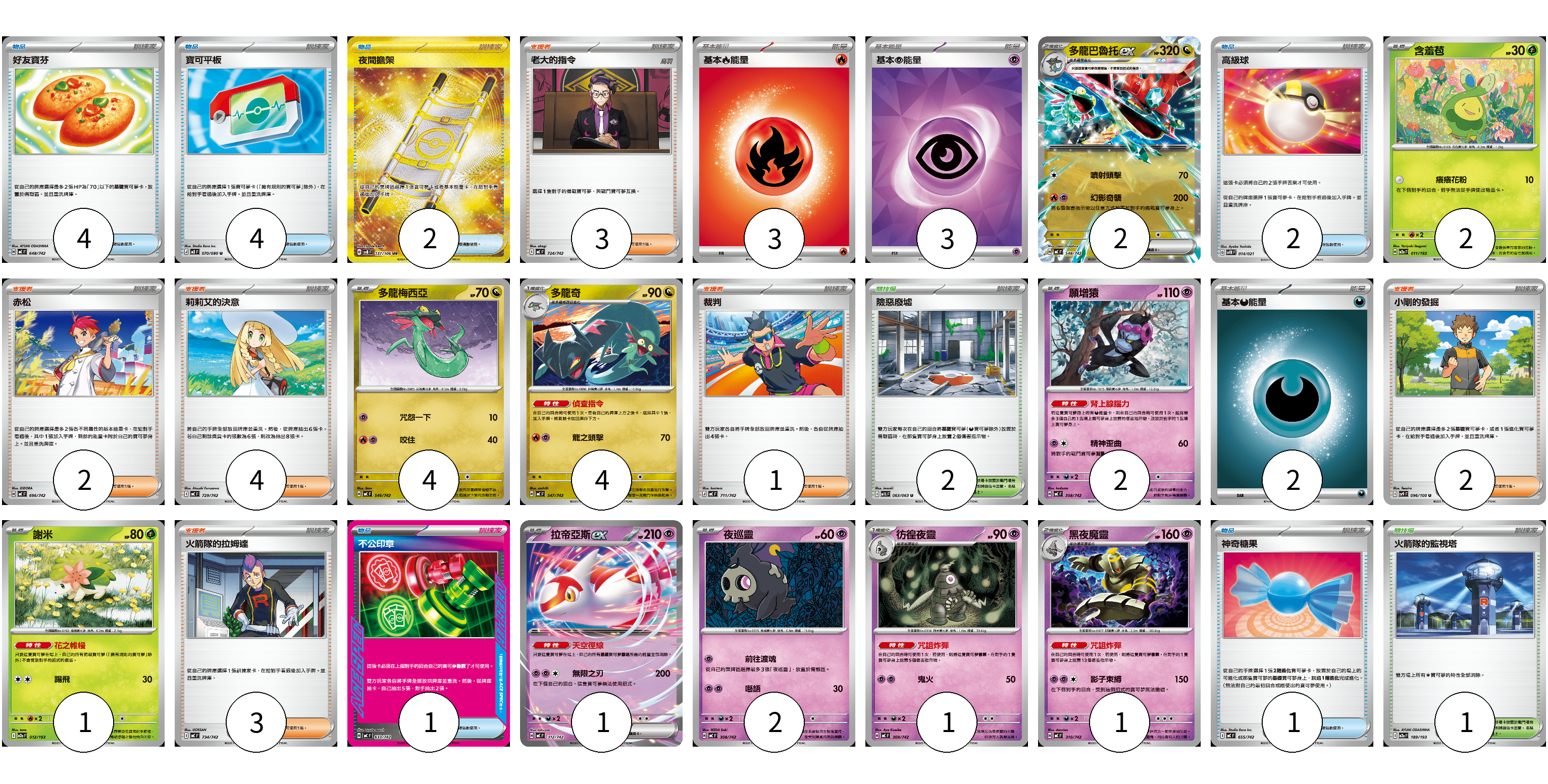牌組構築方案 以此牌組為基礎新構築牌組 顯示卡面 顯示列表 寶可夢卡(20) 2 2 4 4 2 1 1 2 1 1 物品卡(14) 4 4 2 2 1 1 支援者卡(15) 3 2 4 1 2 3 競技場卡(3) 2 1 能量卡(8) 3 3 2 寶可夢卡(20) 卡牌名稱 張數 卡牌名稱 張數 多龍巴魯托ex MC 548/742 02 含羞苞 M2a 011/193 02 多龍梅西亞 MC 546/742 04 多龍奇 MC 547/742 04 願增猿 MC 358/742 02 謝米 M2a 012/193 01 拉帝亞斯ex MC 312/742 01 夜巡靈 MC 308/742 02 彷徨夜靈 MC 309/742 01 黑夜魔靈 MC 310/742 01 物品卡(14) 卡牌名稱 張數 卡牌名稱 張數 好友寶芬 MC 648/742 04 寶可平板 M3 070/080 04 夜間擔架 SV8 137/106 02 高級球 SVTR 014/021 02 不公印章 MC 633/742 01 神奇糖果 MC 655/742 01 支援者卡(15) 卡牌名稱 張數 卡牌名稱 張數 老大的指令 MC 724/742 03 赤松 MC 696/742 02 莉莉艾的決意 MC 729/742 04 裁判 MC 711/742 01 小剛的發掘 SV9 096/100 02 火箭隊的拉姆達 MC 734/742 03 競技場卡(3) 卡牌名稱 張數 卡牌名稱 張數 險惡廢墟 M1L 063/063 02 火箭隊的監視塔 M2a 189/193 01 能量卡(8) 卡牌名稱 張數 卡牌名稱 張數 基本【火】能量 MC FIR 03 基本【超】能量 SVOD PSY 03 基本【惡】能量 MC DAR 02 以此牌組為基礎新構築牌組 牌組編碼 aqOdJo-SLPUlQ-ImBfDp copy 列印牌組單 牌組編碼已複製 分享至SNS