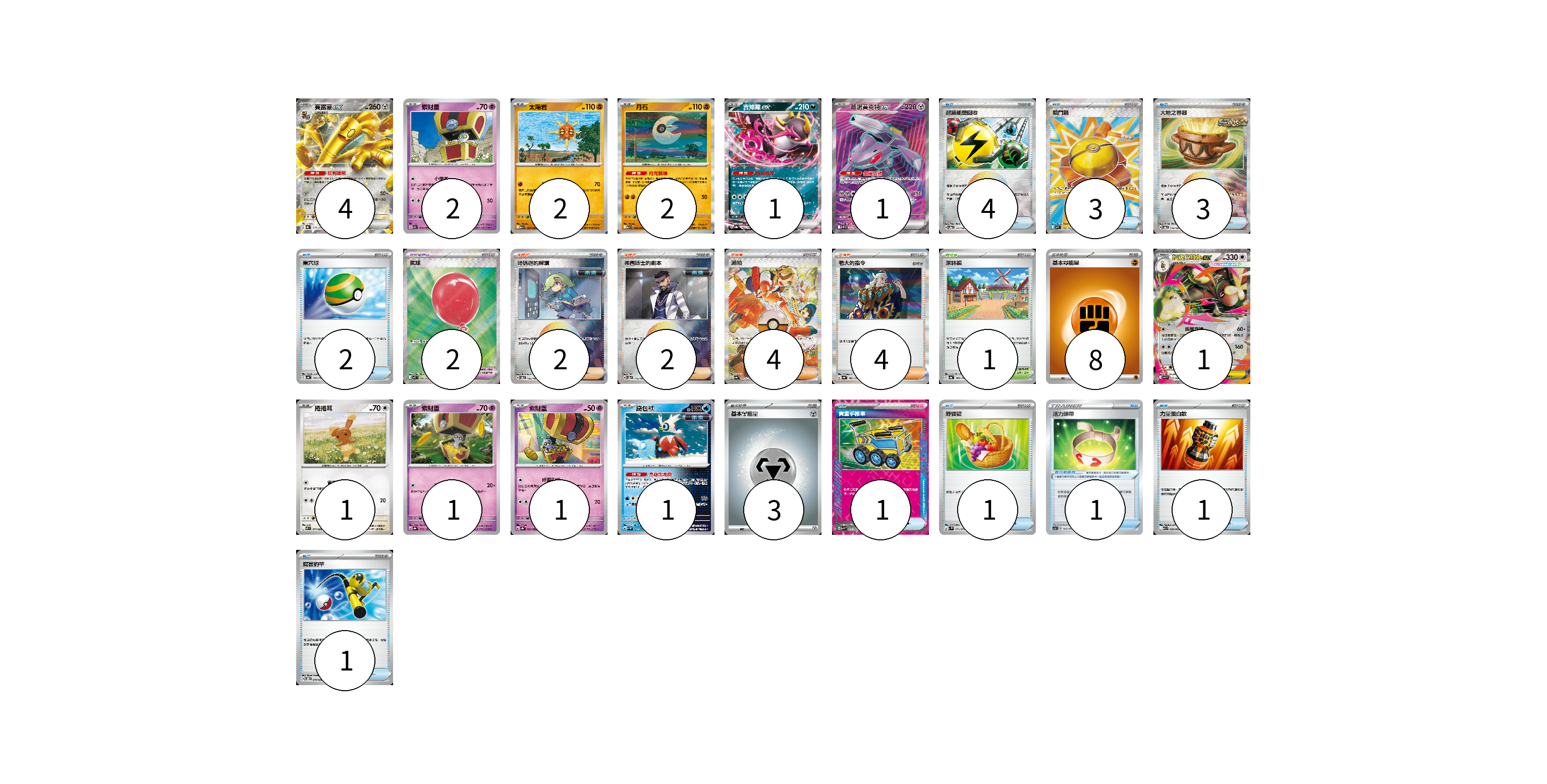 牌組構築方案 以此牌組為基礎新構築牌組 顯示卡面 顯示列表 寶可夢卡(17) 4 2 2 2 1 1 1 1 1 1 1 寶可夢道具(3) 2 1 物品卡(16) 4 3 3 2 1 1 1 1 支援者卡(12) 2 2 4 4 競技場卡(1) 1 能量卡(11) 8 3 寶可夢卡(17) 卡牌名稱 張數 卡牌名稱 張數 賽富豪ex SV8a 117/187 04 索財靈 SV7a 024/064 02 太陽岩 M1L 027/063 02 月石 M1L 026/063 02 吉雉雞ex SV8a 104/187 01 蓋諾賽克特ex SV11B 164/086 01 超級長耳兔ex M2 072/080 01 捲捲耳 M2 071/080 01 索財靈 SV8a 073/187 01 索財靈 SV3a 020/062 01 鐵包袱 SV4M 020/066 01 寶可夢道具(3) 卡牌名稱 張數 卡牌名稱 張數 氣球 M1L 084/063 02 活力頭帶 SC1a 143/154 01 物品卡(16) 卡牌名稱 張數 卡牌名稱 張數 超級能量回收 SV8a 141/187 04 戰鬥鑼 M1L 082/063 03 大地之容器 SV8a 143/187 03 巢穴球 SV4a 159/190 02 貴重手推車 SVK 020/042 01 野餐籃 SV1V 071/078 01 力量蛋白飲 M1L 058/063 01 厲害釣竿 SVOD 010/020 01 支援者卡(12) 卡牌名稱 張數 卡牌名稱 張數 暗碼迷的解讀 SV8a 165/187 02 弗圖博士的劇本 SV8a 175/187 02 派帕 SV4a 353/190 04 老大的指令 SV4a 181/190 04 競技場卡(1) 卡牌名稱 張數 卡牌名稱 張數 深缽鎮 SV4a 185/190 01 能量卡(11) 卡牌名稱 張數 卡牌名稱 張數 基本【鬥】能量 SVAM FIG 08 基本【鋼】能量 M-P MET 03 以此牌組為基礎新構築牌組 牌組編碼 atXhVo-TknRJi-LhIclc copy 列印牌組單 牌組編碼已複製 分享至SNS