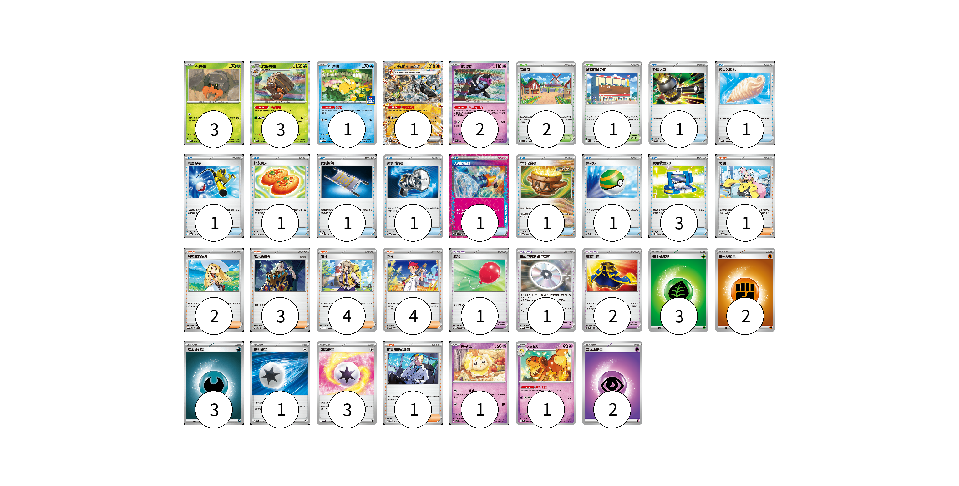 牌組構築方案 以此牌組為基礎新構築牌組 顯示卡面 顯示列表 寶可夢卡(12) 3 3 1 1 2 1 1 寶可夢道具(4) 1 1 2 物品卡(12) 1 1 1 1 1 1 1 1 1 3 支援者卡(15) 1 2 3 4 4 1 競技場卡(3) 2 1 能量卡(14) 3 2 3 1 3 2 寶可夢卡(12) 卡牌名稱 張數 卡牌名稱 張數 石居蟹 SV9a 007/063 03 岩殿居蟹 SV9a 008/063 03 可達鴨 SV-P 220/SV-P 01 厄鬼椪 礎石面具ex SV8a 091/187 01 願增猿 SV8a 075/187 02 狗仔包 SV7 045/102 01 麻花犬 SV1S 034/078 01 寶可夢道具(4) 卡牌名稱 張數 卡牌名稱 張數 氣球 MBD 018/022 01 招式學習器 能量渦輪 SV3a 056/062 01 豪華斗篷 SV8a 155/187 02 物品卡(12) 卡牌名稱 張數 卡牌名稱 張數 改造之錘 SV8a 138/187 01 超大冰淇淋 M2 073/080 01 厲害釣竿 SVOD 010/020 01 好友寶芬 MBD 013/022 01 夜間擔架 MBD 016/022 01 反擊捕捉器 SV8a 139/187 01 頂尖捕捉器 SV5M 062/071 01 大地之容器 SV8a 143/187 01 巢穴球 SVM 133/175 01 寶可裝置3.0 SV11B 081/086 03 支援者卡(15) 卡牌名稱 張數 卡牌名稱 張數 奇樹 SVOD 016/020 01 莉莉艾的決意 MBD 021/022 02 老大的指令 MBD 020/022 03 派帕 SVOD 018/020 04 赤松 SV8a 163/187 04 阿克羅瑪的執著 SVOM 017/021 01 競技場卡(3) 卡牌名稱 張數 卡牌名稱 張數 深缽鎮 SVF 036/038 02 城鎮百貨公司 SV3 107/108 01 能量卡(14) 卡牌名稱 張數 卡牌名稱 張數 基本【草】能量 M-P GRA 03 基本【鬥】能量 M-P FIG 02 基本【惡】能量 M-P DAR 03 噴射能量 SV1a 072/073 01 薄霧能量 SV5M 071/071 03 基本【超】能量 M-P PSY 02 以此牌組為基礎新構築牌組 牌組編碼 auwhkw-wAhOsP-nyraQa copy 列印牌組單 牌組編碼已複製 分享至SNS