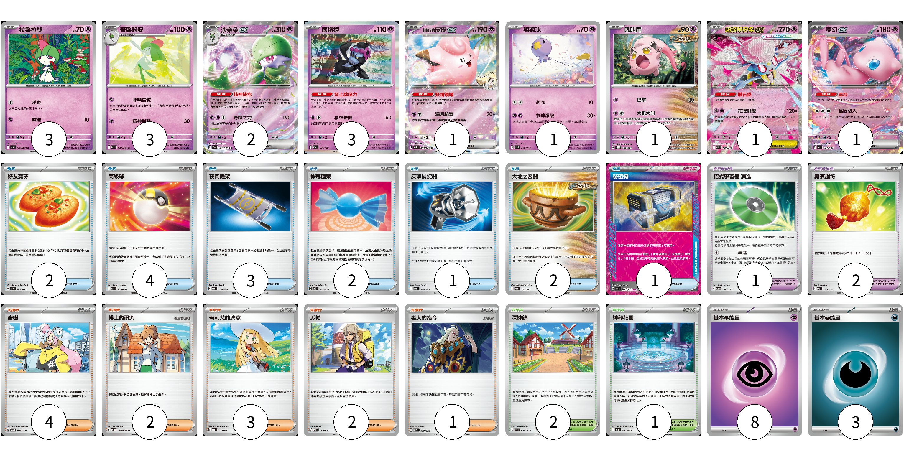 牌組構築方案 以此牌組為基礎新構築牌組 顯示卡面 顯示列表 寶可夢卡(16) 3 3 2 3 1 1 1 1 1 寶可夢道具(3) 1 2 物品卡(15) 2 4 3 2 1 2 1 支援者卡(12) 4 2 3 2 1 競技場卡(3) 2 1 能量卡(11) 8 3 寶可夢卡(16) 卡牌名稱 張數 卡牌名稱 張數 拉魯拉絲 M1S 040/063 03 奇魯莉安 M1S 041/063 03 沙奈朵ex SV4a 082/190 02 願增猿 SV8a 075/187 03 莉莉艾的皮皮ex SV9 033/100 01 飄飄球 SVD 052/139 01 吼叫尾 SVTS 007/022 01 超級蒂安希ex MBD 006/022 01 夢幻ex SVK 001/042 01 寶可夢道具(3) 卡牌名稱 張數 卡牌名稱 張數 招式學習器 演進 SV8a 160/187 01 勇氣護符 SVM 142/175 02 物品卡(15) 卡牌名稱 張數 卡牌名稱 張數 好友寶芬 MBD 013/022 02 高級球 MBD 014/022 04 夜間擔架 MBD 016/022 03 神奇糖果 MBG 013/022 02 反擊捕捉器 SV8a 139/187 01 大地之容器 SV8a 143/187 02 秘密箱 SV6 092/101 01 支援者卡(12) 卡牌名稱 張數 卡牌名稱 張數 奇樹 SVOD 016/020 04 博士的研究 SV11B 084/086 02 莉莉艾的決意 MBD 021/022 03 派帕 SVOD 018/020 02 老大的指令 SVTS 020/022 01 競技場卡(3) 卡牌名稱 張數 卡牌名稱 張數 深缽鎮 SVF 036/038 02 神秘花園 MBD 022/022 01 能量卡(11) 卡牌名稱 張數 卡牌名稱 張數 基本超能量 sv-p PSY 08 基本惡能量 sv-p DAR 03 以此牌組為基礎新構築牌組 牌組編碼 avytjx-JpHjav-wSPOAT copy 列印牌組單 牌組編碼已複製 分享至SNS