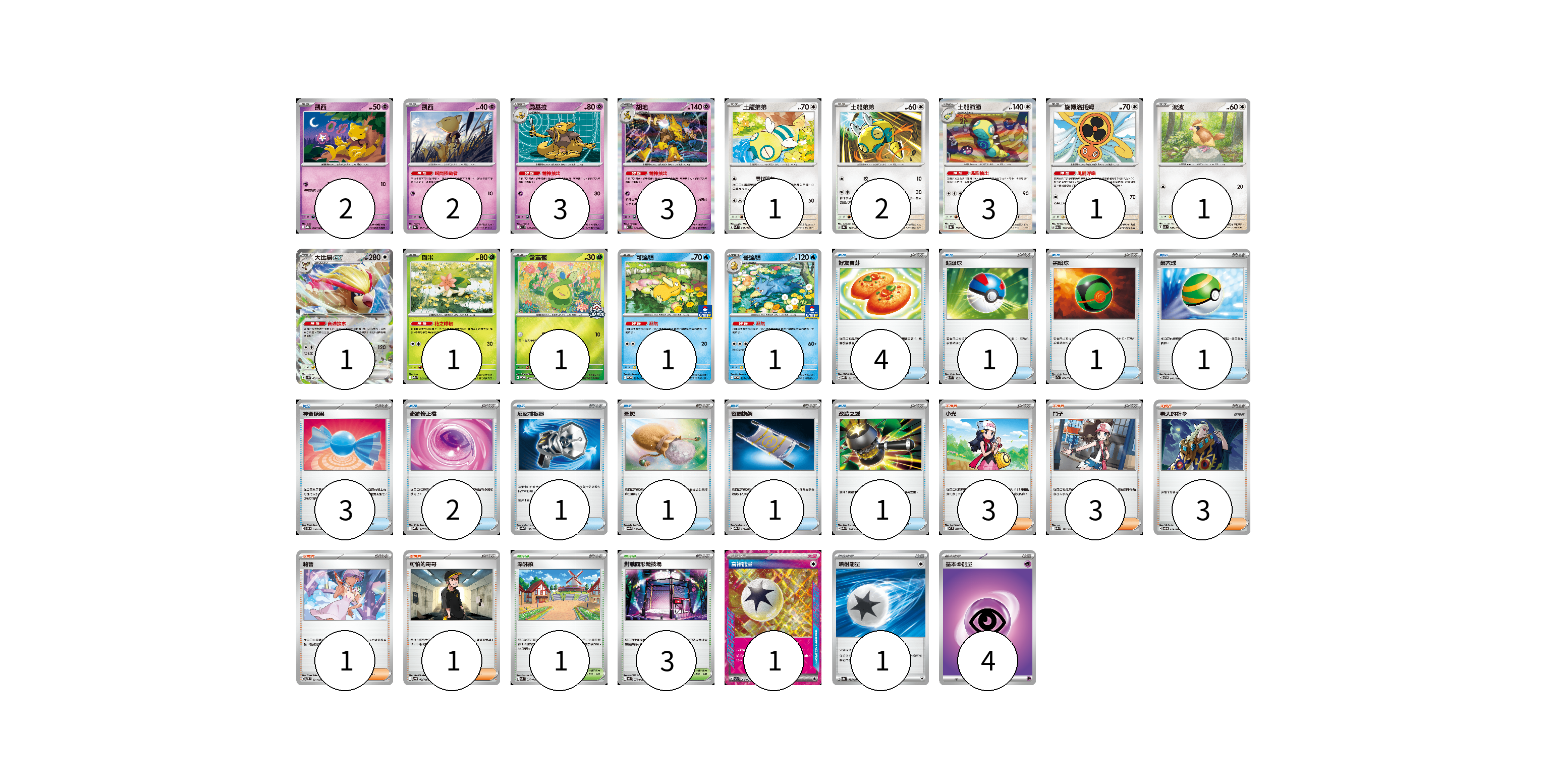 牌組構築方案 以此牌組為基礎新構築牌組 顯示卡面 顯示列表 寶可夢卡(23) 2 2 3 3 1 2 3 1 1 1 1 1 1 1 物品卡(16) 4 1 1 1 3 2 1 1 1 1 支援者卡(11) 3 3 3 1 1 競技場卡(4) 1 3 能量卡(6) 1 1 4 寶可夢卡(23) 卡牌名稱 張數 卡牌名稱 張數 凱西 M1S 036/063 02 凱西 SV8a 057/187 02 勇基拉 M1S 037/063 03 胡地 M1S 038/063 03 土龍弟弟 SVM 095/175 01 土龍弟弟 SV8a 129/187 02 土龍節節 SV8a 130/187 03 旋轉洛托姆 M2a 139/193 01 波波 SV3 087/108 01 大比鳥ex SV3 089/108 01 謝米 M2a 012/193 01 含羞苞 M-P 037/M-P 01 可達鴨 SV-P 220/SV-P 01 哥達鴨 SV-P 221/SV-P 01 物品卡(16) 卡牌名稱 張數 卡牌名稱 張數 好友寶芬 MBG 011/022 04 超級球 SVM 132/175 01 黑暗球 SV7a 054/064 01 巢穴球 SVTH 010/018 01 神奇糖果 SVOM 014/021 03 奇跡修正檔 MBD 017/022 02 反擊捕捉器 SV8a 139/187 01 聖灰 SV9a 056/063 01 夜間擔架 MBG 017/022 01 改造之錘 M2a 148/193 01 支援者卡(11) 卡牌名稱 張數 卡牌名稱 張數 小光 M2 077/080 03 鬥子 M2a 172/193 03 老大的指令 SVOD 019/020 03 莉普 SVTS 021/022 01 可怕的哥哥 SV9 095/100 01 競技場卡(4) 卡牌名稱 張數 卡牌名稱 張數 深缽鎮 SVK 039/042 01 對戰圓形競技場 M2 079/080 03 能量卡(6) 卡牌名稱 張數 卡牌名稱 張數 富裕能量 SV7a 064/064 01 噴射能量 SV8a 185/187 01 基本超能量 sv-p PSY 04 以此牌組為基礎新構築牌組 牌組編碼 awzlKo-qVAFac-nszcUk copy 列印牌組單 牌組編碼已複製 分享至SNS