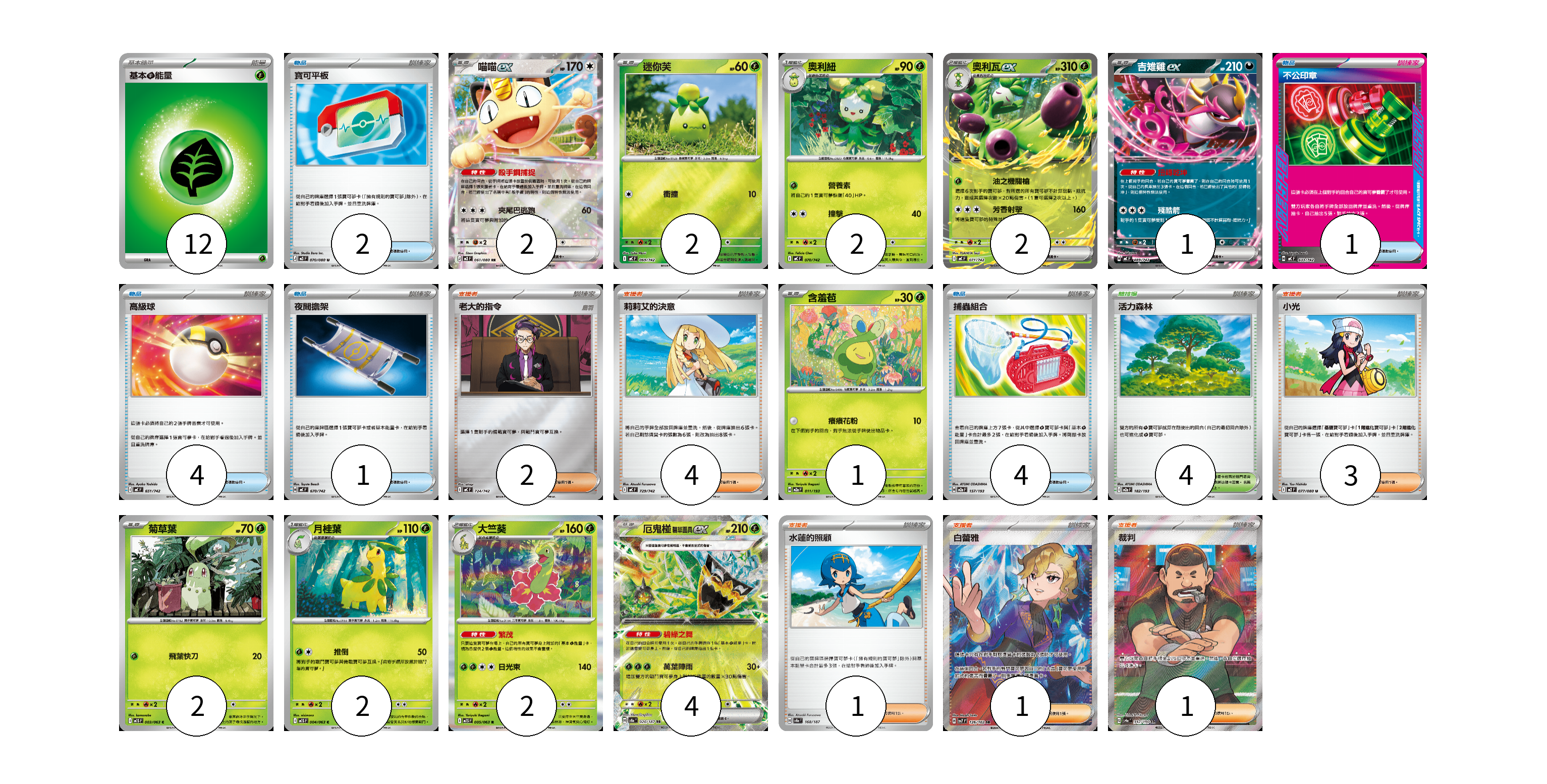 牌組構築方案 以此牌組為基礎新構築牌組 顯示卡面 顯示列表 寶可夢卡(20) 2 2 2 2 1 1 2 2 2 4 物品卡(12) 2 1 4 1 4 支援者卡(12) 2 4 3 1 1 1 競技場卡(4) 4 能量卡(12) 12 寶可夢卡(20) 卡牌名稱 張數 卡牌名稱 張數 喵喵ex M3 061/080 02 迷你芙 MC 069/742 02 奧利紐 MC 070/742 02 奧利瓦ex MC 071/742 02 吉雉雞ex MC 489/742 01 含羞苞 M2a 011/193 01 菊草葉 M1S 003/063 02 月桂葉 M1S 004/063 02 大竺葵 M1S 005/063 02 厄鬼椪 碧草面具ex SV8a 020/187 04 物品卡(12) 卡牌名稱 張數 卡牌名稱 張數 寶可平板 M3 070/080 02 不公印章 MC 633/742 01 高級球 MC 651/742 04 夜間擔架 MC 670/742 01 捕蟲組合 M2a 157/193 04 支援者卡(12) 卡牌名稱 張數 卡牌名稱 張數 老大的指令 MC 724/742 02 莉莉艾的決意 MC 729/742 04 小光 M2 077/080 03 水蓮的照顧 SV8a 168/187 01 白蕾雅 SV7 126/102 01 裁判 SV4a 342/190 01 競技場卡(4) 卡牌名稱 張數 卡牌名稱 張數 活力森林 M2a 182/193 04 能量卡(12) 卡牌名稱 張數 卡牌名稱 張數 基本【草】能量 MJ GRA 12 以此牌組為基礎新構築牌組 牌組編碼 axJBRI-sSdrfx-UfgdcD copy 列印牌組單 牌組編碼已複製 分享至SNS