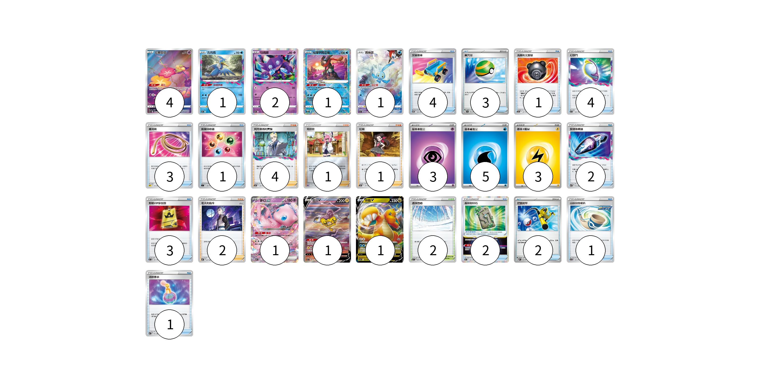 牌組構築方案 以此牌組為基礎新構築牌組 顯示卡面 顯示列表 寶可夢卡(12) 4 1 2 1 1 1 1 1 寶可夢道具(2) 2 物品卡(25) 4 3 1 4 3 1 2 3 2 1 1 支援者卡(8) 4 1 1 2 競技場卡(2) 2 能量卡(11) 3 5 3 寶可夢卡(12) 卡牌名稱 張數 卡牌名稱 張數 花療環環 S12a 187/172 04 古月鳥 S11 033/100 01 勾魂眼 S11 044/100 02 光輝甲賀忍蛙 S12a 033/172 01 瑪納霏 S12a 178/172 01 夢幻ex SV2a 151/165 01 雷公V S12a 218/172 01 快龍V S7R 042/067 01 寶可夢道具(2) 卡牌名稱 張數 卡牌名稱 張數 森林封印石 S12 092/098 02 物品卡(25) 卡牌名稱 張數 卡牌名稱 張數 交替推車 S10D 060/067 04 巢穴球 SV1S 070/078 03 洗翠的沉重球 S12a 140/172 01 幻想門 S11 092/100 04 離洞繩 SDP 012/022 03 能量回收器 SI 368/414 01 放逐吸塵器 SVB 016/028 02 對戰VIP參加證 S8 091/100 03 厲害釣竿 SV2P 066/071 02 山谷回音喇叭 S5a 064/070 01 消除香水 SVF 011/038 01 支援者卡(8) 卡牌名稱 張數 卡牌名稱 張數 阿克羅瑪的實驗 S12a 148/172 04 克拉拉 SPD 014/020 01 杜娟 S12a 157/172 01 老大的指令(赤日) SVB 024/028 02 競技場卡(2) 卡牌名稱 張數 卡牌名稱 張數 通頂雪道 S6H 069/070 02 能量卡(11) 卡牌名稱 張數 卡牌名稱 張數 基本超能量 sv-p PSY 03 基本水能量 sv-p WAT 05 基本【雷】能量 SVB LIG 03 以此牌組為基礎新構築牌組 牌組編碼 bAXAOa-urakBr-nIdKej copy 列印牌組單 牌組編碼已複製 分享至SNS