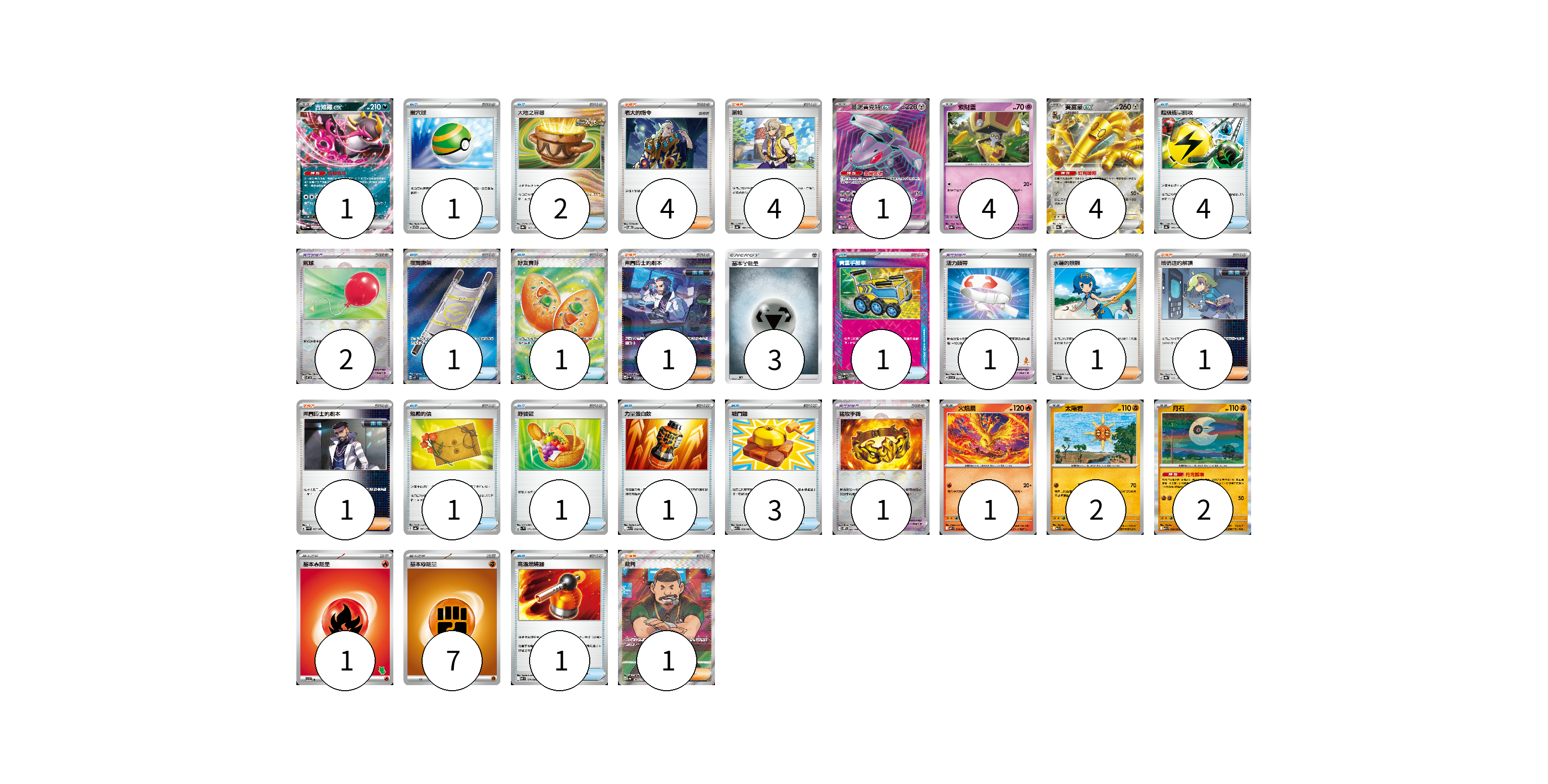 牌組構築方案 以此牌組為基礎新構築牌組 顯示卡面 顯示列表 寶可夢卡(15) 1 1 4 4 1 2 2 寶可夢道具(4) 2 1 1 物品卡(17) 1 2 4 1 1 1 1 1 1 3 1 支援者卡(13) 4 4 1 1 1 1 1 能量卡(11) 3 1 7 寶可夢卡(15) 卡牌名稱 張數 卡牌名稱 張數 吉雉雞ex SV6a 038/064 01 蓋諾賽克特ex SV11B 164/086 01 索財靈 SV8a 073/187 04 賽富豪ex SV8a 117/187 04 火焰鳥 M2 014/080 01 太陽岩 M1L 027/063 02 月石 M1L 026/063 02 寶可夢道具(4) 卡牌名稱 張數 卡牌名稱 張數 氣球 SV11B 082/086 02 活力頭帶 SVI 057/066 01 猛攻手鐲 SV11W 082/086 01 物品卡(17) 卡牌名稱 張數 卡牌名稱 張數 巢穴球 SVTG 012/019 01 大地之容器 SV8a 143/187 02 超級能量回收 SV4a 157/190 04 夜間擔架 M1L 083/063 01 好友寶芬 M1S 081/063 01 貴重手推車 SVK 020/042 01 勉勵的信 SV4a 162/190 01 野餐籃 SV1V 071/078 01 力量蛋白飲 M1L 058/063 01 戰鬥鑼 M1L 059/063 03 高溫燃燒器 M2 074/080 01 支援者卡(13) 卡牌名稱 張數 卡牌名稱 張數 老大的指令 SVOD 019/020 04 派帕 SV4a 180/190 04 弗圖博士的劇本 SV4M 091/066 01 水蓮的照顧 SV8a 168/187 01 暗碼迷的解讀 SV8a 165/187 01 弗圖博士的劇本 SV4M 065/066 01 裁判 SV4a 342/190 01 能量卡(11) 卡牌名稱 張數 卡牌名稱 張數 基本鋼能量 AS6D MET 03 基本【火】能量 SVI FIR 01 基本【鬥】能量 SVHK FIG 07 以此牌組為基礎新構築牌組 牌組編碼 bBGHXh-mLJBNm-Fovost copy 列印牌組單 牌組編碼已複製 分享至SNS
