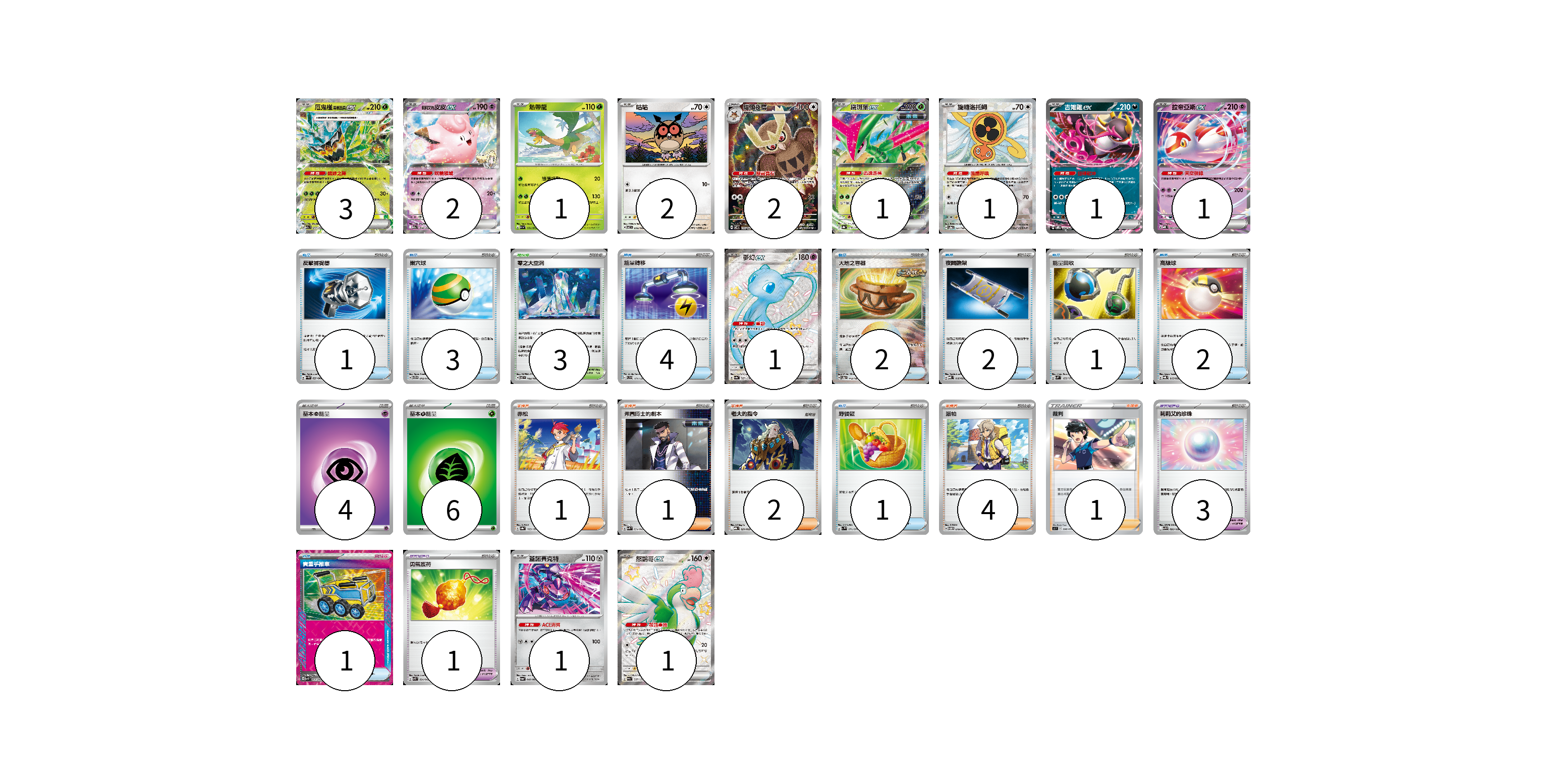 牌組構築方案 以此牌組為基礎新構築牌組 顯示卡面 顯示列表 寶可夢卡(17) 3 2 1 2 2 1 1 1 1 1 1 1 寶可夢道具(4) 3 1 物品卡(17) 1 3 4 2 2 1 2 1 1 支援者卡(9) 1 1 2 4 1 競技場卡(3) 3 能量卡(10) 4 6 寶可夢卡(17) 卡牌名稱 張數 卡牌名稱 張數 厄鬼椪 碧草面具ex M2a 017/193 03 莉莉艾的皮皮ex M2a 060/193 02 熱帶龍 SV1a 001/073 01 咕咕 SV7 076/102 02 貓頭夜鷹 SV7 114/102 02 鐵斑葉ex SV8a 016/187 01 旋轉洛托姆 SV8a 131/187 01 吉雉雞ex SVOM 009/021 01 拉帝亞斯ex MBD 003/022 01 夢幻ex SV4a 327/190 01 蓋諾賽克特 SV6a 040/064 01 怒鸚哥ex SV4a 337/190 01 寶可夢道具(4) 卡牌名稱 張數 卡牌名稱 張數 莉莉艾的珍珠 SV9 093/100 03 勇氣護符 SVK 024/042 01 物品卡(17) 卡牌名稱 張數 卡牌名稱 張數 反擊捕捉器 SV4M 059/066 01 巢穴球 SVTG 012/019 03 能量轉移 SVD 111/139 04 大地之容器 SV8a 143/187 02 夜間擔架 MBD 016/022 02 能量回收 SVM 125/175 01 高級球 SVQL 015/022 02 野餐籃 SV1V 071/078 01 貴重手推車 SVK 020/042 01 支援者卡(9) 卡牌名稱 張數 卡牌名稱 張數 赤松 SV8a 163/187 01 弗圖博士的劇本 SVK 034/042 01 老大的指令 MBG 021/022 02 派帕 SVTM 019/022 04 裁判 SI 398/414 01 競技場卡(3) 卡牌名稱 張數 卡牌名稱 張數 零之大空洞 SV7 102/102 03 能量卡(10) 卡牌名稱 張數 卡牌名稱 張數 基本超能量 sv-p PSY 04 基本草能量 sv-p GRA 06 以此牌組為基礎新構築牌組 牌組編碼 bBpFYR-rGODzP-iTDbWx copy 列印牌組單 牌組編碼已複製 分享至SNS