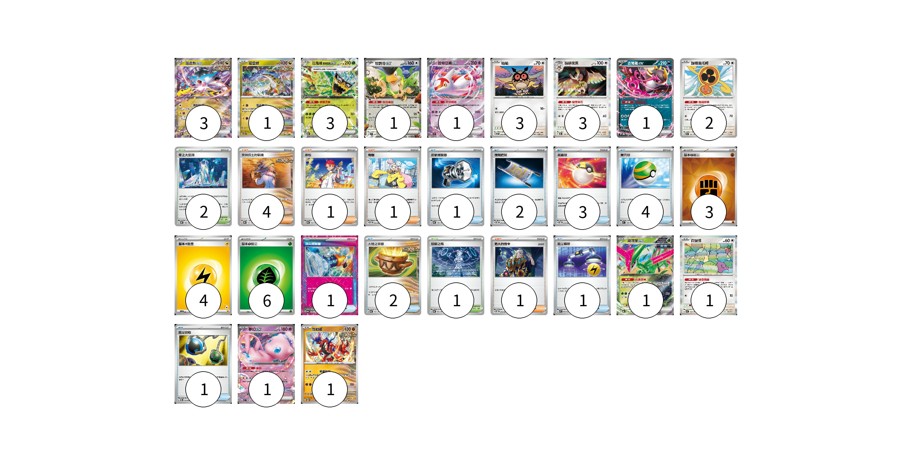 牌組構築方案 以此牌組為基礎新構築牌組 顯示卡面 顯示列表 寶可夢卡(22) 3 1 3 1 1 3 3 1 2 1 1 1 1 物品卡(15) 1 2 3 4 1 2 1 1 支援者卡(7) 4 1 1 1 競技場卡(3) 2 1 能量卡(13) 3 4 6 寶可夢卡(22) 卡牌名稱 張數 卡牌名稱 張數 猛雷鼓ex SV8a 124/187 03 猛雷鼓 SV7 075/102 01 厄鬼椪 碧草面具ex SV8a 020/187 03 怒鸚哥ex SVK 006/042 01 拉帝亞斯ex SV7a 019/064 01 咕咕 SV7 076/102 03 貓頭夜鷹 SV8a 128/187 03 吉雉雞ex SVOD 004/020 01 旋轉洛托姆 SV8a 131/187 02 鐵斑葉ex SV8a 016/187 01 百變怪 SV4a 144/190 01 夢幻ex SVK 001/042 01 故勒頓 SV8 069/106 01 物品卡(15) 卡牌名稱 張數 卡牌名稱 張數 反擊捕捉器 SV8a 139/187 01 夜間擔架 SVOM 016/021 02 高級球 SVOD 012/020 03 巢穴球 SVM 133/175 04 頂尖捕捉器 SV8a 148/187 01 大地之容器 SV8a 143/187 02 能量轉移 SVK 008/042 01 能量回收 SVQL 012/022 01 支援者卡(7) 卡牌名稱 張數 卡牌名稱 張數 奧琳博士的氣魄 SV8a 167/187 04 赤松 SV8a 163/187 01 奇樹 SVOD 016/020 01 老大的指令 SVOD 019/020 01 競技場卡(3) 卡牌名稱 張數 卡牌名稱 張數 零之大空洞 SV8a 182/187 02 阻礙之塔 SV8a 181/187 01 能量卡(13) 卡牌名稱 張數 卡牌名稱 張數 基本【鬥】能量 SVK FIG 03 基本【雷】能量 SVI LIG 04 基本【草】能量 SVTM GRA 06 以此牌組為基礎新構築牌組 牌組編碼 bBrego-sWGlGg-BOGHGp copy 列印牌組單 牌組編碼已複製 分享至SNS