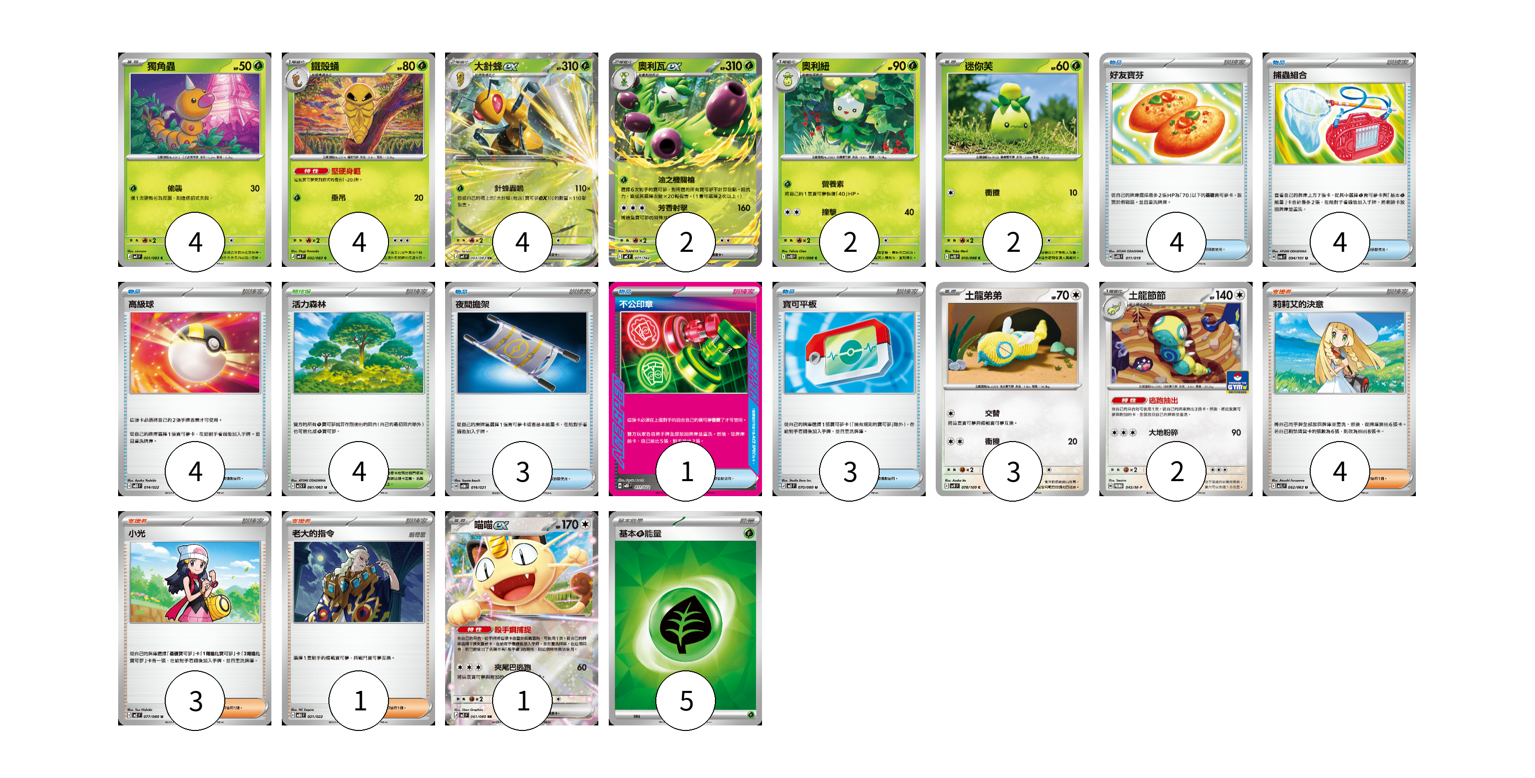 牌組構築方案 以此牌組為基礎新構築牌組 顯示卡面 顯示列表 寶可夢卡(24) 4 4 4 2 2 2 3 2 1 物品卡(19) 4 4 4 3 1 3 支援者卡(8) 4 3 1 競技場卡(4) 4 能量卡(5) 5 寶可夢卡(24) 卡牌名稱 張數 卡牌名稱 張數 獨角蟲 M4 001/083 04 鐵殼蛹 M4 002/083 04 大針蜂ex M4 003/083 04 奧利瓦ex MC 071/742 02 奧利紐 SV10 011/098 02 迷你芙 SV10 010/098 02 土龍弟弟 SV9 078/100 03 土龍節節 M-P 045/M-P 02 喵喵ex M3 061/080 01 物品卡(19) 卡牌名稱 張數 卡牌名稱 張數 好友寶芬 SVTG 011/019 04 捕蟲組合 SV6 094/101 04 高級球 MBD 014/022 04 夜間擔架 SVOM 016/021 03 不公印章 MBD 011/022 01 寶可平板 M3 070/080 03 支援者卡(8) 卡牌名稱 張數 卡牌名稱 張數 莉莉艾的決意 M1L 062/063 04 小光 M2 077/080 03 老大的指令 MBG 021/022 01 競技場卡(4) 卡牌名稱 張數 卡牌名稱 張數 活力森林 M1S 061/063 04 能量卡(5) 卡牌名稱 張數 卡牌名稱 張數 基本【草】能量 SVM GRA 05 以此牌組為基礎新構築牌組 牌組編碼 bEWXTL-KCLddl-uuEqOS copy 列印牌組單 牌組編碼已複製 分享至SNS