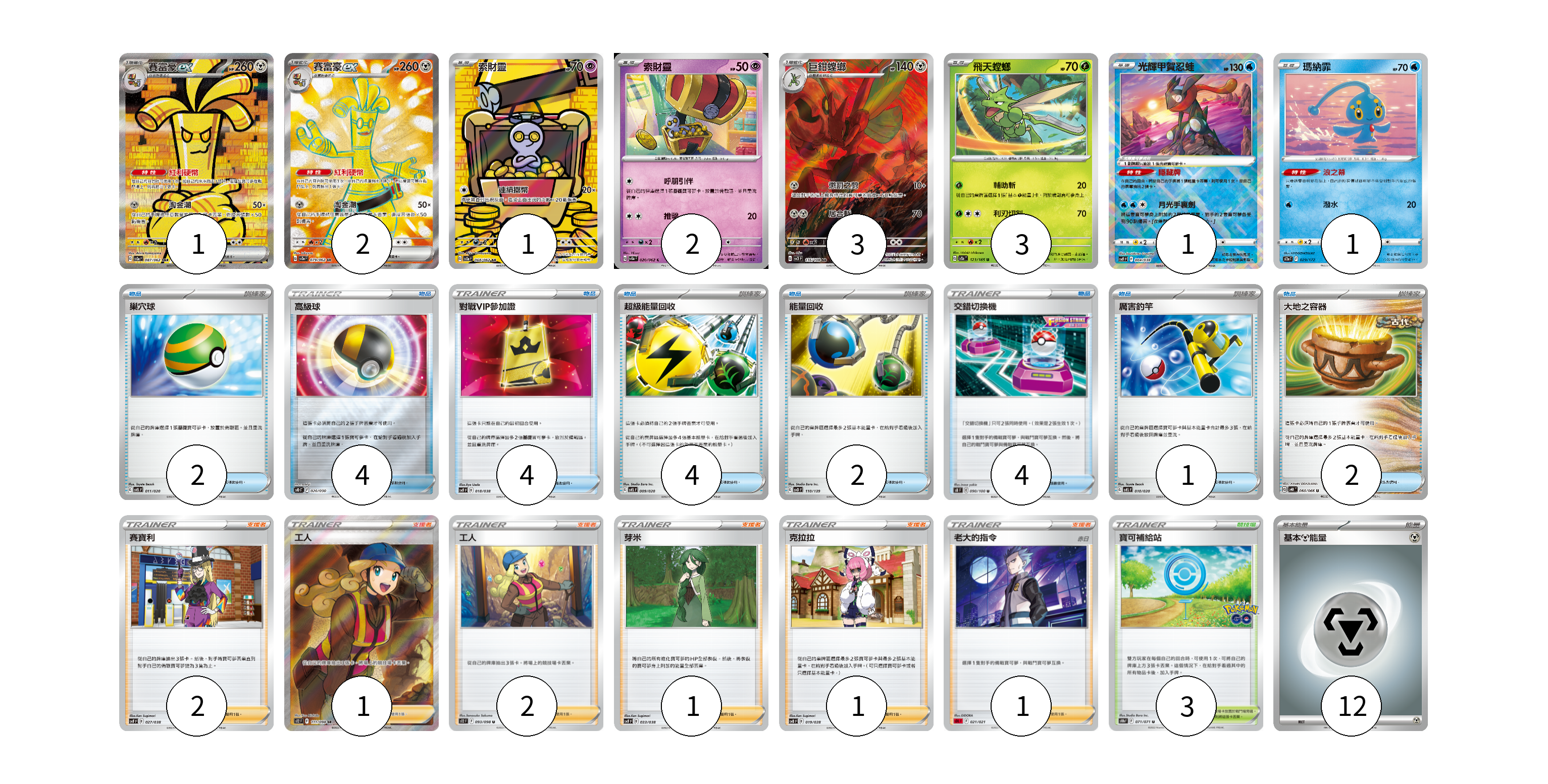 牌組構築方案 以此牌組為基礎新構築牌組 顯示卡面 顯示列表 寶可夢卡(15) 1 2 1 2 3 3 1 1 1 物品卡(22) 2 4 4 4 2 4 2 支援者卡(8) 2 1 2 1 1 1 競技場卡(3) 3 能量卡(12) 12 寶可夢卡(15) 卡牌名稱 張數 卡牌名稱 張數 賽富豪ex SV3a 087/062 01 賽富豪ex SV3a 079/062 02 索財靈 SV3a 068/062 01 索財靈 SV3a 020/062 02 巨鉗螳螂 SV3 116/108 03 飛天螳螂 SV2a 123/165 03 光輝甲賀忍蛙 SVF 004/038 01 瑪納霏 S12a 029/172 01 厲害釣竿 SVEL 010/020 01 物品卡(22) 卡牌名稱 張數 卡牌名稱 張數 巢穴球 SVEL 011/020 02 高級球 SO 020/030 04 對戰VIP參加證 SVF 018/038 04 超級能量回收 SVEL 009/020 04 能量回收 SVD 110/139 02 交錯切換機 S8 090/100 04 大地之容器 SV4K 060/066 02 支援者卡(8) 卡牌名稱 張數 卡牌名稱 張數 賽寶利 SVF 027/038 02 工人 S12 111/098 01 工人 S12 093/098 02 芽米 SVF 033/038 01 克拉拉 SVB 019/028 01 老大的指令(赤日) SDL 021/021 01 競技場卡(3) 卡牌名稱 張數 卡牌名稱 張數 寶可補給站 S10b 071/071 03 能量卡(12) 卡牌名稱 張數 卡牌名稱 張數 基本鋼能量 sv-p MET 12 以此牌組為基礎新構築牌組 牌組編碼 bEdKSI-MkjRNN-liYfzr copy 列印牌組單 牌組編碼已複製 分享至SNS