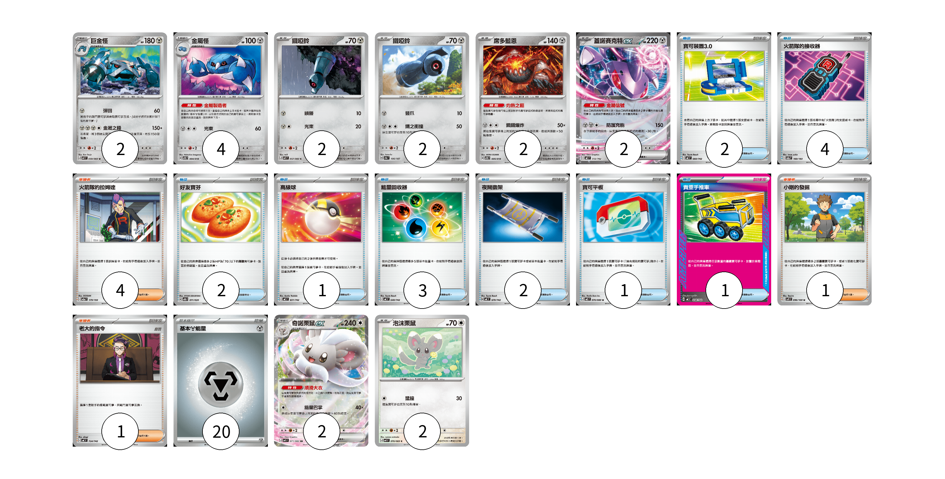 牌組構築方案 以此牌組為基礎新構築牌組 顯示卡面 顯示列表 寶可夢卡(18) 2 4 2 2 2 2 2 2 物品卡(16) 2 4 2 1 3 2 1 1 支援者卡(6) 4 1 1 能量卡(20) 20 寶可夢卡(18) 卡牌名稱 張數 卡牌名稱 張數 巨金怪 M4 059/083 02 金屬怪 SVTH 004/018 04 鐵啞鈴 M4 057/083 02 鐵啞鈴 SV8a 106/187 02 席多藍恩 SVTH 005/018 02 蓋諾賽克特ex MC 512/742 02 奇諾栗鼠ex M4 071/083 02 泡沫栗鼠 M4 070/083 02 物品卡(16) 卡牌名稱 張數 卡牌名稱 張數 寶可裝置3.0 MC 660/742 02 火箭隊的接收器 M2a 160/193 04 好友寶芬 SVOD 011/020 02 高級球 MC 651/742 01 能量回收器 MC 640/742 03 夜間擔架 MC 670/742 02 寶可平板 M3 070/080 01 貴重手推車 MC 658/742 01 支援者卡(6) 卡牌名稱 張數 卡牌名稱 張數 火箭隊的拉姆達 M2a 179/193 04 小剛的發掘 SV9 096/100 01 老大的指令 MC 724/742 01 能量卡(20) 卡牌名稱 張數 卡牌名稱 張數 基本【鋼】能量 MC MET 20 以此牌組為基礎新構築牌組 牌組編碼 bJEpfd-owzayI-nuonZE copy 列印牌組單 牌組編碼已複製 分享至SNS