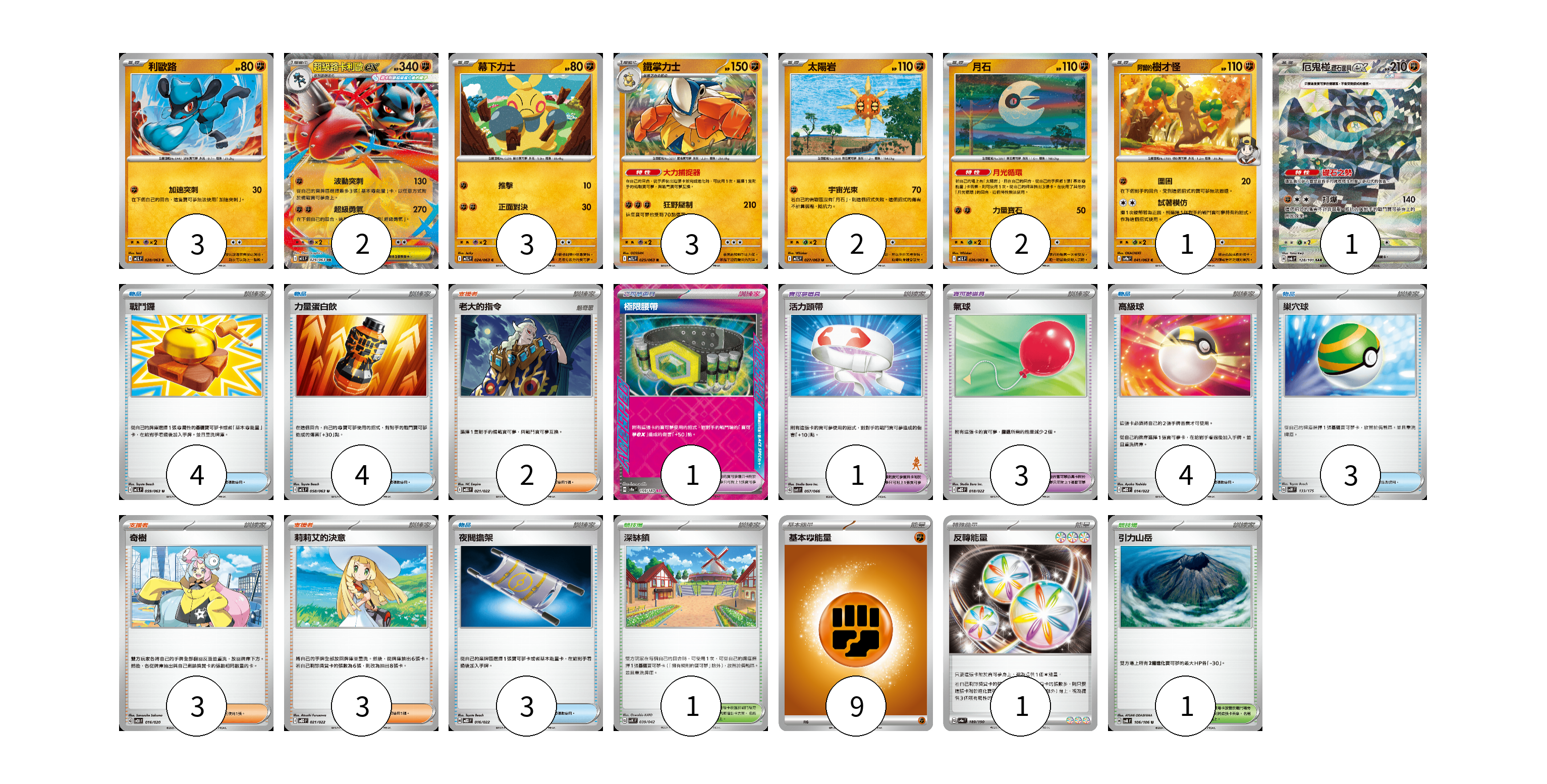 牌組構築方案 以此牌組為基礎新構築牌組 顯示卡面 顯示列表 寶可夢卡(17) 3 2 3 3 2 2 1 1 寶可夢道具(5) 1 1 3 物品卡(18) 4 4 4 3 3 支援者卡(8) 2 3 3 競技場卡(2) 1 1 能量卡(10) 9 1 寶可夢卡(17) 卡牌名稱 張數 卡牌名稱 張數 利歐路 M1L 028/063 03 超級路卡利歐ex M1L 029/063 02 幕下力士 M1L 024/063 03 鐵掌力士 M1L 025/063 03 太陽岩 M1L 027/063 02 月石 M1L 026/063 02 <阿響的>樹才怪 SV9a 041/063 01 厄鬼椪 礎石面具ex SV6 128/101 01 寶可夢道具(5) 卡牌名稱 張數 卡牌名稱 張數 極限腰帶 SV8a 159/187 01 活力頭帶 SVI 057/066 01 氣球 MBD 018/022 03 物品卡(18) 卡牌名稱 張數 卡牌名稱 張數 戰鬥鑼 M1L 059/063 04 力量蛋白飲 M1L 058/063 04 高級球 MBD 014/022 04 巢穴球 SVM 133/175 03 夜間擔架 MBD 016/022 03 支援者卡(8) 卡牌名稱 張數 卡牌名稱 張數 老大的指令 MBG 021/022 02 奇樹 SVOD 016/020 03 莉莉艾的決意 MBD 021/022 03 競技場卡(2) 卡牌名稱 張數 卡牌名稱 張數 深缽鎮 SVK 039/042 01 引力山岳 SV8 106/106 01 能量卡(10) 卡牌名稱 張數 卡牌名稱 張數 基本【鬥】能量 M-P FIG 09 反轉能量 SV4a 189/190 01 以此牌組為基礎新構築牌組 牌組編碼 bJschl-NZApkP-MVJSgn copy 列印牌組單 牌組編碼已複製 分享至SNS