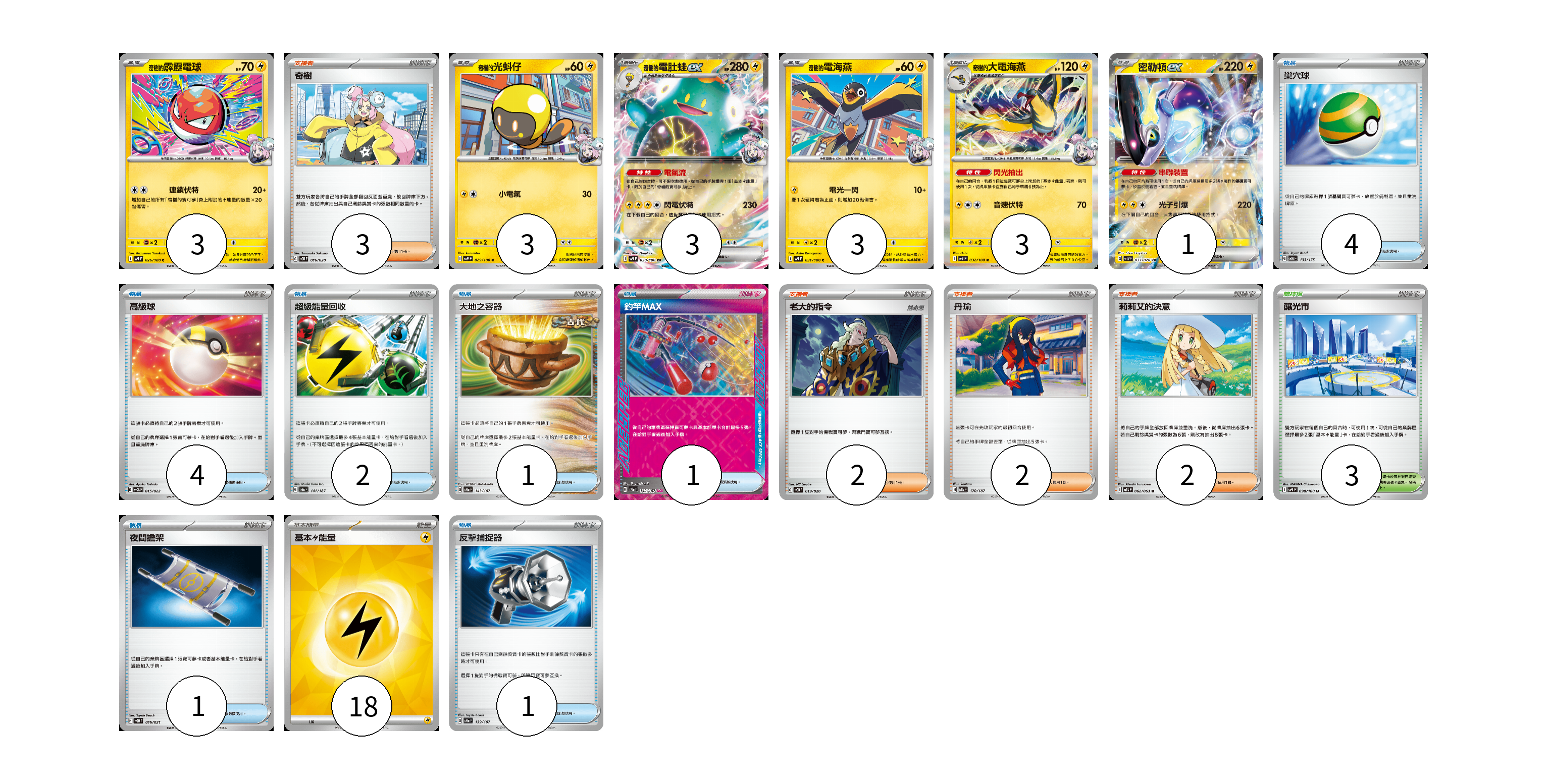 牌組構築方案 以此牌組為基礎新構築牌組 顯示卡面 顯示列表 寶可夢卡(16) 3 3 3 3 3 1 物品卡(14) 4 4 2 1 1 1 1 支援者卡(9) 3 2 2 2 競技場卡(3) 3 能量卡(18) 18 寶可夢卡(16) 卡牌名稱 張數 卡牌名稱 張數 奇樹的霹靂電球 SV9 026/100 03 奇樹的光蚪仔 SV9 029/100 03 奇樹的電肚蛙ex SV9 030/100 03 奇樹的電海燕 SV9 031/100 03 奇樹的大電海燕 SV9 032/100 03 密勒頓ex SV1V 037/078 01 物品卡(14) 卡牌名稱 張數 卡牌名稱 張數 巢穴球 SVM 133/175 04 高級球 SVQL 015/022 04 超級能量回收 SV8a 141/187 02 大地之容器 SV8a 143/187 01 釣竿MAX SV8a 142/187 01 夜間擔架 SVOM 016/021 01 反擊捕捉器 SV8a 139/187 01 支援者卡(9) 卡牌名稱 張數 卡牌名稱 張數 奇樹 SVOD 016/020 03 老大的指令 SVOD 019/020 02 丹瑜 SV8a 170/187 02 莉莉艾的決意 M1L 062/063 02 競技場卡(3) 卡牌名稱 張數 卡牌名稱 張數 釀光市 SV9 098/100 03 能量卡(18) 卡牌名稱 張數 卡牌名稱 張數 基本【雷】能量 SVQP LIG 18 以此牌組為基礎新構築牌組 牌組編碼 bQcpKm-JMWwZz-VOCUjz copy 列印牌組單 牌組編碼已複製 分享至SNS