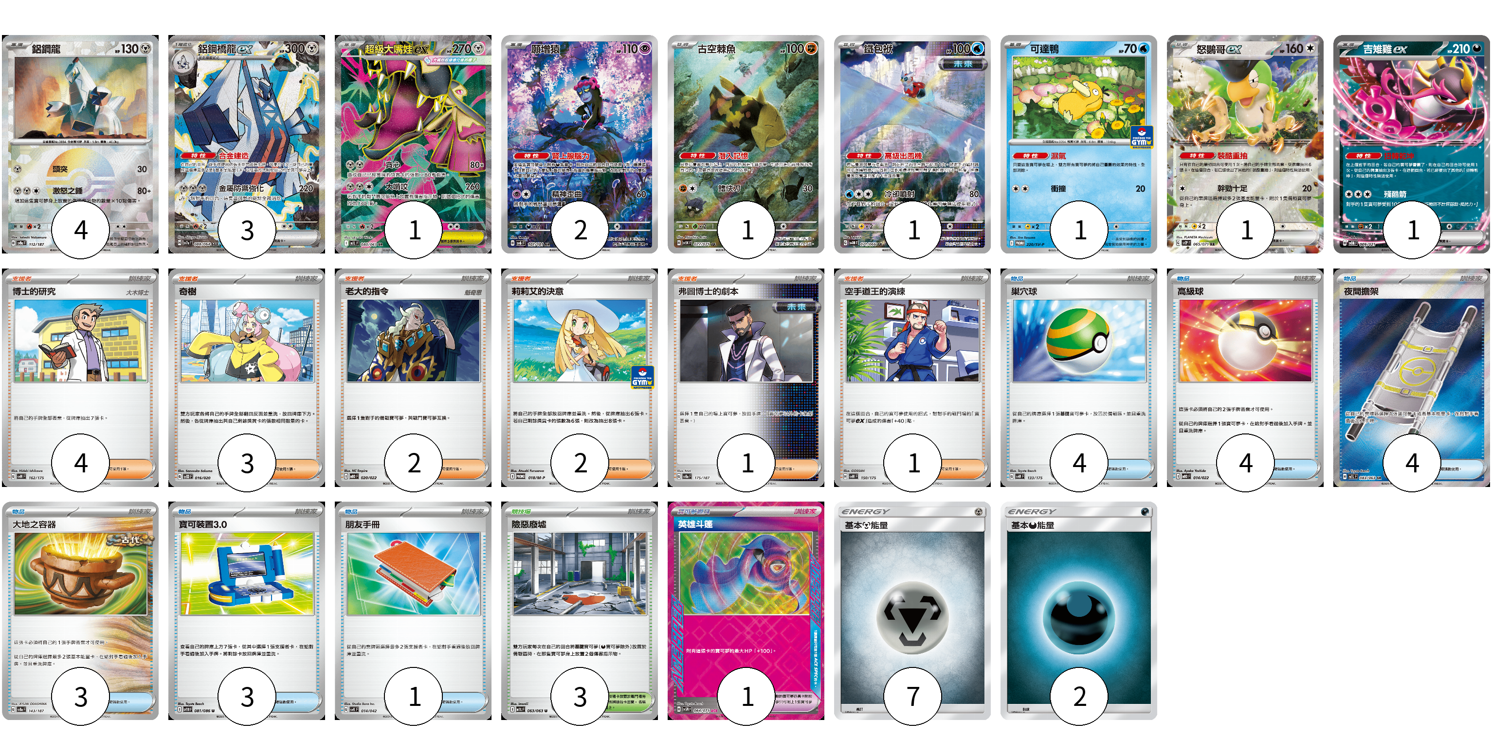 牌組構築方案 以此牌組為基礎新構築牌組 顯示卡面 顯示列表 寶可夢卡(15) 4 3 1 2 1 1 1 1 1 寶可夢道具(1) 1 物品卡(19) 4 4 4 3 3 1 支援者卡(13) 4 3 2 2 1 1 競技場卡(3) 3 能量卡(9) 7 2 寶可夢卡(15) 卡牌名稱 張數 卡牌名稱 張數 鋁鋼龍 SV8a 112/187 04 鋁鋼橋龍ex SV7a 088/064 03 超級大嘴娃ex M1L 080/063 01 願增猿 SV6 107/101 02 古空棘魚 SV5K 077/071 01 鐵包袱 SV4M 071/066 01 可達鴨 SV-P 220/SV-P 01 怒鸚哥ex SV2P 065/071 01 吉雉雞ex SVOM 009/021 01 寶可夢道具(1) 卡牌名稱 張數 卡牌名稱 張數 英雄斗篷 SV5M 064/071 01 物品卡(19) 卡牌名稱 張數 卡牌名稱 張數 巢穴球 SVM 133/175 04 高級球 MBD 014/022 04 夜間擔架 M1L 083/063 04 大地之容器 SV8a 143/187 03 寶可裝置3.0 SV11B 081/086 03 朋友手冊 SVK 014/042 01 支援者卡(13) 卡牌名稱 張數 卡牌名稱 張數 博士的研究 SVM 162/175 04 奇樹 SVOD 016/020 03 老大的指令 MBD 020/022 02 莉莉艾的決意 M-P 018/M-P 02 弗圖博士的劇本 SV8a 175/187 01 空手道王的演練 SVM 150/175 01 競技場卡(3) 卡牌名稱 張數 卡牌名稱 張數 險惡廢墟 M1L 063/063 03 能量卡(9) 卡牌名稱 張數 卡牌名稱 張數 基本鋼能量 AS6D MET 07 基本惡能量 AS6D DAR 02 以此牌組為基礎新構築牌組 牌組編碼 bSFsvo-OdTBwo-UUhJOu copy 列印牌組單 牌組編碼已複製 分享至SNS