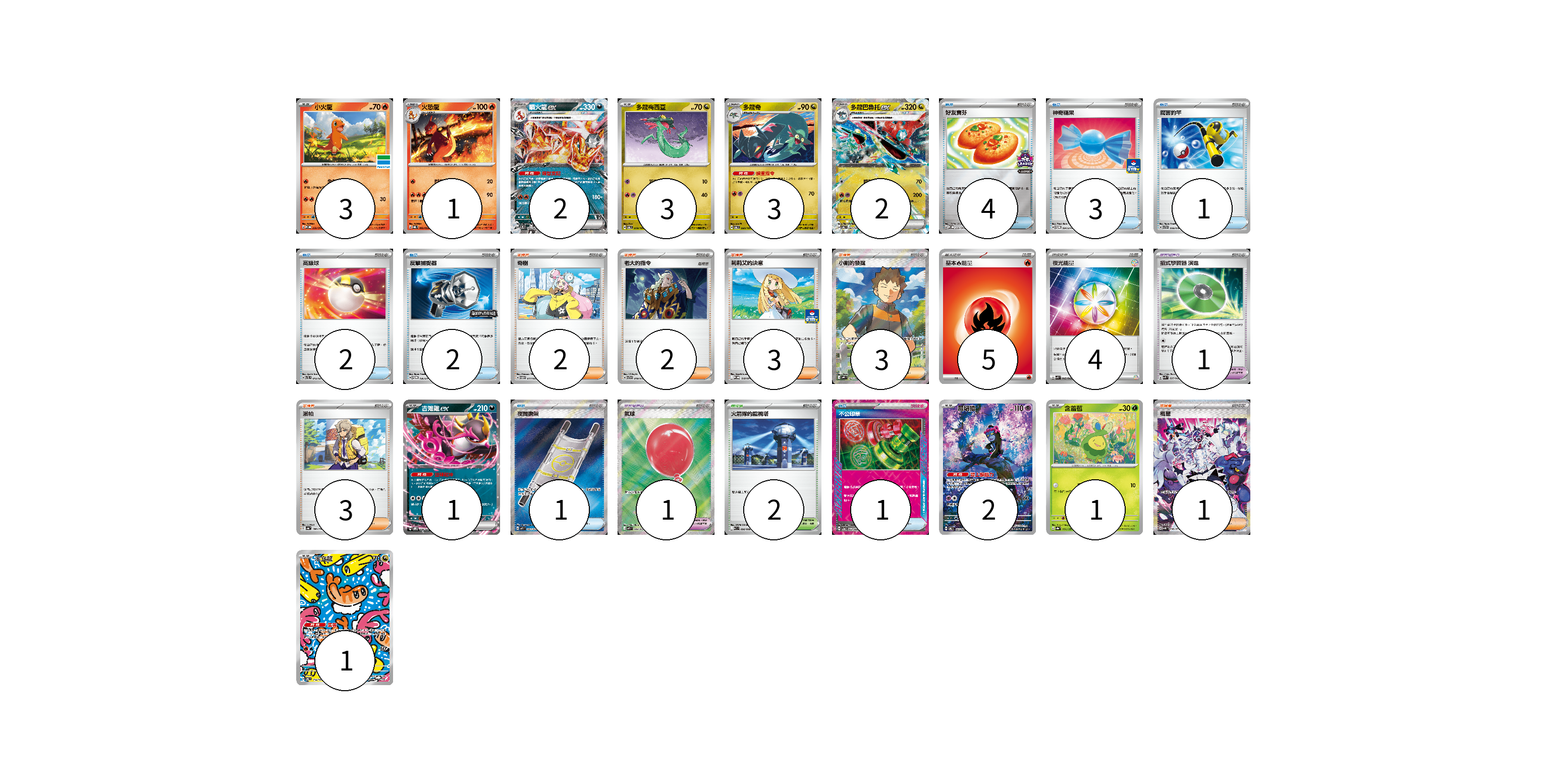 牌組構築方案 以此牌組為基礎新構築牌組 顯示卡面 顯示列表 寶可夢卡(19) 3 1 2 3 3 2 1 2 1 1 寶可夢道具(2) 1 1 物品卡(14) 4 3 1 2 2 1 1 支援者卡(14) 2 2 3 3 3 1 競技場卡(2) 2 能量卡(9) 5 4 寶可夢卡(19) 卡牌名稱 張數 卡牌名稱 張數 小火龍 SV-P 232/SV-P 03 火恐龍 SVQL 002/022 01 噴火龍ex SVTL 006/021 02 多龍梅西亞 SV6 079/101 03 多龍奇 SV6 080/101 03 多龍巴魯托ex SV6 081/101 02 吉雉雞ex SVOM 009/021 01 願增猿 SV6 107/101 02 含羞苞 SV8a 001/187 01 米立龍 SV6 112/101 01 寶可夢道具(2) 卡牌名稱 張數 卡牌名稱 張數 招式學習器 演進 SVK 025/042 01 氣球 M1L 084/063 01 物品卡(14) 卡牌名稱 張數 卡牌名稱 張數 好友寶芬 SV-P 230/SV-P 04 神奇糖果 SV-P 104/SV-P 03 厲害釣竿 SVTH 008/018 01 高級球 SVTL 012/021 02 反擊捕捉器 SV-P 136/SV-P 02 夜間擔架 M1L 083/063 01 不公印章 SV5a 053/066 01 支援者卡(14) 卡牌名稱 張數 卡牌名稱 張數 奇樹 SVTM 017/022 02 老大的指令 SVTG 019/019 02 莉莉艾的決意 M-P 018/M-P 03 小剛的發掘 SV9 123/100 03 派帕 SV4a 180/190 03 枇琶 SV5K 096/071 01 競技場卡(2) 卡牌名稱 張數 卡牌名稱 張數 火箭隊的監視塔 SV10 096/098 02 能量卡(9) 卡牌名稱 張數 卡牌名稱 張數 基本火能量 sv-p FIR 05 夜光能量 SVK 042/042 04 以此牌組為基礎新構築牌組 牌組編碼 bSeFcZ-UYMktZ-YYfPRt copy 列印牌組單 牌組編碼已複製 分享至SNS