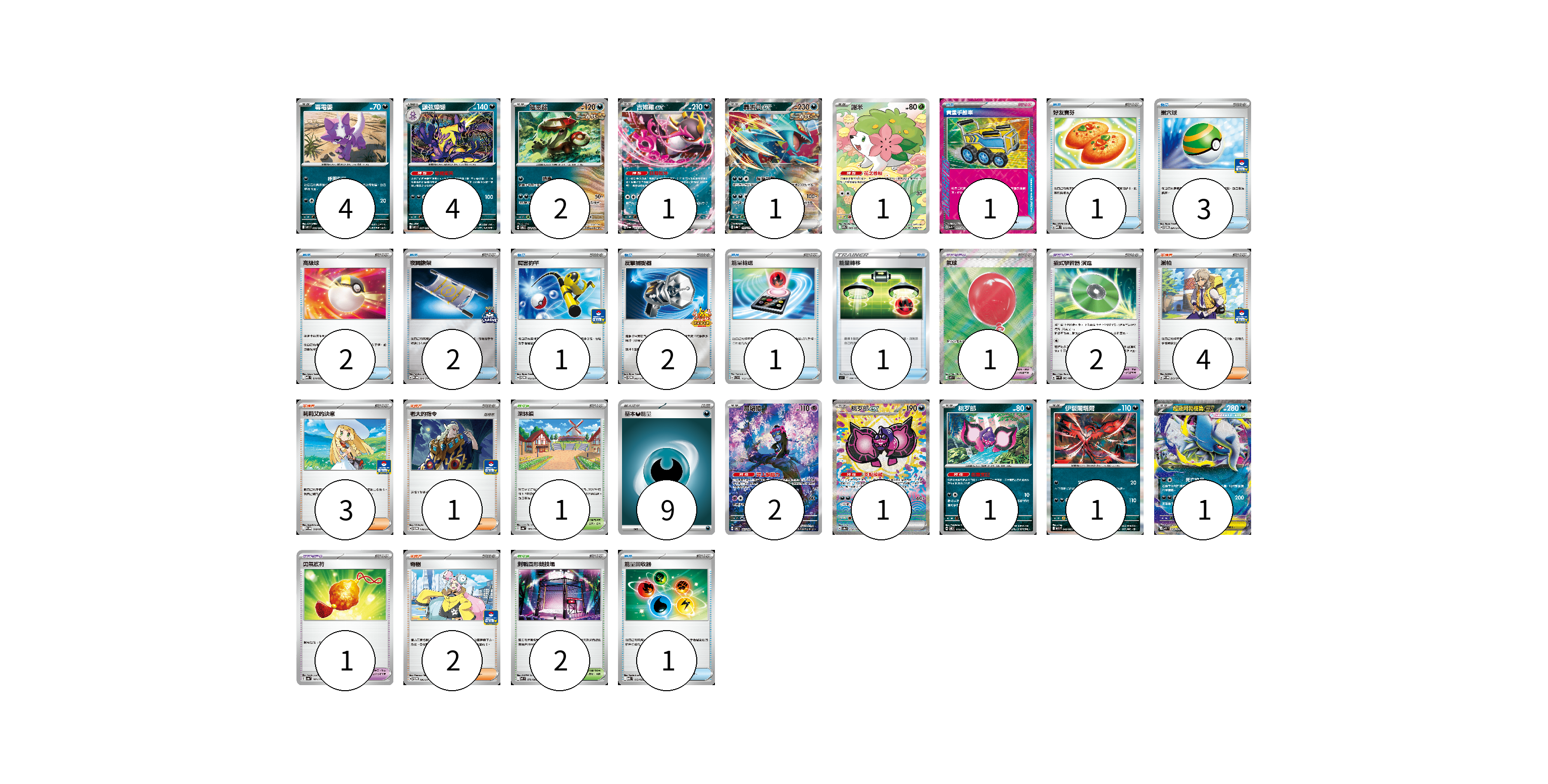 牌組構築方案 以此牌組為基礎新構築牌組 顯示卡面 顯示列表 寶可夢卡(19) 4 4 2 1 1 1 2 1 1 1 1 寶可夢道具(4) 1 2 1 物品卡(15) 1 1 3 2 2 1 2 1 1 1 支援者卡(10) 4 3 1 2 競技場卡(3) 1 2 能量卡(9) 9 寶可夢卡(19) 卡牌名稱 張數 卡牌名稱 張數 毒電嬰 M2 056/080 04 顫弦蠑螈 M2 057/080 04 猛惡菇 SV6 071/101 02 吉雉雞ex SV6a 038/064 01 轟鳴月ex SV8a 101/187 01 謝米 SV9a 066/063 01 願增猿 SV6 107/101 02 桃歹郎ex SV8a 219/187 01 桃歹郎 SV8 075/106 01 伊裴爾塔爾 M1L 040/063 01 超級阿勃梭魯ex M1L 038/063 01 寶可夢道具(4) 卡牌名稱 張數 卡牌名稱 張數 氣球 M1L 084/063 01 招式學習器 演進 SV4M 063/066 02 勇氣護符 SV4a 169/190 01 物品卡(15) 卡牌名稱 張數 卡牌名稱 張數 貴重手推車 SVK 020/042 01 好友寶芬 MBD 013/022 01 巢穴球 SV-P 091/SV-P 03 高級球 MBD 014/022 02 夜間擔架 SV-P 204/SV-P 02 厲害釣竿 SV-P 112/SV-P 01 反擊捕捉器 SV-P 083/SV-P 02 能量輸送 SVD 112/139 01 能量轉移 SI 366/414 01 能量回收器 MBD 012/022 01 支援者卡(10) 卡牌名稱 張數 卡牌名稱 張數 派帕 SV-P 213/SV-P 04 莉莉艾的決意 M-P 018/M-P 03 老大的指令 SV-P 178/SV-P 01 奇樹 SV-P 106/SV-P 02 競技場卡(3) 卡牌名稱 張數 卡牌名稱 張數 深缽鎮 SV4a 185/190 01 對戰圓形競技場 M2 079/080 02 能量卡(9) 卡牌名稱 張數 卡牌名稱 張數 基本惡能量 sv-p DAR 09 以此牌組為基礎新構築牌組 牌組編碼 bVbJMW-HhsGGf-VIFdXI copy 列印牌組單 牌組編碼已複製 分享至SNS