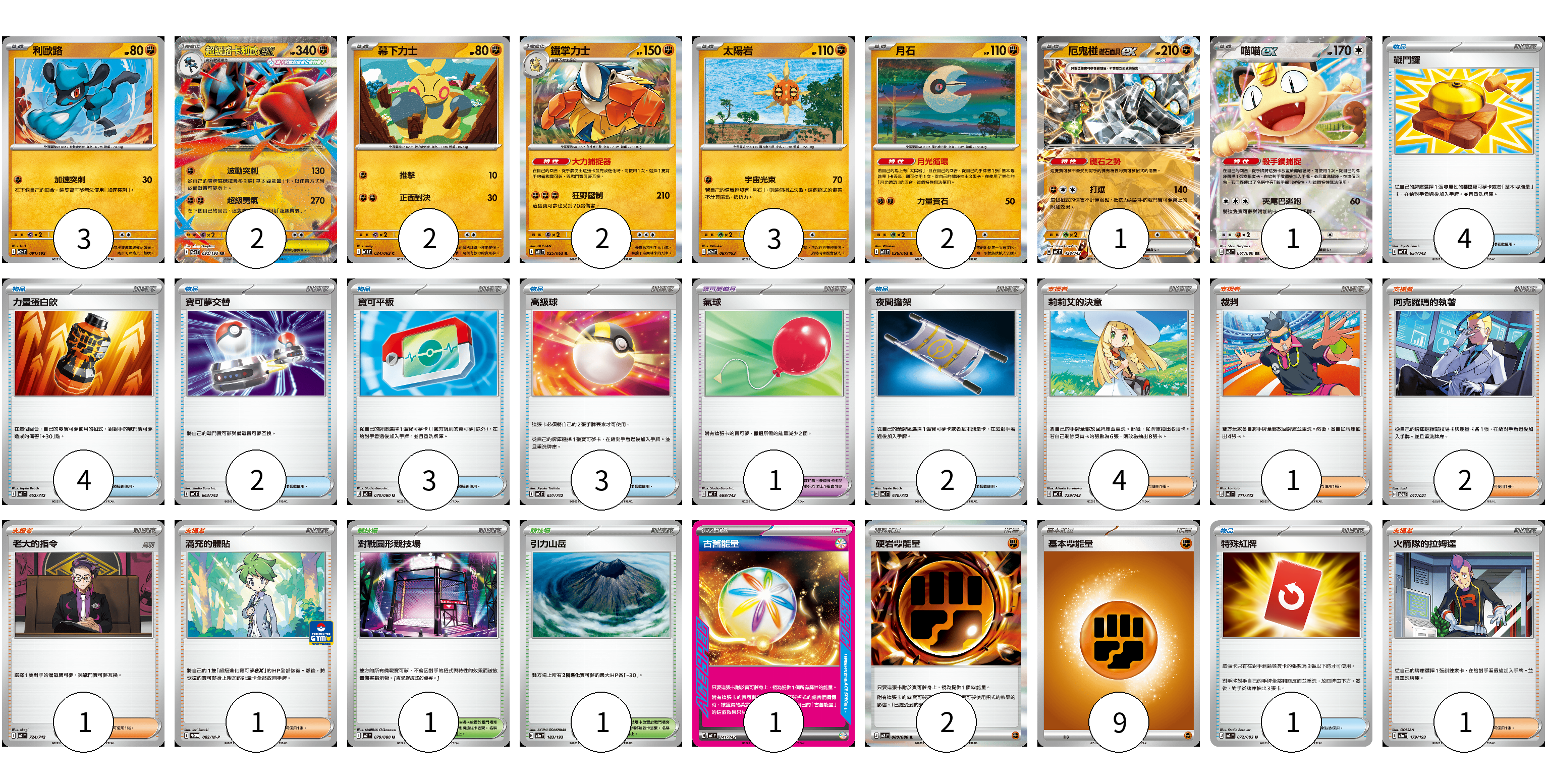 牌組構築方案 以此牌組為基礎新構築牌組 顯示卡面 顯示列表 寶可夢卡(16) 3 2 2 2 3 2 1 1 寶可夢道具(1) 1 物品卡(19) 4 4 2 3 3 2 1 支援者卡(10) 4 1 2 1 1 1 競技場卡(2) 1 1 能量卡(12) 1 2 9 寶可夢卡(16) 卡牌名稱 張數 卡牌名稱 張數 利歐路 M2a 091/193 03 超級路卡利歐ex M2a 092/193 02 幕下力士 M1L 024/063 02 鐵掌力士 M1L 025/063 02 太陽岩 M2a 087/193 03 月石 M1L 026/063 02 厄鬼椪 礎石面具ex MC 428/742 01 喵喵ex M3 061/080 01 寶可夢道具(1) 卡牌名稱 張數 卡牌名稱 張數 氣球 MC 688/742 01 物品卡(19) 卡牌名稱 張數 卡牌名稱 張數 戰鬥鑼 MC 654/742 04 力量蛋白飲 MC 652/742 04 寶可夢交替 MC 663/742 02 寶可平板 M3 070/080 03 高級球 MC 651/742 03 夜間擔架 MC 670/742 02 特殊紅牌 M4 072/083 01 支援者卡(10) 卡牌名稱 張數 卡牌名稱 張數 莉莉艾的決意 MC 729/742 04 裁判 MC 711/742 01 阿克羅瑪的執著 SVOM 017/021 02 老大的指令 MC 724/742 01 滿充的體貼 M-P 082/M-P 01 火箭隊的拉姆達 M2a 179/193 01 競技場卡(2) 卡牌名稱 張數 卡牌名稱 張數 對戰圓形競技場 M2 079/080 01 引力山岳 M2a 183/193 01 能量卡(12) 卡牌名稱 張數 卡牌名稱 張數 古舊能量 MC 741/742 01 硬岩【鬥】能量 M3 080/080 02 基本【鬥】能量 MC FIG 09 以此牌組為基礎新構築牌組 牌組編碼 bXwnso-MaWMBY-USBgzn copy 列印牌組單 牌組編碼已複製 分享至SNS