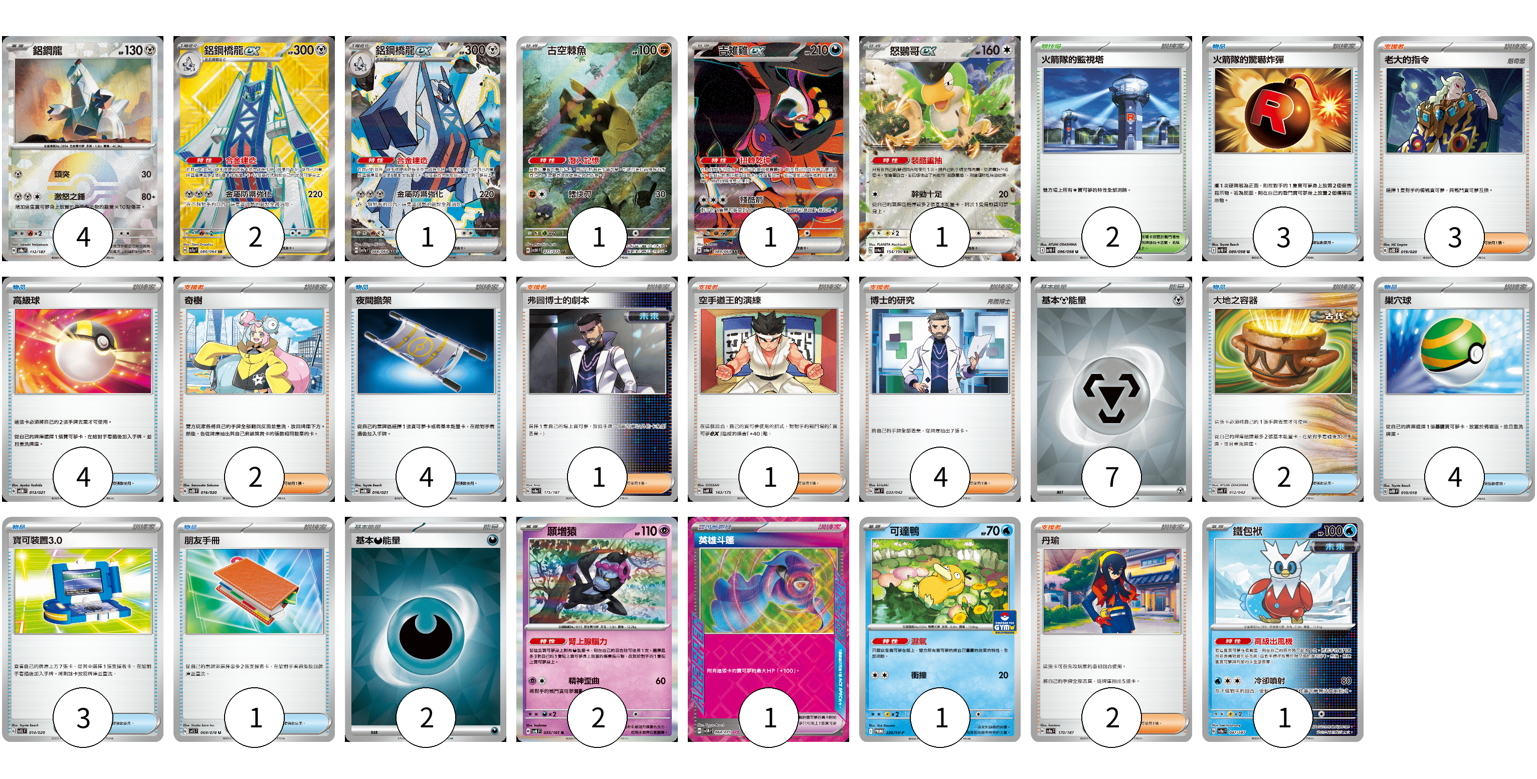 牌組構築方案 以此牌組為基礎新構築牌組 顯示卡面 顯示列表 寶可夢卡(14) 4 2 1 1 1 1 2 1 1 寶可夢道具(1) 1 物品卡(21) 3 4 4 2 4 3 1 支援者卡(13) 3 2 1 1 4 2 競技場卡(2) 2 能量卡(9) 7 2 寶可夢卡(14) 卡牌名稱 張數 卡牌名稱 張數 鋁鋼龍 SV8a 112/187 04 鋁鋼橋龍ex SV7a 080/064 02 鋁鋼橋龍ex SV7a 088/064 01 古空棘魚 SV5K 077/071 01 吉雉雞ex SV6a 089/064 01 怒鸚哥ex SV4a 154/190 01 願增猿 SV6 055/101 02 可達鴨 SV-P 220/SV-P 01 鐵包袱 SV8a 047/187 01 寶可夢道具(1) 卡牌名稱 張數 卡牌名稱 張數 英雄斗篷 SV5M 064/071 01 物品卡(21) 卡牌名稱 張數 卡牌名稱 張數 火箭隊的驚嚇炸彈 SV10 089/098 03 高級球 SVOM 013/021 04 夜間擔架 SVOM 016/021 04 大地之容器 SVK 012/042 02 巢穴球 SVTH 010/018 04 寶可裝置3.0 SVEL 014/020 03 朋友手冊 SV1S 069/078 01 支援者卡(13) 卡牌名稱 張數 卡牌名稱 張數 老大的指令 SVOD 019/020 03 奇樹 SVOD 016/020 02 弗圖博士的劇本 SV8a 175/187 01 空手道王的演練 SVM 143/175 01 博士的研究 SVK 033/042 04 丹瑜 SV8a 170/187 02 競技場卡(2) 卡牌名稱 張數 卡牌名稱 張數 火箭隊的監視塔 SV10 096/098 02 能量卡(9) 卡牌名稱 張數 卡牌名稱 張數 基本【鋼】能量 SVM MET 07 基本【惡】能量 SVOM DAR 02 以此牌組為基礎新構築牌組 牌組編碼 bYOcOy-DoCNwM-eNHdqe copy 列印牌組單 牌組編碼已複製 分享至SNS