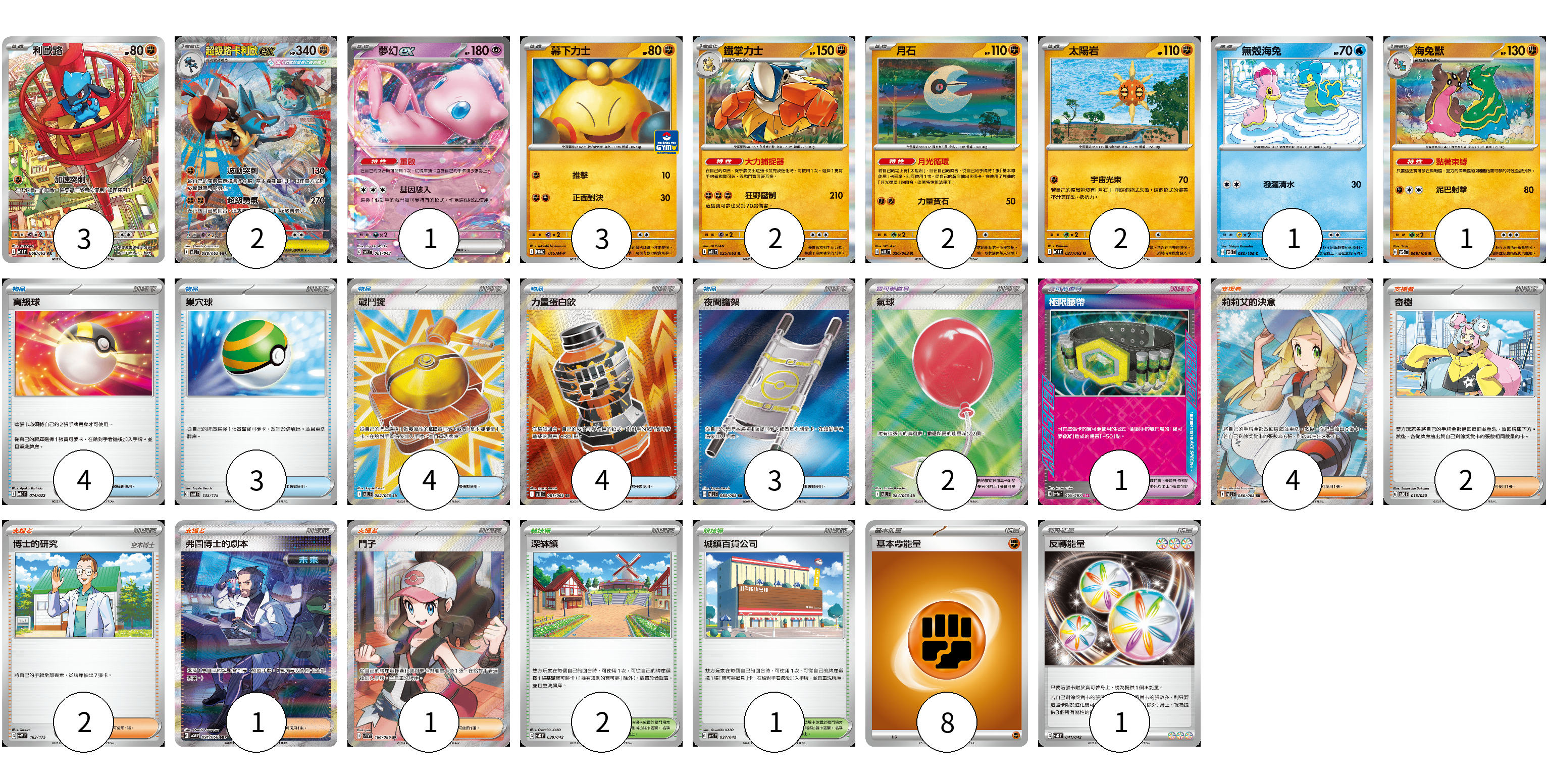牌組構築方案 以此牌組為基礎新構築牌組 顯示卡面 顯示列表 寶可夢卡(17) 3 2 1 3 2 2 2 1 1 寶可夢道具(3) 2 1 物品卡(18) 4 3 4 4 3 支援者卡(10) 4 2 2 1 1 競技場卡(3) 2 1 能量卡(9) 8 1 寶可夢卡(17) 卡牌名稱 張數 卡牌名稱 張數 利歐路 M1L 068/063 03 超級路卡利歐ex M1L 088/063 02 夢幻ex SVK 001/042 01 幕下力士 M-P 015/M-P 03 鐵掌力士 M1L 025/063 02 月石 M1L 026/063 02 太陽岩 M1L 027/063 02 無殼海兔 SV8 030/106 01 海兔獸 SV8 066/106 01 寶可夢道具(3) 卡牌名稱 張數 卡牌名稱 張數 氣球 M1L 084/063 02 極限腰帶 SV8a 159/187 01 物品卡(18) 卡牌名稱 張數 卡牌名稱 張數 高級球 MBD 014/022 04 巢穴球 SVM 133/175 03 戰鬥鑼 M1L 082/063 04 力量蛋白飲 M1L 081/063 04 夜間擔架 M1L 083/063 03 支援者卡(10) 卡牌名稱 張數 卡牌名稱 張數 莉莉艾的決意 M1L 086/063 04 奇樹 SVOD 016/020 02 博士的研究 SVM 163/175 02 弗圖博士的劇本 SV4M 091/066 01 鬥子 SV11W 166/086 01 競技場卡(3) 卡牌名稱 張數 卡牌名稱 張數 深缽鎮 SVK 039/042 02 城鎮百貨公司 SVK 037/042 01 能量卡(9) 卡牌名稱 張數 卡牌名稱 張數 基本鬥能量 sv-p FIG 08 反轉能量 SVK 041/042 01 以此牌組為基礎新構築牌組 牌組編碼 bdmIZp-asWlTC-CwSyYh copy 列印牌組單 牌組編碼已複製 分享至SNS