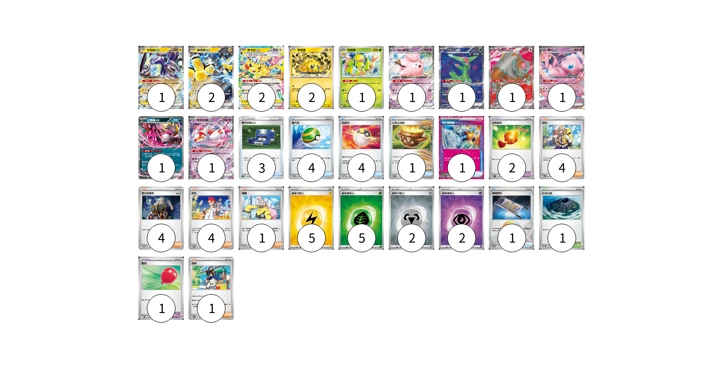 牌組構築方案 以此牌組為基礎新構築牌組 顯示卡面 顯示列表 寶可夢卡(14) 1 2 2 2 1 1 1 1 1 1 1 寶可夢道具(3) 2 1 物品卡(14) 3 4 4 1 1 1 支援者卡(14) 4 4 4 1 1 競技場卡(1) 1 能量卡(14) 5 5 2 2 寶可夢卡(14) 卡牌名稱 張數 卡牌名稱 張數 密勒頓ex SV4a 071/190 01 鐵臂膀ex SV8a 054/187 02 皮卡丘ex SV-P 185/SV-P 02 電電蟲 SV7 032/102 02 電蜘蛛 SV6a 002/064 01 莉莉艾的皮皮ex SV9 033/100 01 鐵斑葉ex SV5M 084/071 01 月月熊 赫月 ex SV5a 084/066 01 夢幻ex SVK 001/042 01 吉雉雞ex SVOD 004/020 01 拉帝亞斯ex SV7a 019/064 01 寶可夢道具(3) 卡牌名稱 張數 卡牌名稱 張數 勇氣護符 SVM 142/175 02 氣球 MBD 018/022 01 物品卡(14) 卡牌名稱 張數 卡牌名稱 張數 寶可齒輪3.0 SLD 014/020 03 巢穴球 SVTG 012/019 04 高級球 SVOD 012/020 04 大地之容器 SV8a 143/187 01 頂尖捕捉器 SV8a 148/187 01 夜間擔架 SV8a 151/187 01 支援者卡(14) 卡牌名稱 張數 卡牌名稱 張數 派帕 SV4a 180/190 04 老大的指令 SVTH 017/018 04 赤松 SV8a 163/187 04 奇樹 SVOM 018/021 01 烏栗 SV8a 169/187 01 競技場卡(1) 卡牌名稱 張數 卡牌名稱 張數 引力山岳 SV8 106/106 01 能量卡(14) 卡牌名稱 張數 卡牌名稱 張數 基本【雷】能量 SVK LIG 05 基本【草】能量 SVK GRA 05 基本【鋼】能量 SVOD MET 02 基本【超】能量 SVOD PSY 02 以此牌組為基礎新構築牌組 牌組編碼 beQtZF-HdVkKB-lcwonZ copy 列印牌組單 牌組編碼已複製 分享至SNS