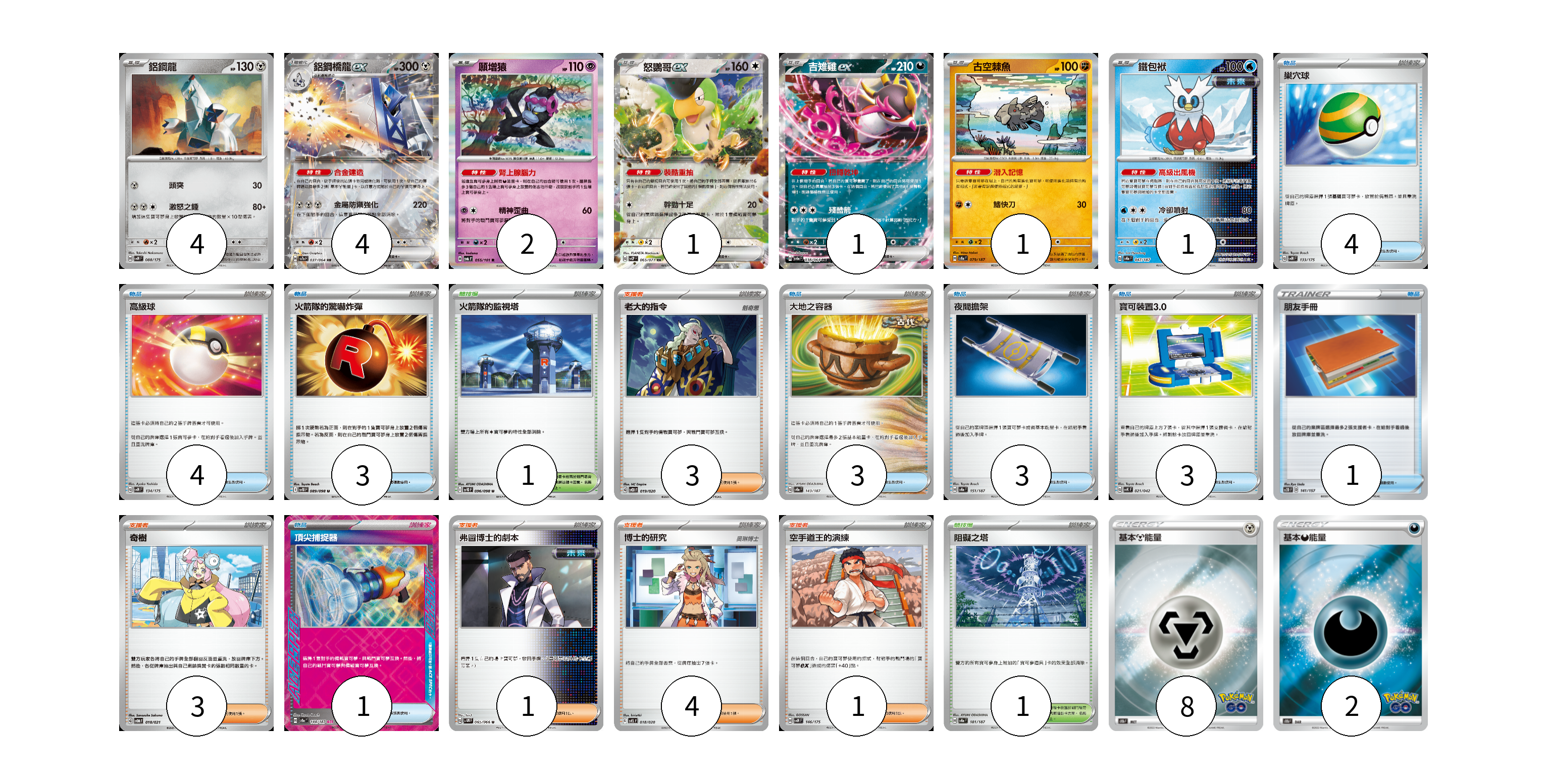牌組構築方案 以此牌組為基礎新構築牌組 顯示卡面 顯示列表 寶可夢卡(14) 4 4 2 1 1 1 1 物品卡(22) 4 4 3 3 3 3 1 1 支援者卡(12) 3 3 1 4 1 競技場卡(2) 1 1 能量卡(10) 8 2 寶可夢卡(14) 卡牌名稱 張數 卡牌名稱 張數 鋁鋼龍 SVM 088/175 04 鋁鋼橋龍ex SV7a 037/064 04 願增猿 SV6 055/101 02 怒鸚哥ex SV2P 065/071 01 吉雉雞ex SV6a 038/064 01 古空棘魚 SV8a 079/187 01 鐵包袱 SV8a 047/187 01 物品卡(22) 卡牌名稱 張數 卡牌名稱 張數 巢穴球 SVM 133/175 04 高級球 SVM 134/175 04 火箭隊的驚嚇炸彈 SV10 089/098 03 大地之容器 SV8a 143/187 03 夜間擔架 SV8a 151/187 03 寶可裝置3.0 SVK 021/042 03 朋友手冊 SC2D 141/157 01 頂尖捕捉器 SV8a 148/187 01 支援者卡(12) 卡牌名稱 張數 卡牌名稱 張數 老大的指令 SVOD 019/020 03 奇樹 SVOM 018/021 03 弗圖博士的劇本 SV4M 065/066 01 博士的研究 SVEL 018/020 04 空手道王的演練 SVM 146/175 01 競技場卡(2) 卡牌名稱 張數 卡牌名稱 張數 火箭隊的監視塔 SV10 096/098 01 阻礙之塔 SV8a 181/187 01 能量卡(10) 卡牌名稱 張數 卡牌名稱 張數 基本鋼能量 S10b MET 08 基本惡能量 S10b DAR 02 以此牌組為基礎新構築牌組 牌組編碼 begDwt-lohqdf-GBWwuD copy 列印牌組單 牌組編碼已複製 分享至SNS