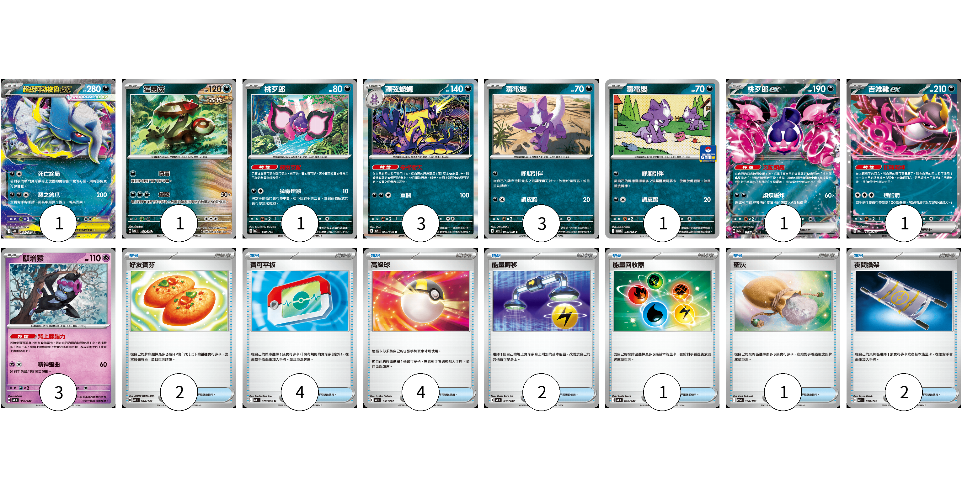 牌組構築方案 以此牌組為基礎新構築牌組 顯示卡面 顯示列表 寶可夢卡(15) 1 1 1 3 3 1 1 1 3 物品卡(16) 2 4 4 2 1 1 2 寶可夢卡(15) 卡牌名稱 張數 卡牌名稱 張數 超級阿勃梭魯ex M1L 038/063 01 猛惡菇 MC 487/742 01 桃歹郎 MC 490/742 01 顫弦蠑螈 M2 057/080 03 毒電嬰 M2 056/080 03 毒電嬰 M-P 044/M-P 01 桃歹郎ex SV8a 105/187 01 吉雉雞ex MC 489/742 01 願增猿 MC 358/742 03 物品卡(16) 卡牌名稱 張數 卡牌名稱 張數 好友寶芬 MC 648/742 02 寶可平板 M3 070/080 04 高級球 MC 651/742 04 能量轉移 MC 638/742 02 能量回收器 MC 640/742 01 聖灰 M2a 150/193 01 夜間擔架 MC 670/742 02 以此牌組為基礎新構築牌組 牌組編碼 bfuRyh-yHiqkO-SRizBj copy 列印牌組單 牌組編碼已複製 分享至SNS