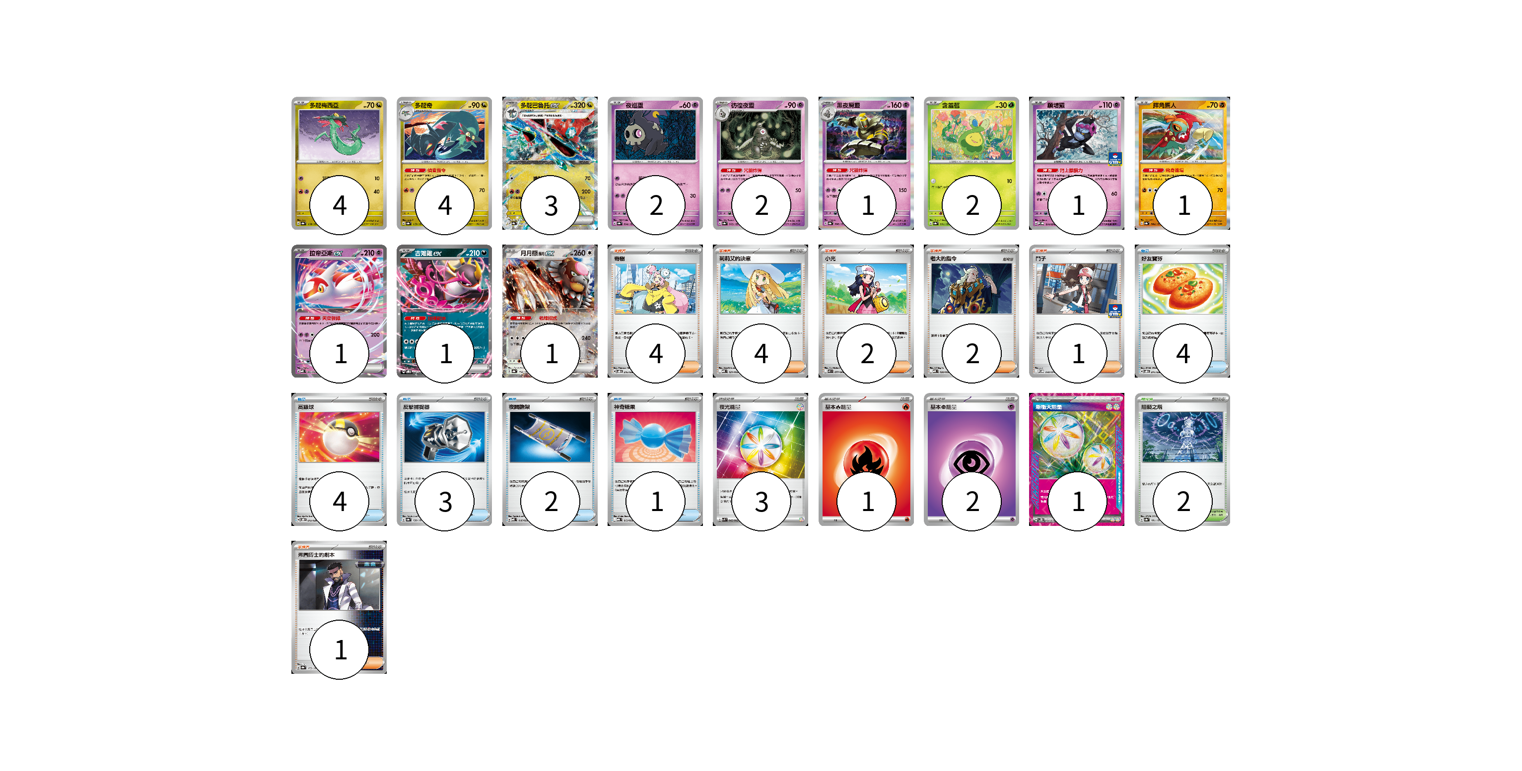 牌組構築方案 以此牌組為基礎新構築牌組 顯示卡面 顯示列表 寶可夢卡(23) 4 4 3 2 2 1 2 1 1 1 1 1 物品卡(14) 4 4 3 2 1 支援者卡(14) 4 4 2 2 1 1 競技場卡(2) 2 能量卡(7) 3 1 2 1 寶可夢卡(23) 卡牌名稱 張數 卡牌名稱 張數 多龍梅西亞 SV8a 118/187 04 多龍奇 SV8a 119/187 04 多龍巴魯托ex SV8a 120/187 03 夜巡靈 SV8a 064/187 02 彷徨夜靈 SV8a 065/187 02 黑夜魔靈 SV8a 066/187 01 含羞苞 SV8a 001/187 02 願增猿 M-P 014/M-P 01 摔角鷹人 SV8a 084/187 01 拉帝亞斯ex MBD 003/022 01 吉雉雞ex SVOD 004/020 01 月月熊 赫月ex SV8a 134/187 01 物品卡(14) 卡牌名稱 張數 卡牌名稱 張數 好友寶芬 SVOD 011/020 04 高級球 SVOD 012/020 04 反擊捕捉器 SV8a 139/187 03 夜間擔架 MBD 016/022 02 神奇糖果 MBG 013/022 01 支援者卡(14) 卡牌名稱 張數 卡牌名稱 張數 奇樹 SVOD 016/020 04 莉莉艾的決意 MBD 021/022 04 小光 M2 077/080 02 老大的指令 MBD 020/022 02 鬥子 M-P 048/M-P 01 弗圖博士的劇本 SV8a 175/187 01 競技場卡(2) 卡牌名稱 張數 卡牌名稱 張數 阻礙之塔 SV8a 181/187 02 能量卡(7) 卡牌名稱 張數 卡牌名稱 張數 夜光能量 SVK 042/042 03 基本火能量 sv-p FIR 01 基本超能量 sv-p PSY 02 新衝天能量 SV5K 071/071 01 以此牌組為基礎新構築牌組 牌組編碼 bgjdrq-CmYWdj-wBaeNd copy 列印牌組單 牌組編碼已複製 分享至SNS