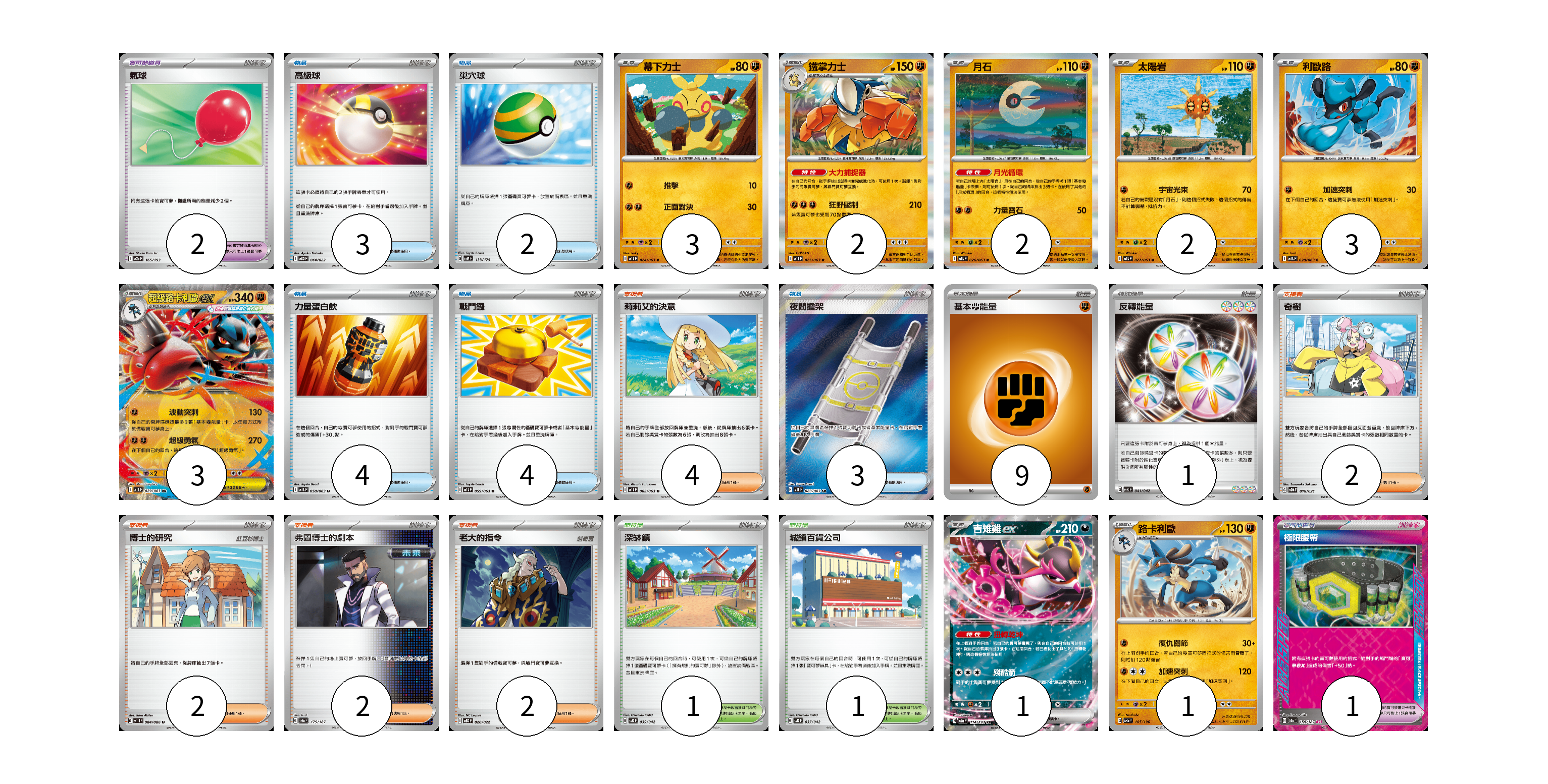 牌組構築方案 以此牌組為基礎新構築牌組 顯示卡面 顯示列表 寶可夢卡(17) 3 2 2 2 3 3 1 1 寶可夢道具(3) 2 1 物品卡(16) 3 2 4 4 3 支援者卡(12) 4 2 2 2 2 競技場卡(2) 1 1 能量卡(10) 9 1 寶可夢卡(17) 卡牌名稱 張數 卡牌名稱 張數 幕下力士 M1L 024/063 03 鐵掌力士 M1L 025/063 02 月石 M1L 026/063 02 太陽岩 M1L 027/063 02 利歐路 M1L 028/063 03 超級路卡利歐ex M1L 029/063 03 吉雉雞ex M2a 114/193 01 路卡利歐 SV4a 105/190 01 寶可夢道具(3) 卡牌名稱 張數 卡牌名稱 張數 氣球 M2a 165/193 02 極限腰帶 SV8a 159/187 01 物品卡(16) 卡牌名稱 張數 卡牌名稱 張數 高級球 MBD 014/022 03 巢穴球 SVM 133/175 02 力量蛋白飲 M1L 058/063 04 戰鬥鑼 M1L 059/063 04 夜間擔架 M1L 083/063 03 支援者卡(12) 卡牌名稱 張數 卡牌名稱 張數 莉莉艾的決意 M1L 062/063 04 奇樹 SVOM 018/021 02 博士的研究 SV11B 084/086 02 弗圖博士的劇本 SV8a 175/187 02 老大的指令 MBD 020/022 02 競技場卡(2) 卡牌名稱 張數 卡牌名稱 張數 深缽鎮 SVK 039/042 01 城鎮百貨公司 SVK 037/042 01 能量卡(10) 卡牌名稱 張數 卡牌名稱 張數 基本鬥能量 sv-p FIG 09 反轉能量 SVK 041/042 01 以此牌組為基礎新構築牌組 牌組編碼 bgrJQR-rdfNUR-ftzSzQ copy 列印牌組單 牌組編碼已複製 分享至SNS