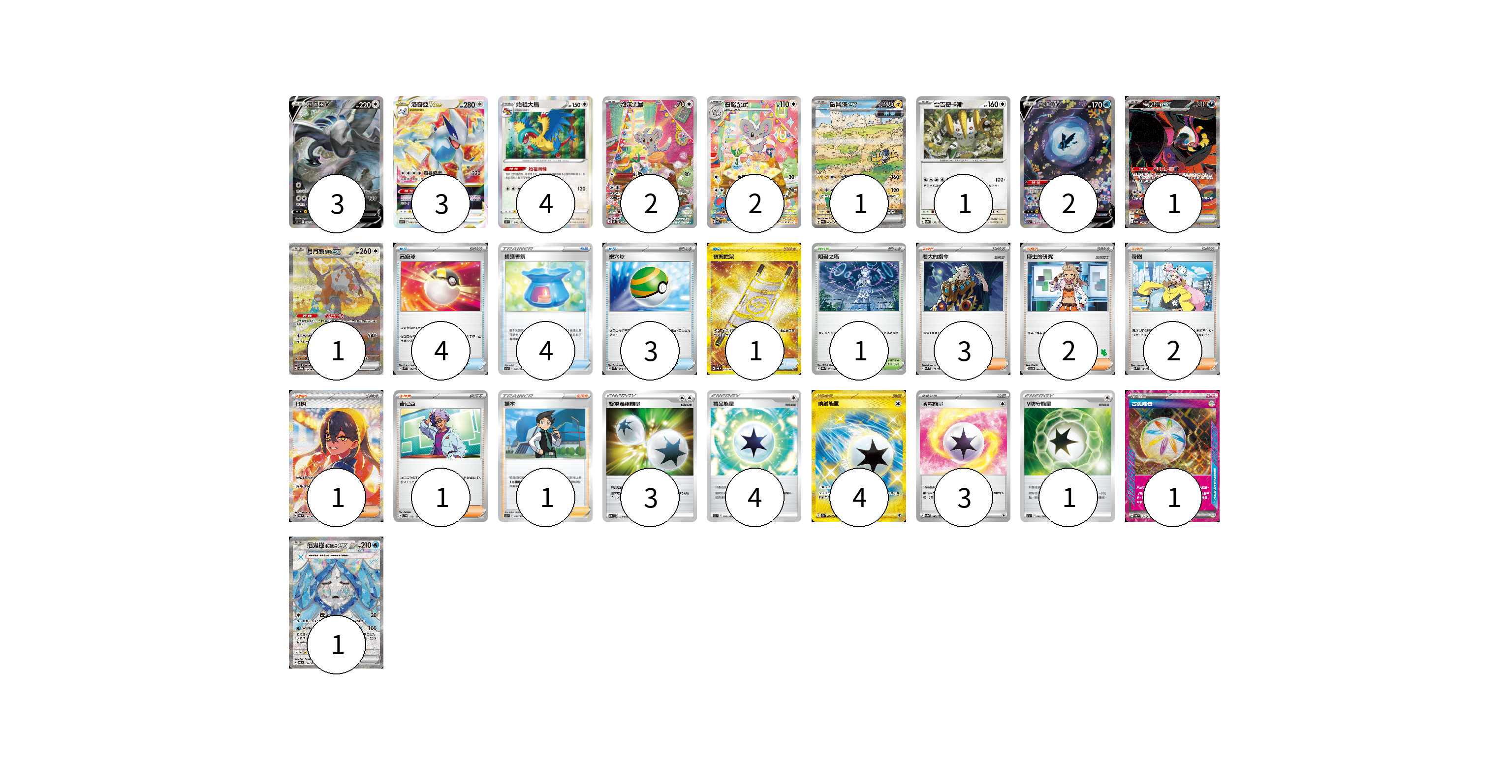 牌組構築方案 以此牌組為基礎新構築牌組 顯示卡面 顯示列表 寶可夢卡(21) 3 3 4 2 2 1 1 2 1 1 1 物品卡(12) 4 4 3 1 支援者卡(10) 3 2 2 1 1 1 競技場卡(1) 1 能量卡(16) 3 4 4 3 1 1 寶可夢卡(21) 卡牌名稱 張數 卡牌名稱 張數 洛奇亞V S12 110/098 03 洛奇亞VSTAR S12 080/098 03 始祖大鳥 S12 083/098 04 泡沫栗鼠 SV5K 082/071 02 奇諾栗鼠 SV5K 083/071 02 鐵臂膀ex SV4M 088/066 01 雷吉奇卡斯 SV8a 132/187 01 霓虹魚V S12a 216/172 02 吉雉雞ex SV6a 089/064 01 月月熊 赫月 ex SV5a 091/066 01 厄鬼椪 水井面具ex SV6 117/101 01 物品卡(12) 卡牌名稱 張數 卡牌名稱 張數 高級球 SVM 134/175 04 捕獲香氛 S11a 060/068 04 巢穴球 SVM 133/175 03 夜間擔架 SV8 137/106 01 支援者卡(10) 卡牌名稱 張數 卡牌名稱 張數 老大的指令 SVM 172/175 03 博士的研究 SVI 063/066 02 奇樹 SVM 160/175 02 丹瑜 SV6 130/101 01 吉尼亞 SVD 129/139 01 捩木 S11 097/100 01 競技場卡(1) 卡牌名稱 張數 卡牌名稱 張數 阻礙之塔 SV8a 181/187 01 能量卡(16) 卡牌名稱 張數 卡牌名稱 張數 雙重渦輪能量 SVTM 022/022 03 禮品能量 S11 100/100 04 噴射能量 SV7a 094/064 04 薄霧能量 SV8a 186/187 03 V防守能量 S11a 068/068 01 古舊能量 SV6 101/101 01 以此牌組為基礎新構築牌組 牌組編碼 bhArmY-tYnilJ-RYRzGR copy 列印牌組單 牌組編碼已複製 分享至SNS
