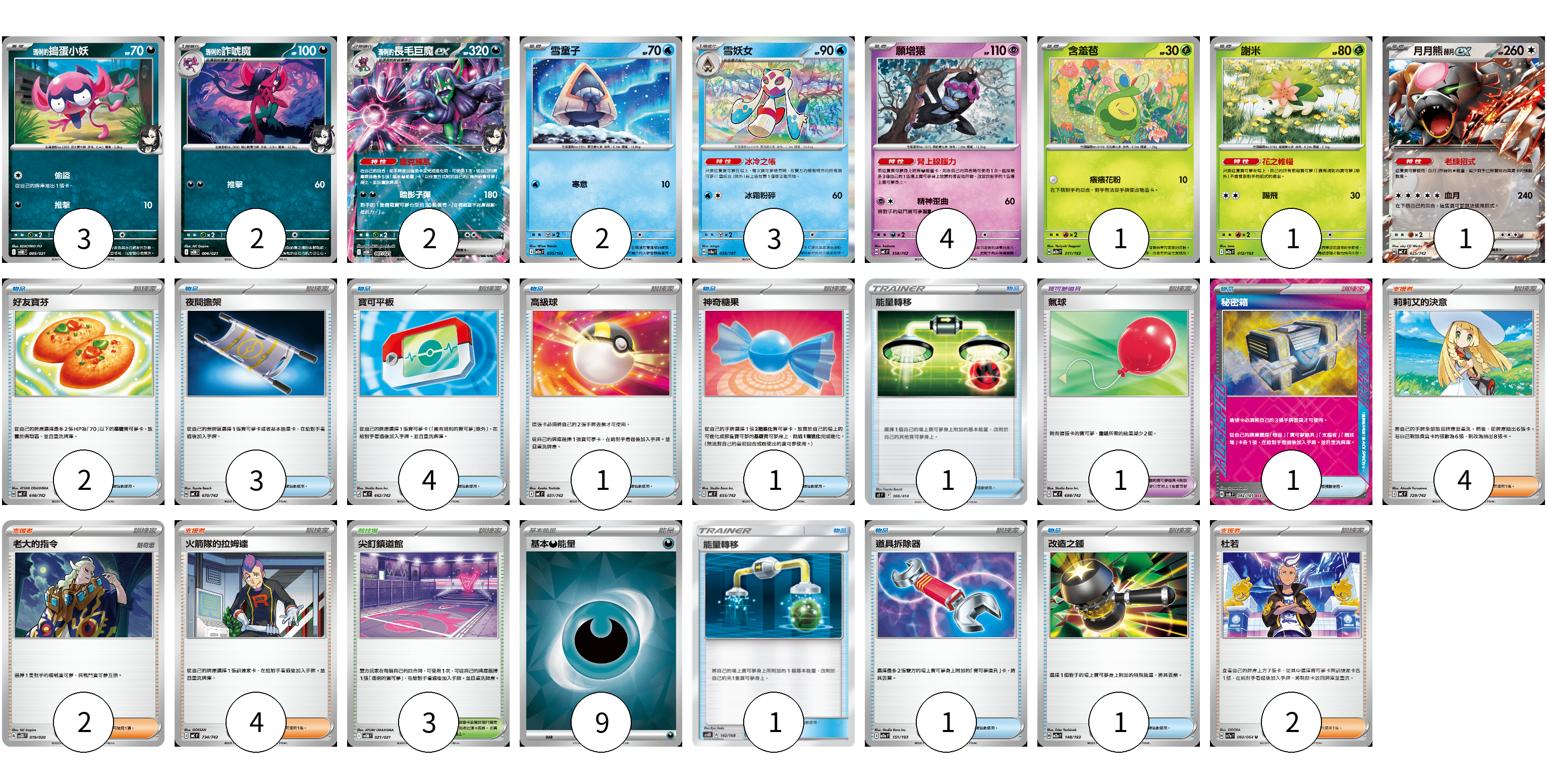 牌組構築方案 以此牌組為基礎新構築牌組 顯示卡面 顯示列表 寶可夢卡(19) 3 2 2 2 3 4 1 1 1 寶可夢道具(1) 1 物品卡(16) 2 3 4 1 1 1 1 1 1 1 支援者卡(12) 4 2 4 2 競技場卡(3) 3 能量卡(9) 9 寶可夢卡(19) 卡牌名稱 張數 卡牌名稱 張數 <瑪俐的>搗蛋小妖 SVOM 005/021 03 <瑪俐的>詐唬魔 SVOM 006/021 02 <瑪俐的>長毛巨魔ex SVOM 007/021 02 雪童子 M2a 035/193 02 雪妖女 SV8a 038/187 03 願增猿 MC 358/742 04 含羞苞 M2a 011/193 01 謝米 M2a 012/193 01 月月熊 赫月 ex MC 625/742 01 寶可夢道具(1) 卡牌名稱 張數 卡牌名稱 張數 氣球 MC 688/742 01 物品卡(16) 卡牌名稱 張數 卡牌名稱 張數 好友寶芬 MC 648/742 02 夜間擔架 MC 670/742 03 寶可平板 MC 662/742 04 高級球 MC 651/742 01 神奇糖果 MC 655/742 01 能量轉移 SI 366/414 01 秘密箱 SV6 092/101 01 能量轉移 AS6D 142/168 01 道具拆除器 M2a 151/193 01 改造之錘 M2a 148/193 01 支援者卡(12) 卡牌名稱 張數 卡牌名稱 張數 莉莉艾的決意 MC 729/742 04 老大的指令 SVOD 019/020 02 火箭隊的拉姆達 MC 734/742 04 杜若 SV7a 060/064 02 競技場卡(3) 卡牌名稱 張數 卡牌名稱 張數 尖釘鎮道館 SVOM 021/021 03 能量卡(9) 卡牌名稱 張數 卡牌名稱 張數 基本【惡】能量 SVOM DAR 09 以此牌組為基礎新構築牌組 牌組編碼 bhiZRe-UtuNBN-ftpFTF copy 列印牌組單 牌組編碼已複製 分享至SNS