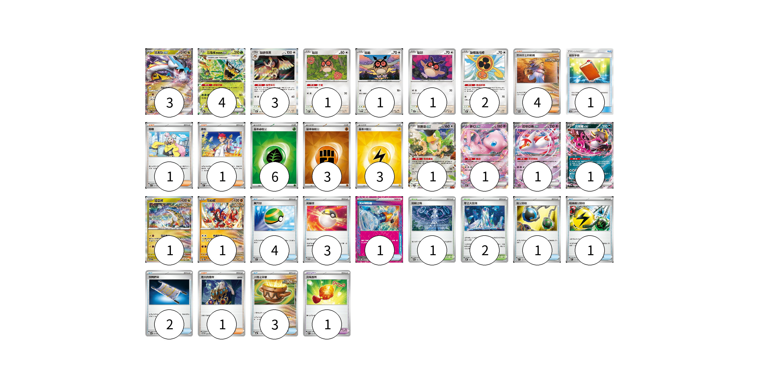 牌組構築方案 以此牌組為基礎新構築牌組 顯示卡面 顯示列表 寶可夢卡(21) 3 4 3 1 1 1 2 1 1 1 1 1 1 寶可夢道具(1) 1 物品卡(16) 1 4 3 1 1 1 2 3 支援者卡(7) 4 1 1 1 競技場卡(3) 1 2 能量卡(12) 6 3 3 寶可夢卡(21) 卡牌名稱 張數 卡牌名稱 張數 猛雷鼓ex SV5K 053/071 03 厄鬼椪 碧草面具ex SV8a 020/187 04 貓頭夜鷹 SV8a 128/187 03 咕咕 SV8a 127/187 01 咕咕 SV7 076/102 01 咕咕 SV5K 054/071 01 旋轉洛托姆 SV8a 131/187 02 怒鸚哥ex SV2P 065/071 01 夢幻ex SV2a 151/165 01 拉帝亞斯ex SV7a 019/064 01 吉雉雞ex SV6a 038/064 01 猛雷鼓 SV7 075/102 01 故勒頓 SV8 069/106 01 寶可夢道具(1) 卡牌名稱 張數 卡牌名稱 張數 勇氣護符 SV2D 067/071 01 物品卡(16) 卡牌名稱 張數 卡牌名稱 張數 朋友手冊 AC2D 145/176 01 巢穴球 SVK 016/042 04 高級球 SVTG 013/019 03 頂尖捕捉器 SV5M 062/071 01 能量回收 SVM 125/175 01 超級能量回收 SVK 010/042 01 夜間擔架 SV6a 056/064 02 大地之容器 SVHK 011/022 03 支援者卡(7) 卡牌名稱 張數 卡牌名稱 張數 奧琳博士的氣魄 SV8a 167/187 04 奇樹 SVK 031/042 01 赤松 SVK 027/042 01 老大的指令 SVTM 020/022 01 競技場卡(3) 卡牌名稱 張數 卡牌名稱 張數 阻礙之塔 SV8a 181/187 01 零之大空洞 SV8a 182/187 02 能量卡(12) 卡牌名稱 張數 卡牌名稱 張數 基本【草】能量 SVM GRA 06 基本【鬥】能量 SVM FIG 03 基本【雷】能量 SVM LIG 03 以此牌組為基礎新構築牌組 牌組編碼 biwOya-yXDzil-YPeKAP copy 列印牌組單 牌組編碼已複製 分享至SNS
