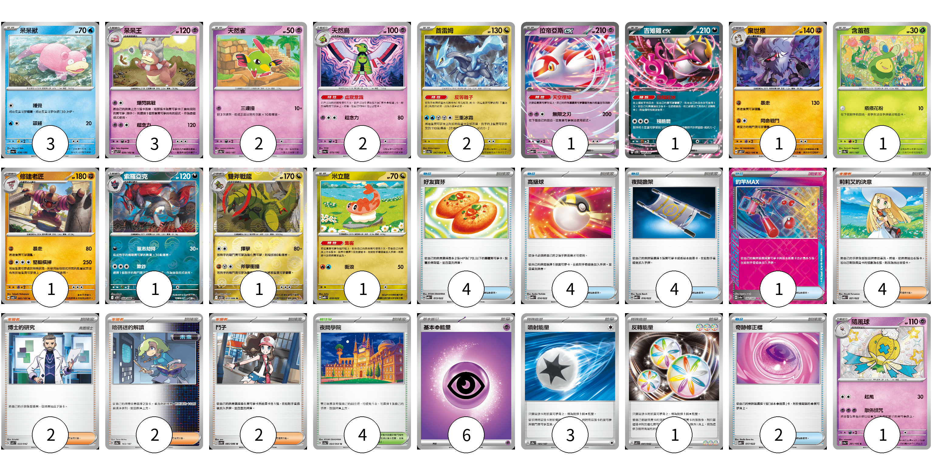 牌組構築方案 以此牌組為基礎新構築牌組 顯示卡面 顯示列表 寶可夢卡(21) 3 3 2 2 2 1 1 1 1 1 1 1 1 1 物品卡(15) 4 4 4 1 2 支援者卡(10) 4 2 2 2 競技場卡(4) 4 能量卡(10) 6 3 1 寶可夢卡(21) 卡牌名稱 張數 卡牌名稱 張數 呆呆獸 SV4a 036/190 03 呆呆王 SV7 039/102 03 天然雀 SV8a 060/187 02 天然鳥 SV4a 079/190 02 酋雷姆 SV6a 047/064 02 拉帝亞斯ex MBD 003/022 01 吉雉雞ex SVOD 004/020 01 棄世猴 SV8 062/106 01 含羞苞 SV8a 001/187 01 修建老匠 SV6 061/101 01 索羅亞克 SV11W 059/086 01 雙斧戰龍 SV11B 072/086 01 米立龍 MBD 010/022 01 隨風球 SV4a 261/190 01 物品卡(15) 卡牌名稱 張數 卡牌名稱 張數 好友寶芬 MBD 013/022 04 高級球 MBD 014/022 04 夜間擔架 MBD 016/022 04 釣竿MAX SV8a 142/187 01 奇跡修正檔 MBD 017/022 02 支援者卡(10) 卡牌名稱 張數 卡牌名稱 張數 莉莉艾的決意 MBD 021/022 04 博士的研究 SVK 033/042 02 暗碼迷的解讀 SV8a 165/187 02 鬥子 SV11W 085/086 02 競技場卡(4) 卡牌名稱 張數 卡牌名稱 張數 夜間學院 SV6a 064/064 04 能量卡(10) 卡牌名稱 張數 卡牌名稱 張數 基本【超】能量 MBD PSY 06 噴射能量 SV8a 185/187 03 反轉能量 SVK 041/042 01 以此牌組為基礎新構築牌組 牌組編碼 bizSOY-bXaRNv-ATftgg copy 列印牌組單 牌組編碼已複製 分享至SNS