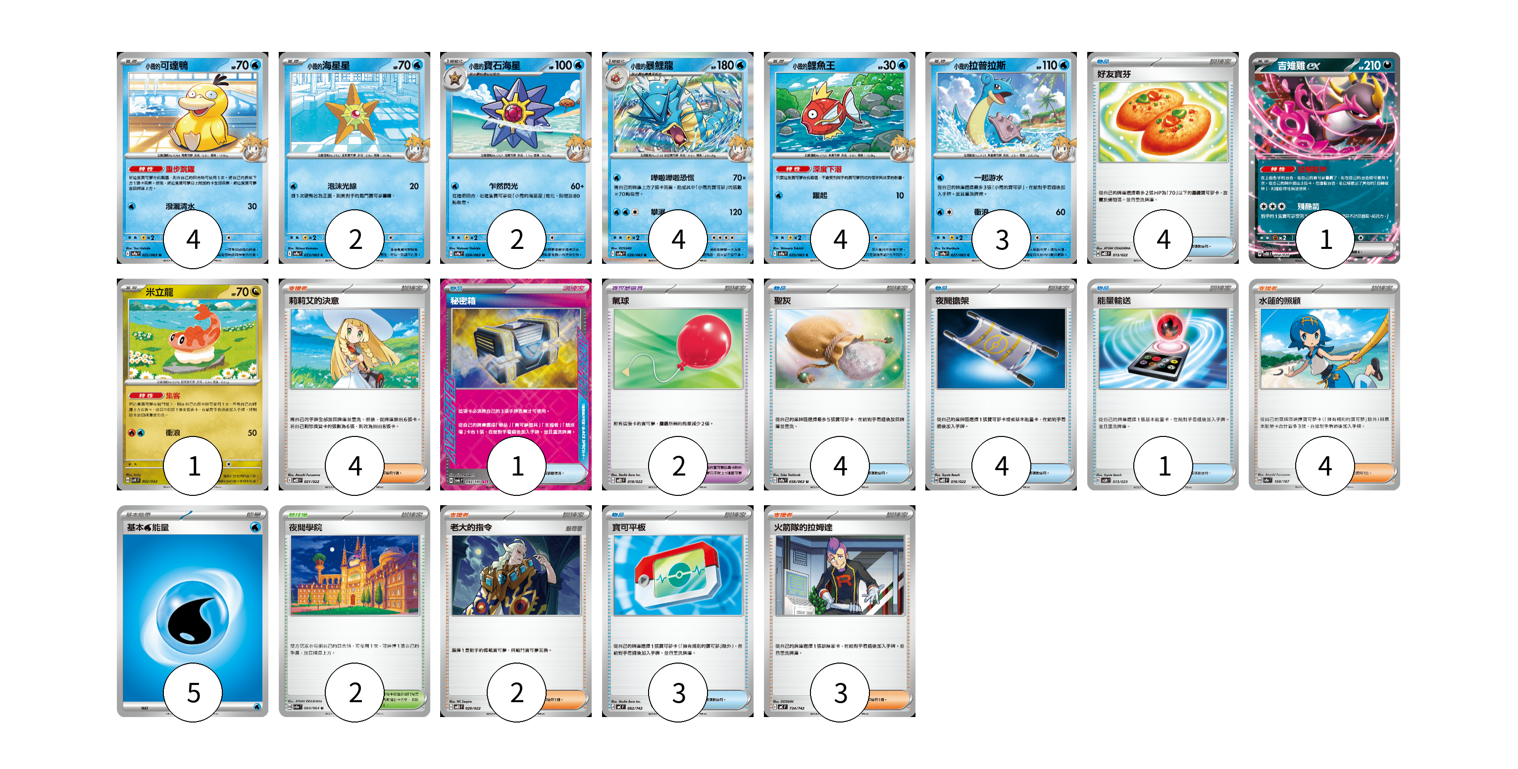 牌組構築方案 以此牌組為基礎新構築牌組 顯示卡面 顯示列表 寶可夢卡(21) 4 2 2 4 4 3 1 1 寶可夢道具(2) 2 物品卡(17) 4 1 4 4 1 3 支援者卡(13) 4 4 2 3 競技場卡(2) 2 能量卡(5) 5 寶可夢卡(21) 卡牌名稱 張數 卡牌名稱 張數 <小霞的>可達鴨 SV9a 022/063 04 <小霞的>海星星 SV9a 023/063 02 <小霞的>寶石海星 SV9a 024/063 02 <小霞的>暴鯉龍 SV9a 026/063 04 <小霞的>鯉魚王 SV9a 025/063 04 <小霞的>拉普拉斯 SV9a 027/063 03 吉雉雞ex SVOD 004/020 01 米立龍 SVK 002/042 01 寶可夢道具(2) 卡牌名稱 張數 卡牌名稱 張數 氣球 MBD 018/022 02 物品卡(17) 卡牌名稱 張數 卡牌名稱 張數 好友寶芬 MBD 013/022 04 秘密箱 SV6 092/101 01 聖灰 SV9a 056/063 04 夜間擔架 MBD 016/022 04 能量輸送 SVAM 013/023 01 寶可平板 MC 662/742 03 支援者卡(13) 卡牌名稱 張數 卡牌名稱 張數 莉莉艾的決意 MBD 021/022 04 水蓮的照顧 SV8a 168/187 04 老大的指令 MBD 020/022 02 火箭隊的拉姆達 MC 734/742 03 競技場卡(2) 卡牌名稱 張數 卡牌名稱 張數 夜間學院 SV6a 064/064 02 能量卡(5) 卡牌名稱 張數 卡牌名稱 張數 基本水能量 sv-p WAT 05 以此牌組為基礎新構築牌組 牌組編碼 blBmVS-FGMbDA-ZtQQgg copy 列印牌組單 牌組編碼已複製 分享至SNS