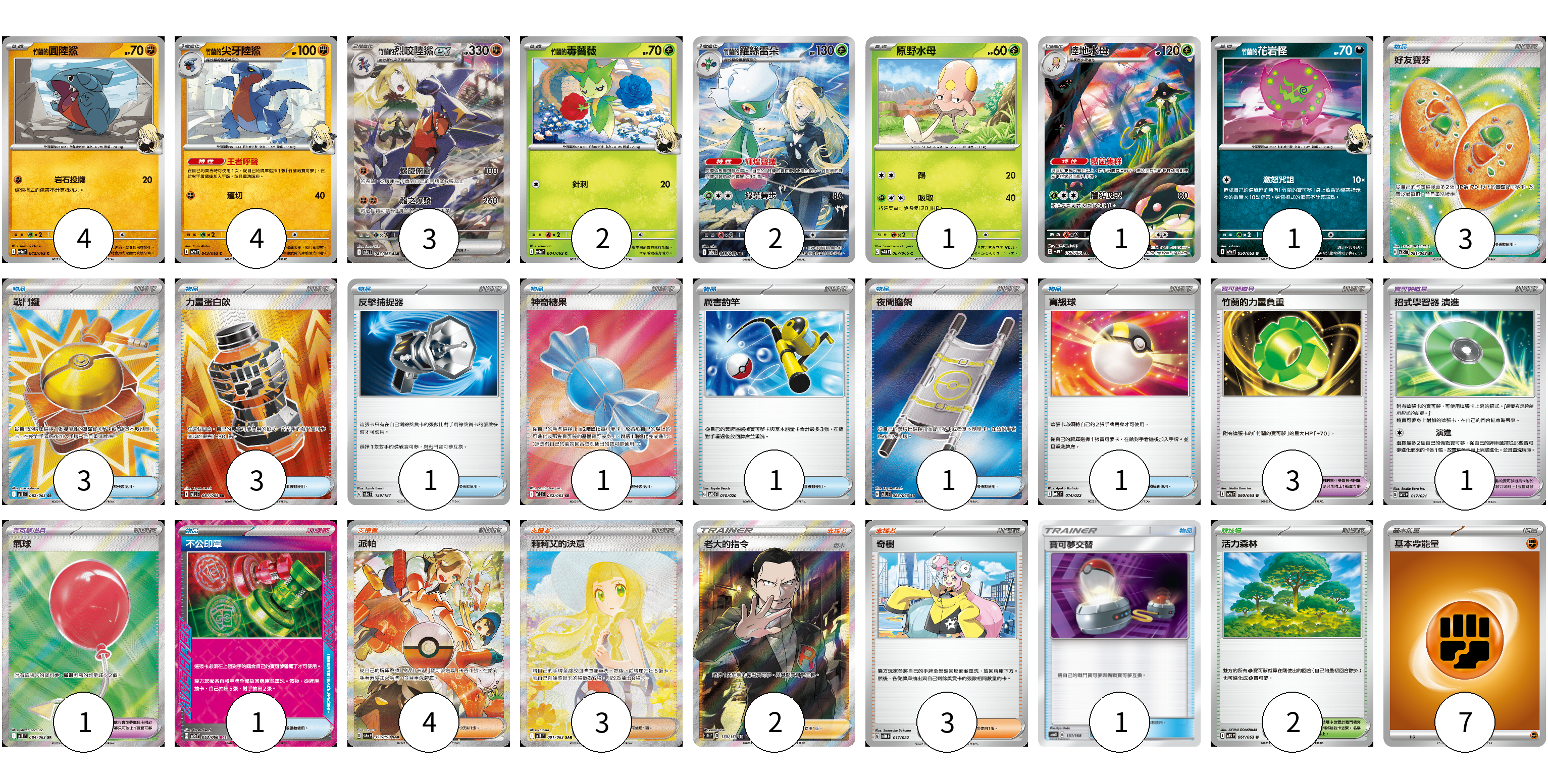 牌組構築方案 以此牌組為基礎新構築牌組 顯示卡面 顯示列表 寶可夢卡(18) 4 4 3 2 2 1 1 1 寶可夢道具(5) 3 1 1 物品卡(16) 3 3 3 1 1 1 1 1 1 1 支援者卡(12) 4 3 2 3 競技場卡(2) 2 能量卡(7) 7 寶可夢卡(18) 卡牌名稱 張數 卡牌名稱 張數 <竹蘭的>圓陸鯊 SV9a 042/063 04 <竹蘭的>尖牙陸鯊 SV9a 043/063 04 <竹蘭的>烈咬陸鯊ex SV9a 087/063 03 <竹蘭的>毒薔薇 SV9a 004/063 02 <竹蘭的>羅絲雷朵 SV9a 065/063 02 原野水母 SV4M 007/066 01 陸地水母 SV4M 068/066 01 <竹蘭的>花岩怪 SV9a 050/063 01 寶可夢道具(5) 卡牌名稱 張數 卡牌名稱 張數 竹蘭的力量負重 SV9a 060/063 03 招式學習器 演進 SVTL 017/021 01 氣球 M1L 084/063 01 物品卡(16) 卡牌名稱 張數 卡牌名稱 張數 好友寶芬 M1S 081/063 03 戰鬥鑼 M1L 082/063 03 力量蛋白飲 M1L 081/063 03 反擊捕捉器 SV8a 139/187 01 神奇糖果 M1S 082/063 01 厲害釣竿 SVOD 010/020 01 夜間擔架 M1L 083/063 01 高級球 MBD 014/022 01 不公印章 SV5a 053/066 01 寶可夢交替 AS6D 151/168 01 支援者卡(12) 卡牌名稱 張數 卡牌名稱 張數 派帕 SV4a 353/190 04 莉莉艾的決意 M1L 091/063 03 老大的指令(坂木) SC1b 170/153 02 奇樹 SVTM 017/022 03 競技場卡(2) 卡牌名稱 張數 卡牌名稱 張數 活力森林 M1S 061/063 02 能量卡(7) 卡牌名稱 張數 卡牌名稱 張數 基本鬥能量 sv-p FIG 07 以此牌組為基礎新構築牌組 牌組編碼 blYFhZ-EqMCIk-MrEomH copy 列印牌組單 牌組編碼已複製 分享至SNS