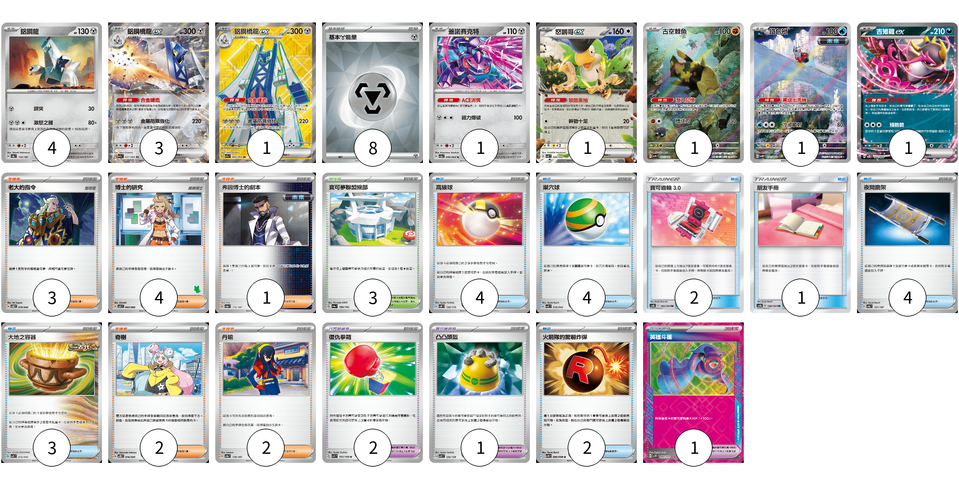 牌組構築方案 以此牌組為基礎新構築牌組 顯示卡面 顯示列表 寶可夢卡(13) 4 3 1 1 1 1 1 1 寶可夢道具(4) 2 1 1 物品卡(20) 4 4 2 1 4 3 2 支援者卡(12) 3 4 1 2 2 競技場卡(3) 3 能量卡(8) 8 寶可夢卡(13) 卡牌名稱 張數 卡牌名稱 張數 鋁鋼龍 SV8a 112/187 04 鋁鋼橋龍ex SV7a 037/064 03 鋁鋼橋龍ex SV7a 080/064 01 蓋諾賽克特 SV6a 040/064 01 怒鸚哥ex SVK 006/042 01 古空棘魚 SV5K 077/071 01 鐵包袱 SV4M 071/066 01 吉雉雞ex SVOD 004/020 01 寶可夢道具(4) 卡牌名稱 張數 卡牌名稱 張數 復仇拳箱 SV3 102/108 02 凸凸頭盔 SVD 126/139 01 英雄斗篷 SV5M 064/071 01 物品卡(20) 卡牌名稱 張數 卡牌名稱 張數 高級球 SVM 134/175 04 巢穴球 SVK 016/042 04 寶可齒輪3.0 AS6b 190/194 02 朋友手冊 AS6b 188/194 01 夜間擔架 SV8a 151/187 04 大地之容器 SVK 012/042 03 火箭隊的驚嚇炸彈 SV10 089/098 02 支援者卡(12) 卡牌名稱 張數 卡牌名稱 張數 老大的指令 SVOD 019/020 03 博士的研究 SVI 063/066 04 弗圖博士的劇本 SV8a 175/187 01 奇樹 SVOD 016/020 02 丹瑜 SV8a 170/187 02 競技場卡(3) 卡牌名稱 張數 卡牌名稱 張數 寶可夢聯盟總部 SV4a 186/190 03 能量卡(8) 卡牌名稱 張數 卡牌名稱 張數 基本【鋼】能量 SVOD MET 08 以此牌組為基礎新構築牌組 牌組編碼 bmMxAg-guAjux-WoBPAv copy 列印牌組單 牌組編碼已複製 分享至SNS