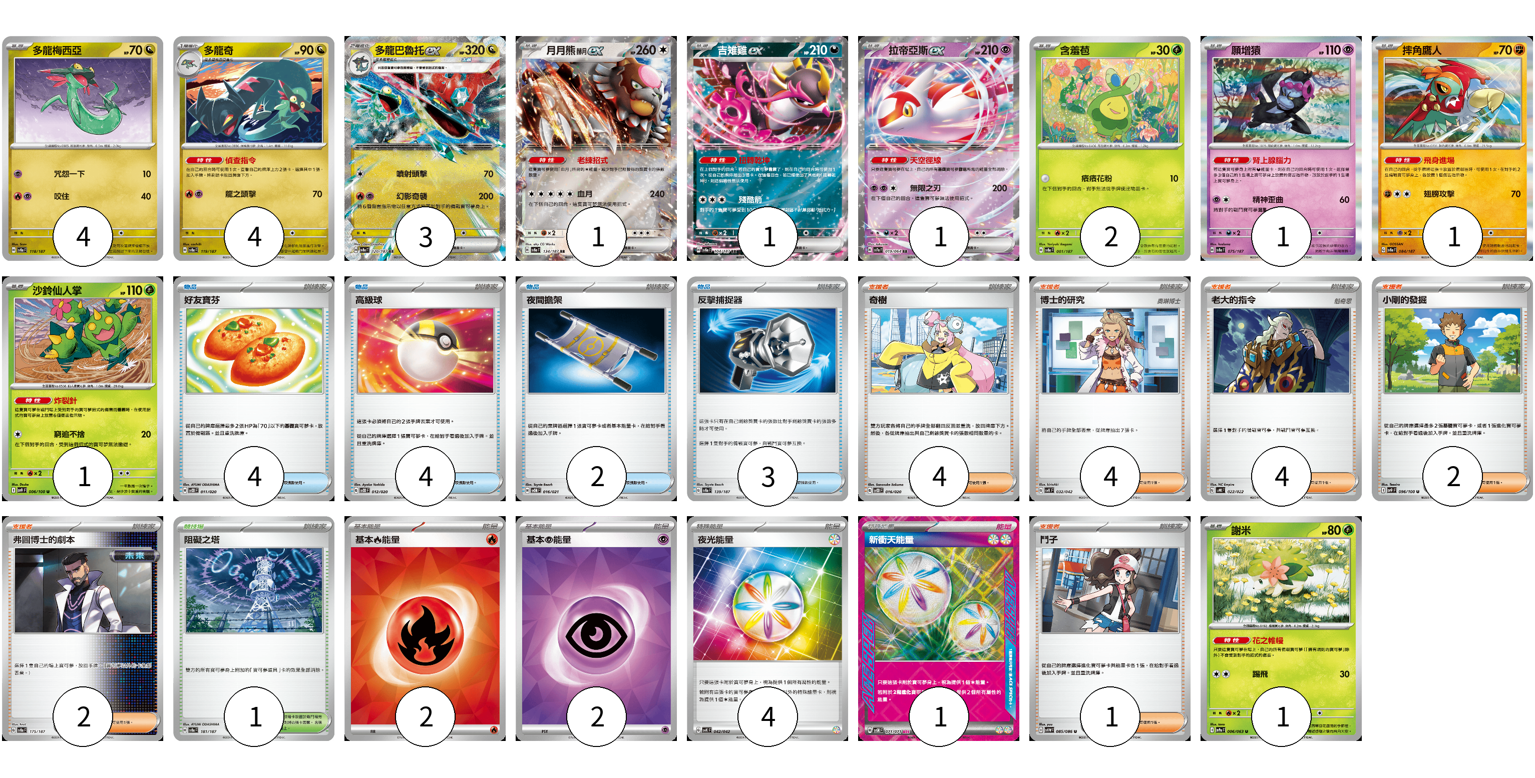 牌組構築方案 以此牌組為基礎新構築牌組 顯示卡面 顯示列表 寶可夢卡(20) 4 4 3 1 1 1 2 1 1 1 1 物品卡(13) 4 4 2 3 支援者卡(17) 4 4 4 2 2 1 競技場卡(1) 1 能量卡(9) 2 2 4 1 寶可夢卡(20) 卡牌名稱 張數 卡牌名稱 張數 多龍梅西亞 SV8a 118/187 04 多龍奇 SV8a 119/187 04 多龍巴魯托ex SV8a 120/187 03 月月熊 赫月ex SV8a 134/187 01 吉雉雞ex SV8a 104/187 01 拉帝亞斯ex SV7a 019/064 01 含羞苞 SV8a 001/187 02 願增猿 SV8a 075/187 01 摔角鷹人 SV8a 084/187 01 沙鈴仙人掌 SV9 006/100 01 謝米 SV9a 006/063 01 物品卡(13) 卡牌名稱 張數 卡牌名稱 張數 好友寶芬 SVOD 011/020 04 高級球 SVOD 012/020 04 夜間擔架 SVOM 016/021 02 反擊捕捉器 SV8a 139/187 03 支援者卡(17) 卡牌名稱 張數 卡牌名稱 張數 奇樹 SVOD 016/020 04 博士的研究 SVK 032/042 04 老大的指令 SVHK 022/022 04 小剛的發掘 SV9 096/100 02 弗圖博士的劇本 SV8a 175/187 02 鬥子 SV11W 085/086 01 競技場卡(1) 卡牌名稱 張數 卡牌名稱 張數 阻礙之塔 SV8a 181/187 01 能量卡(9) 卡牌名稱 張數 卡牌名稱 張數 基本【火】能量 SVM FIR 02 基本【超】能量 SVM PSY 02 夜光能量 SVK 042/042 04 新衝天能量 SV5K 071/071 01 以此牌組為基礎新構築牌組 牌組編碼 bngIUx-dCJBvf-NtKwTE copy 列印牌組單 牌組編碼已複製 分享至SNS
