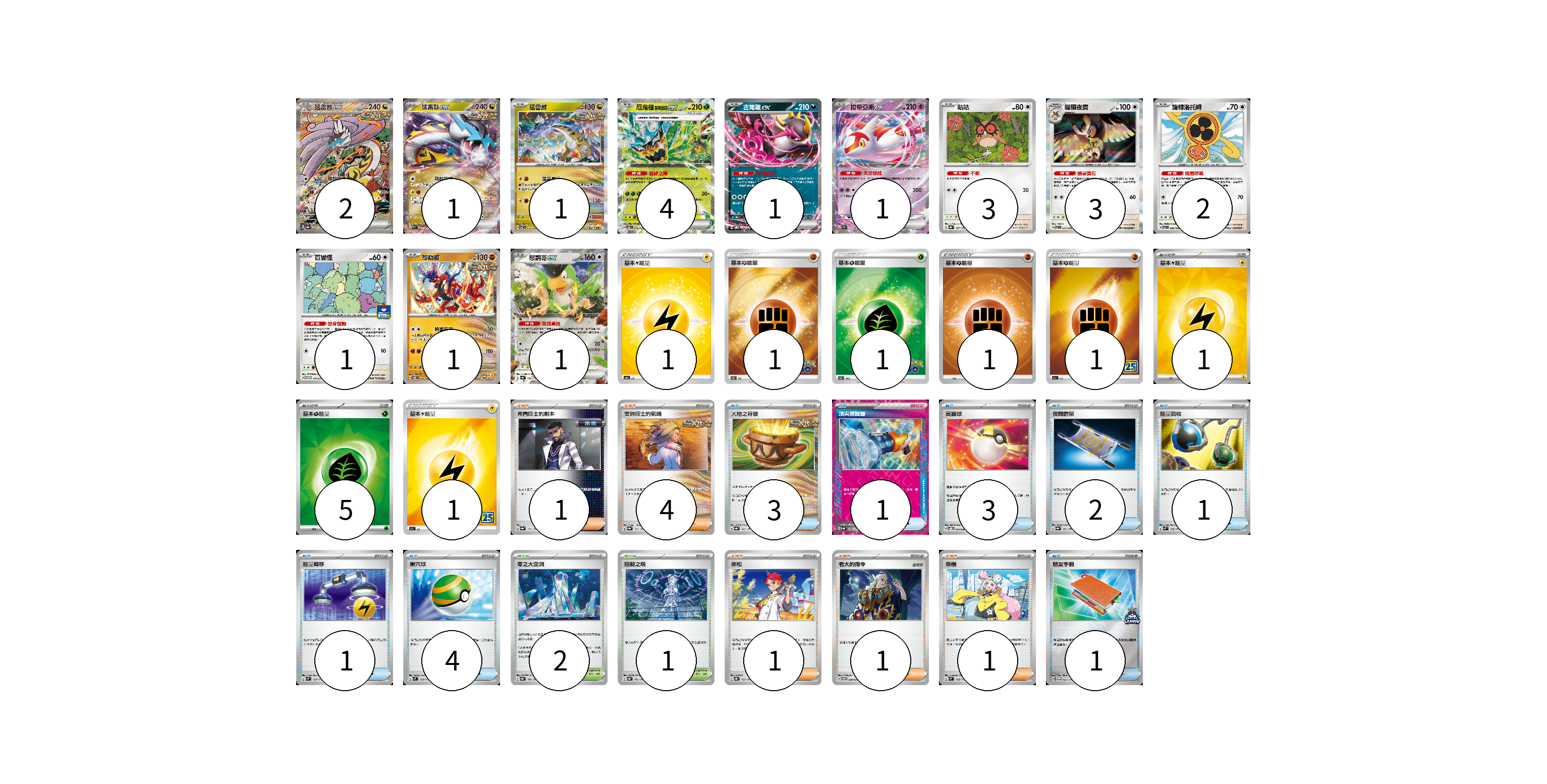 牌組構築方案 以此牌組為基礎新構築牌組 顯示卡面 顯示列表 寶可夢卡(21) 2 1 1 4 1 1 3 3 2 1 1 1 物品卡(16) 3 1 3 2 1 1 4 1 支援者卡(8) 1 4 1 1 1 競技場卡(3) 2 1 能量卡(12) 1 1 1 1 1 1 5 1 寶可夢卡(21) 卡牌名稱 張數 卡牌名稱 張數 猛雷鼓ex SV8a 222/187 02 猛雷鼓ex SV5K 053/071 01 猛雷鼓 SV7 075/102 01 厄鬼椪 碧草面具ex SV6 016/101 04 吉雉雞ex SVOM 009/021 01 拉帝亞斯ex SV7a 019/064 01 咕咕 SV8a 127/187 03 貓頭夜鷹 SV7 077/102 03 旋轉洛托姆 SV7 080/102 02 百變怪 SV-P 111/SV-P 01 故勒頓 SV8 069/106 01 怒鸚哥ex SV4a 154/190 01 物品卡(16) 卡牌名稱 張數 卡牌名稱 張數 大地之容器 SV8a 143/187 03 頂尖捕捉器 SV8a 148/187 01 高級球 SVOD 012/020 03 夜間擔架 SV8a 151/187 02 能量回收 SVM 125/175 01 能量轉移 SVM 127/175 01 巢穴球 SVM 133/175 04 朋友手冊 SV-P 182/SV-P 01 支援者卡(8) 卡牌名稱 張數 卡牌名稱 張數 弗圖博士的劇本 SV8a 175/187 01 奧琳博士的氣魄 SV8a 167/187 04 赤松 SV8a 163/187 01 老大的指令 SVTM 020/022 01 奇樹 SVM 160/175 01 競技場卡(3) 卡牌名稱 張數 卡牌名稱 張數 零之大空洞 SV8a 182/187 02 阻礙之塔 SV8a 181/187 01 能量卡(12) 卡牌名稱 張數 卡牌名稱 張數 基本雷能量 SN LIG 01 基本鬥能量 S10b FIG 01 基本草能量 S10b GRA 01 基本【鬥】能量 SI FIG 01 基本鬥能量 S8a FIG 01 基本【雷】能量 SVM LIG 01 基本【草】能量 SVM GRA 05 基本雷能量 S8a LIG 01 以此牌組為基礎新構築牌組 牌組編碼 boBFFt-yqWnEM-LCLtSj copy 列印牌組單 牌組編碼已複製 分享至SNS