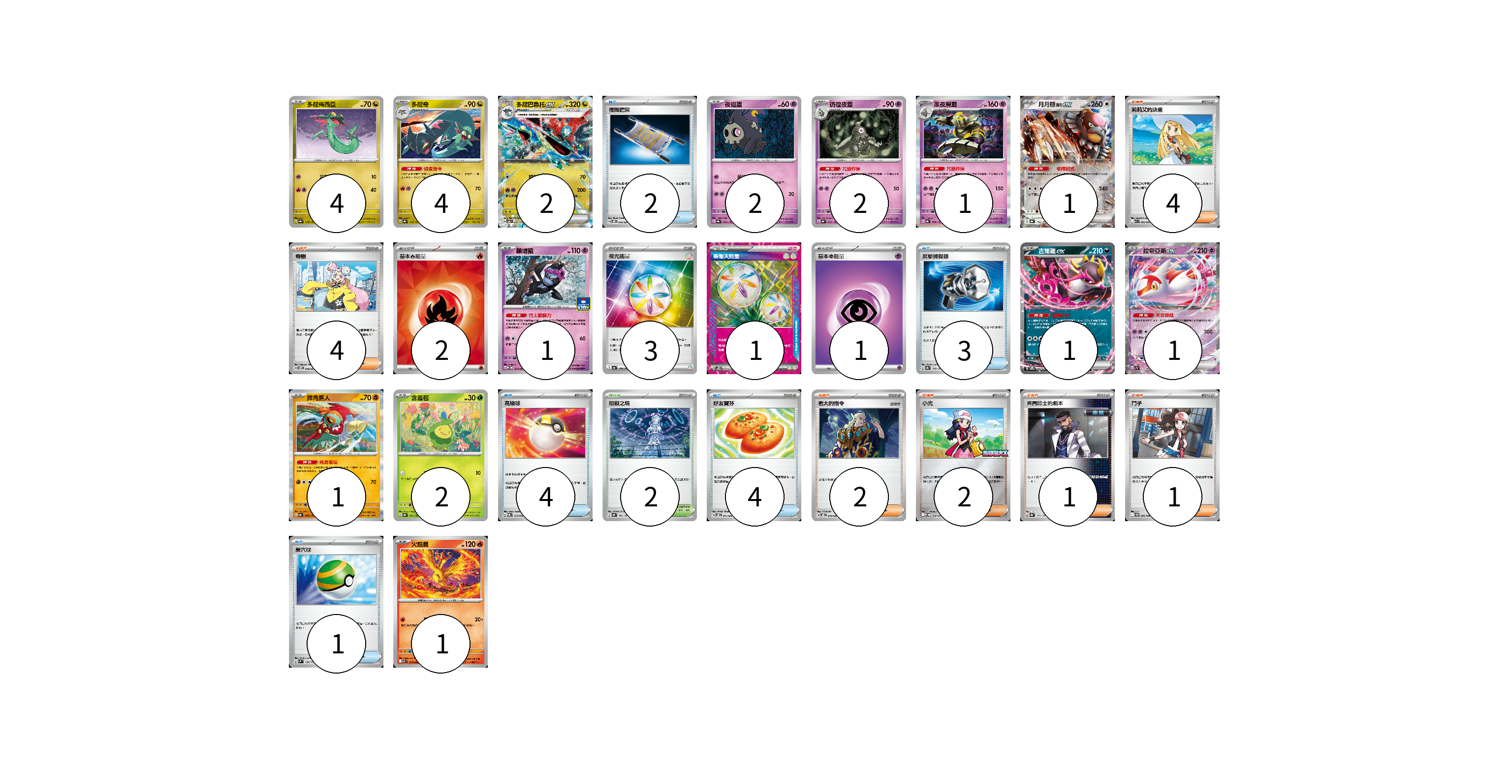 牌組構築方案 以此牌組為基礎新構築牌組 顯示卡面 顯示列表 寶可夢卡(23) 4 4 2 2 2 1 1 1 1 1 1 2 1 物品卡(14) 2 3 4 4 1 支援者卡(14) 4 4 2 2 1 1 競技場卡(2) 2 能量卡(7) 2 3 1 1 寶可夢卡(23) 卡牌名稱 張數 卡牌名稱 張數 多龍梅西亞 SV8a 118/187 04 多龍奇 SV8a 119/187 04 多龍巴魯托ex SV6 081/101 02 夜巡靈 SV8a 064/187 02 彷徨夜靈 SV8a 065/187 02 黑夜魔靈 SV8a 066/187 01 月月熊 赫月ex SV8a 134/187 01 願增猿 M-P 014/M-P 01 吉雉雞ex SVOM 009/021 01 拉帝亞斯ex SV7a 019/064 01 摔角鷹人 SV8a 084/187 01 含羞苞 SV8a 001/187 02 火焰鳥 M2 014/080 01 物品卡(14) 卡牌名稱 張數 卡牌名稱 張數 夜間擔架 SVOM 016/021 02 反擊捕捉器 SV8a 139/187 03 高級球 SVQL 015/022 04 好友寶芬 SVOD 011/020 04 巢穴球 SVM 133/175 01 支援者卡(14) 卡牌名稱 張數 卡牌名稱 張數 莉莉艾的決意 M1L 062/063 04 奇樹 SVOM 018/021 04 老大的指令 SVOD 019/020 02 小光 M-P 028/M-P 02 弗圖博士的劇本 SV8a 175/187 01 鬥子 SV11W 085/086 01 競技場卡(2) 卡牌名稱 張數 卡牌名稱 張數 阻礙之塔 SV8a 181/187 02 能量卡(7) 卡牌名稱 張數 卡牌名稱 張數 基本【火】能量 SVQL FIR 02 夜光能量 SV4a 190/190 03 新衝天能量 SV5K 071/071 01 基本超能量 sv-p PSY 01 以此牌組為基礎新構築牌組 牌組編碼 brMUiQ-jBmjsI-GWhRAn copy 列印牌組單 牌組編碼已複製 分享至SNS