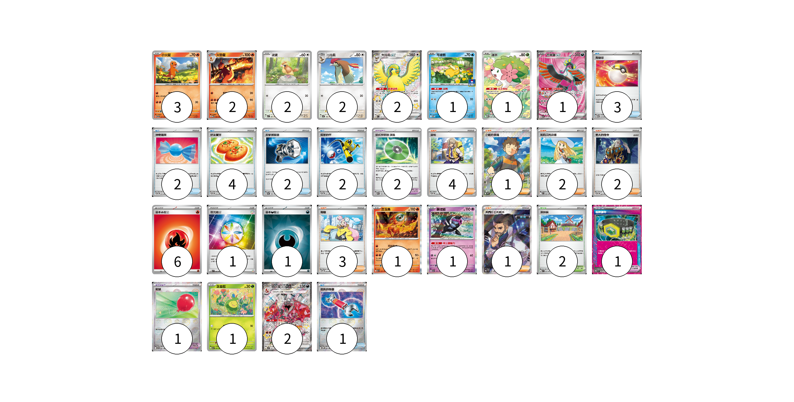 牌組構築方案 以此牌組為基礎新構築牌組 顯示卡面 顯示列表 寶可夢卡(19) 3 2 2 2 2 1 1 1 1 1 1 2 寶可夢道具(4) 2 1 1 物品卡(14) 3 2 4 2 2 1 支援者卡(13) 4 1 2 2 3 1 競技場卡(2) 2 能量卡(8) 6 1 1 寶可夢卡(19) 卡牌名稱 張數 卡牌名稱 張數 小火龍 SVTL 001/021 03 火恐龍 SVQL 002/022 02 波波 SV3 087/108 02 比比鳥 SV4a 138/190 02 大比鳥ex SV4a 335/190 02 可達鴨 SV-P 220/SV-P 01 謝米 SV9a 066/063 01 吉雉雞ex SV6a 081/064 01 古玉魚 SV8a 025/187 01 願增猿 SV8a 075/187 01 含羞苞 SV8a 001/187 01 噴火龍ex SV4a 331/190 02 寶可夢道具(4) 卡牌名稱 張數 卡牌名稱 張數 招式學習器 演進 SV8a 160/187 02 極限腰帶 SV5K 066/071 01 氣球 SV11B 082/086 01 物品卡(14) 卡牌名稱 張數 卡牌名稱 張數 高級球 SVQP 015/023 03 神奇糖果 SVOM 014/021 02 好友寶芬 SVOM 012/021 04 反擊捕捉器 SV8a 139/187 02 厲害釣竿 SVOM 011/021 02 道具拆除器 SV11W 080/086 01 支援者卡(13) 卡牌名稱 張數 卡牌名稱 張數 派帕 SVOD 018/020 04 小剛的發掘 SV9 123/100 01 莉莉艾的決意 M1L 062/063 02 老大的指令 SVOM 020/021 02 奇樹 SVOD 016/020 03 弗圖博士的劇本 SV4M 086/066 01 競技場卡(2) 卡牌名稱 張數 卡牌名稱 張數 深缽鎮 SVK 039/042 02 能量卡(8) 卡牌名稱 張數 卡牌名稱 張數 基本火能量 sv-p FIR 06 夜光能量 SVK 042/042 01 基本【惡】能量 SVOM DAR 01 以此牌組為基礎新構築牌組 牌組編碼 bsBKBB-lentPx-xvNhgw copy 列印牌組單 牌組編碼已複製 分享至SNS